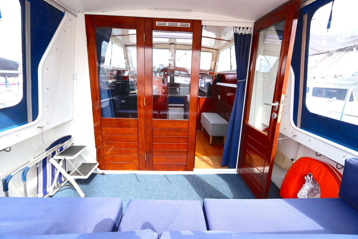 De ruimte open kuip is voorzien van 3 ruime openslaande hardhouten deuren aan achterzijde van het stuurhuis. Alle deuren kunnen terzijde weg gedraaid (ingeklapt) worden.