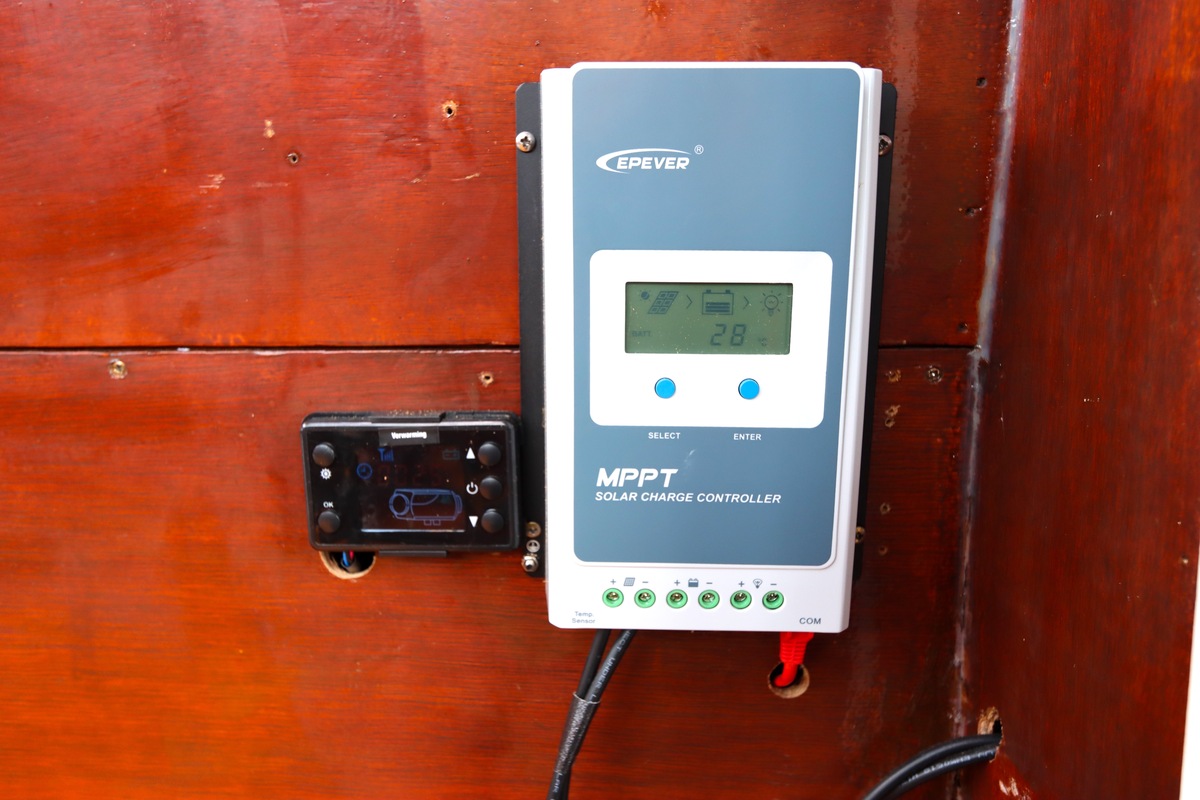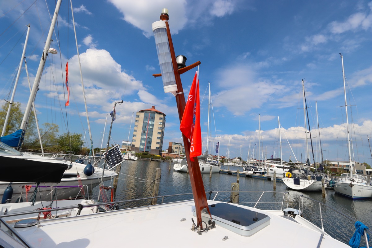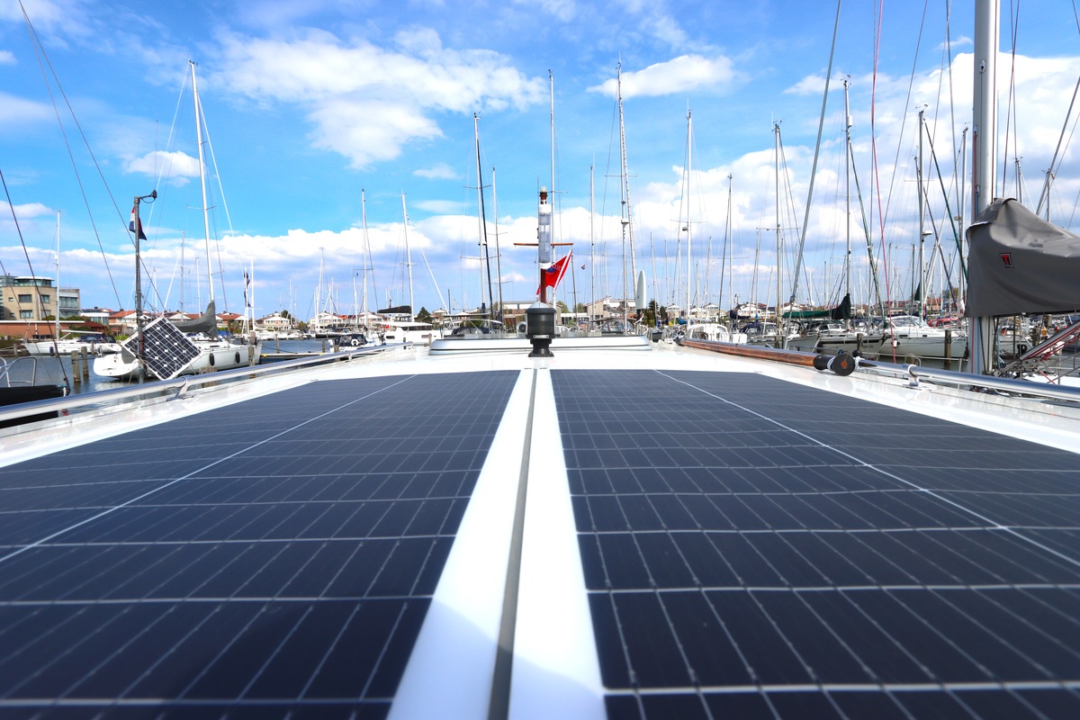 NB het jacht kan normaal functioneren zonder 220 V walstroom dus inclusief de werkende koelkast via de twee grote zonnepanelen etc.