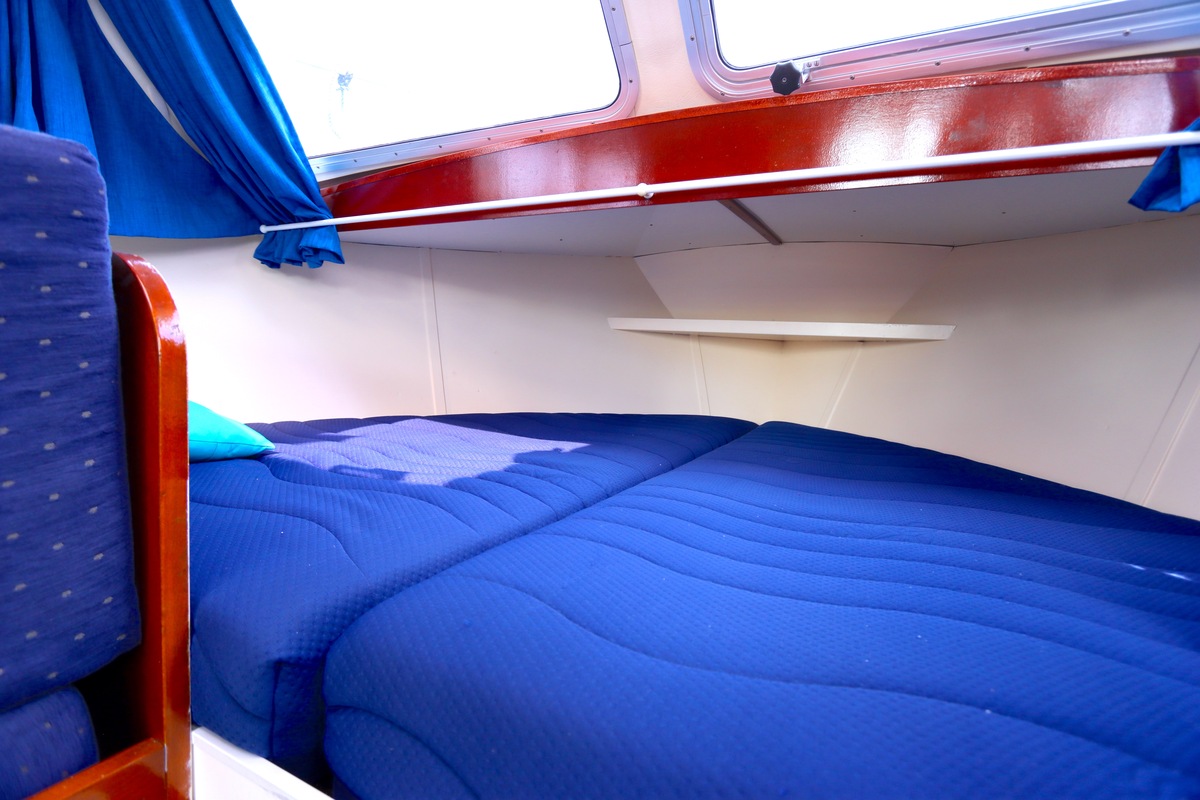 Matrassen, kussens en gordijnen zijn nieuw en blauw conform striping op romp etc.