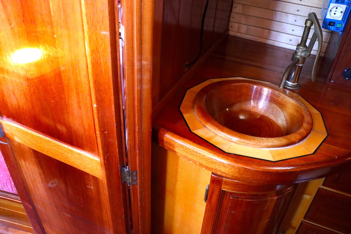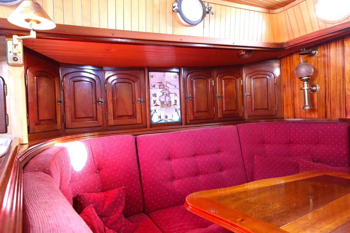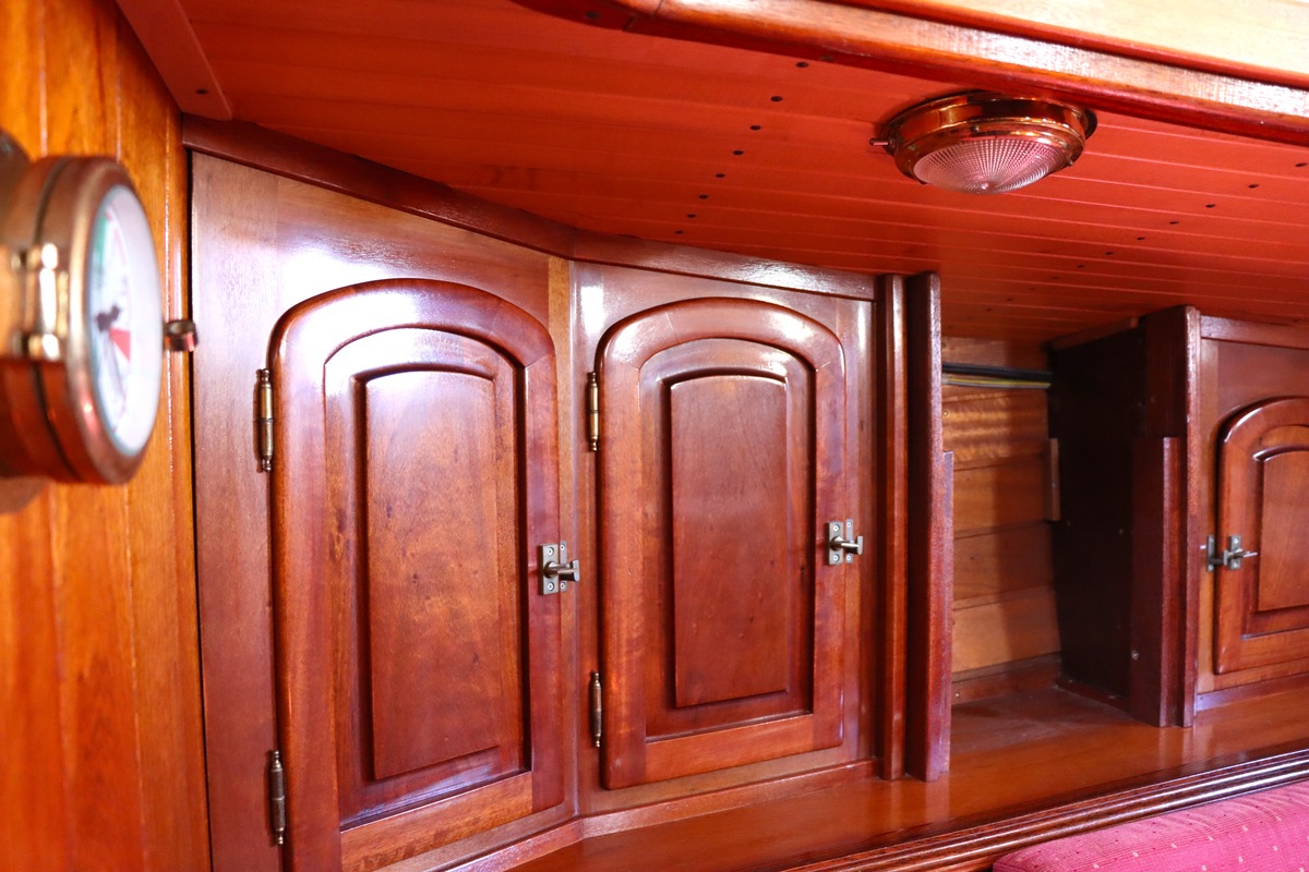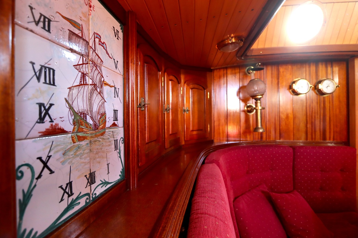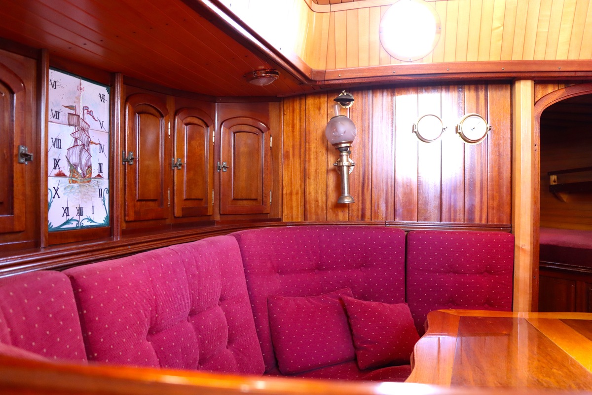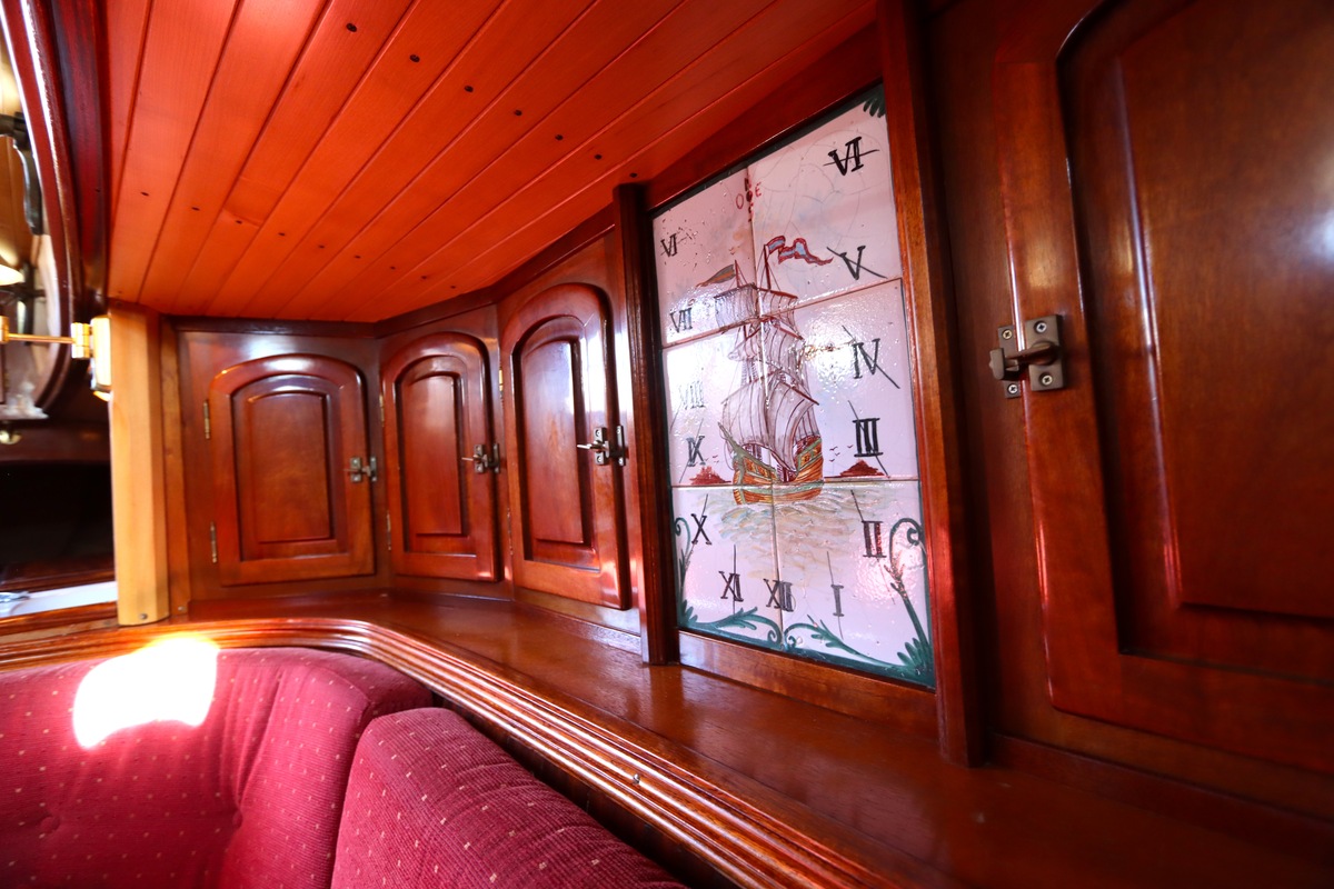 Maar het echte pronkstuk bevindt zich onderdeks. Het interieur is met ongekende precisie en liefde voor detail ingetimmerd. Geen concessies aan tijd of materiaal – en dat zie je in alles. Van de houtverbindingen tot de afwerking alles straalt vakmanschap uit. Het is een schip dat niet alleen gebouwd is om de wereldzeeën te trotseren, maar ook om je thuis te laten voelen zodra je aan boord stapt. Een echte blikvanger, van buiten én van binnen.