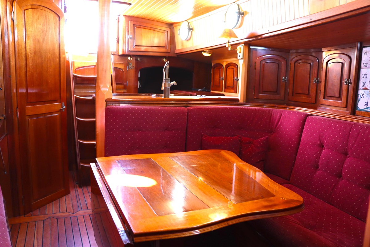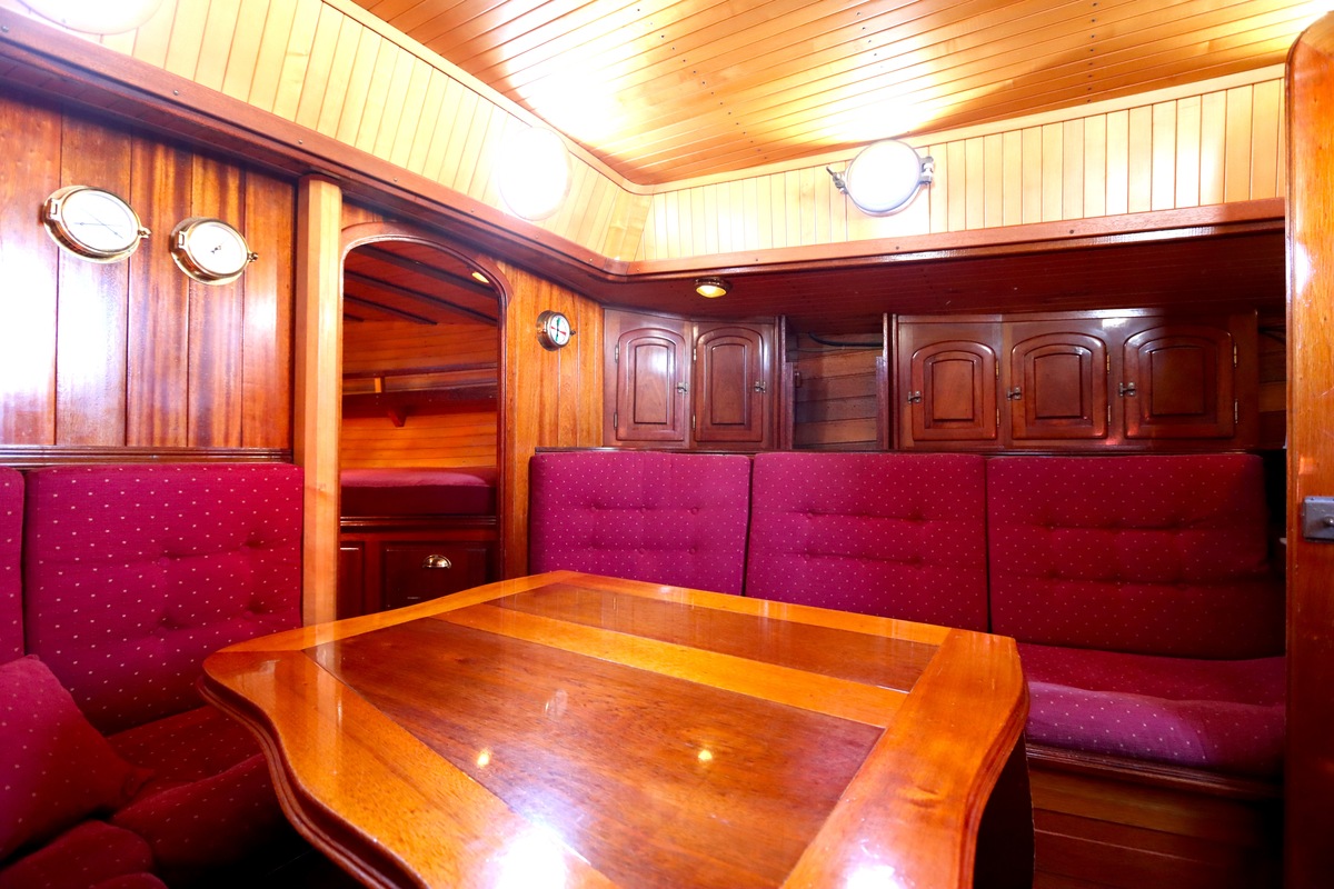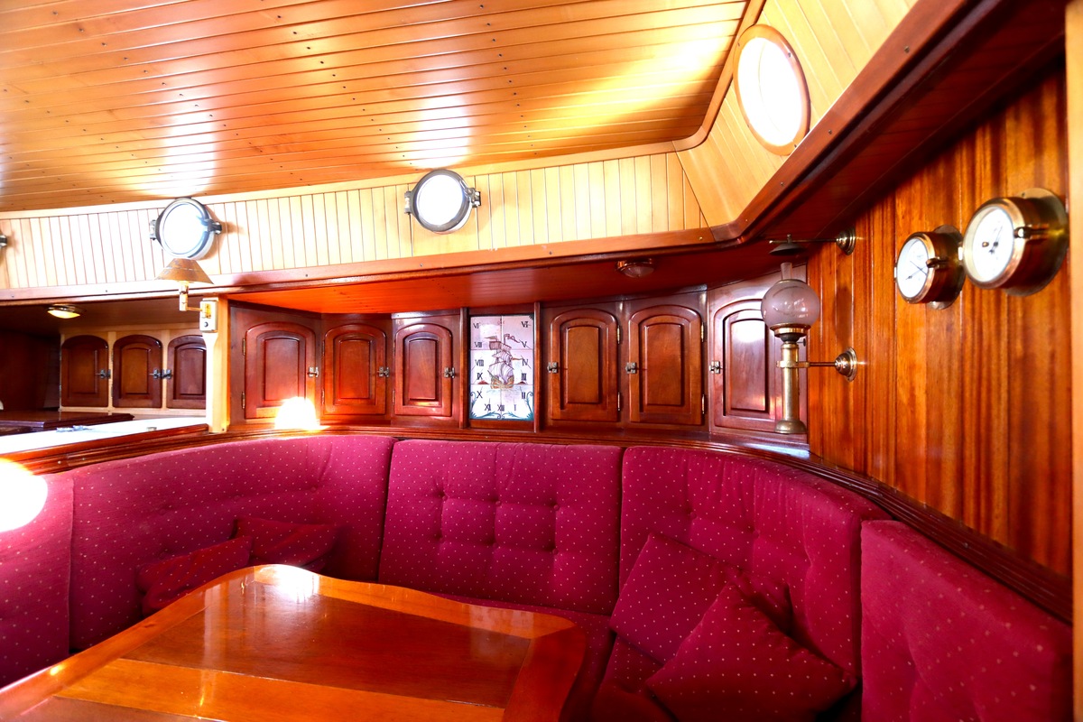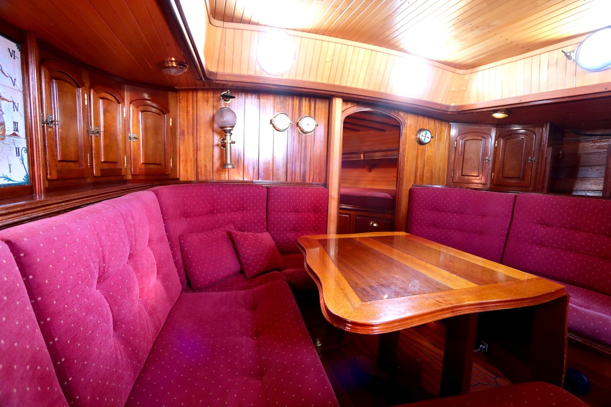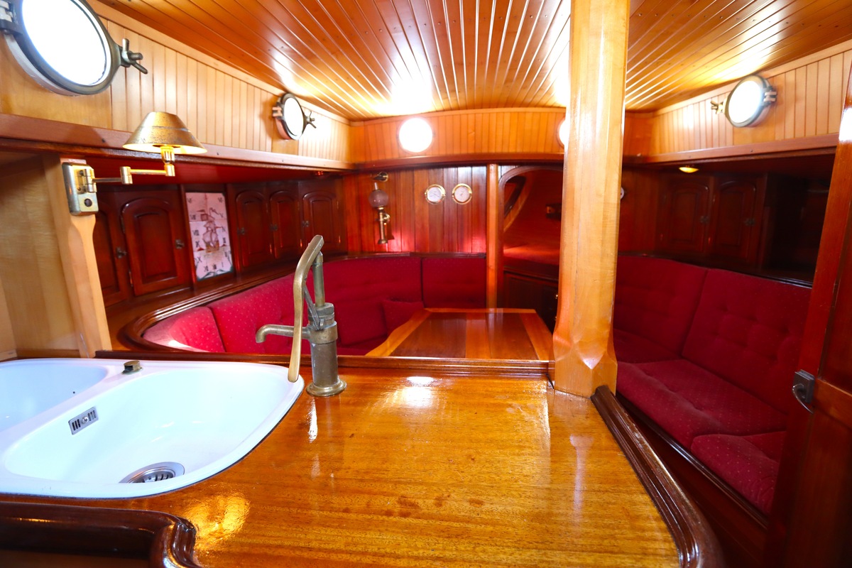 Maar het echte pronkstuk bevindt zich onderdeks. Het interieur is met ongekende precisie en liefde voor detail ingetimmerd. Geen concessies aan tijd of materiaal – en dat zie je in alles. Van de houtverbindingen tot de afwerking alles straalt vakmanschap uit. Het is een schip dat niet alleen gebouwd is om de wereldzeeën te trotseren, maar ook om je thuis te laten voelen zodra je aan boord stapt. Een echte blikvanger, van buiten én van binnen.