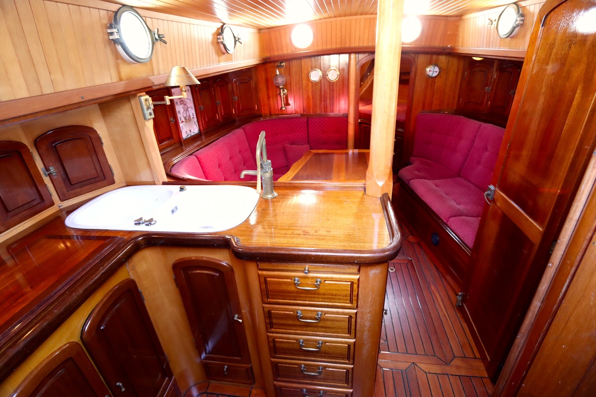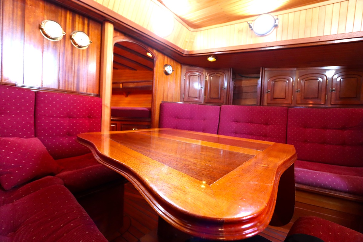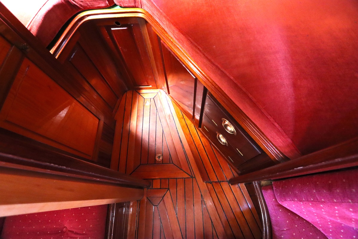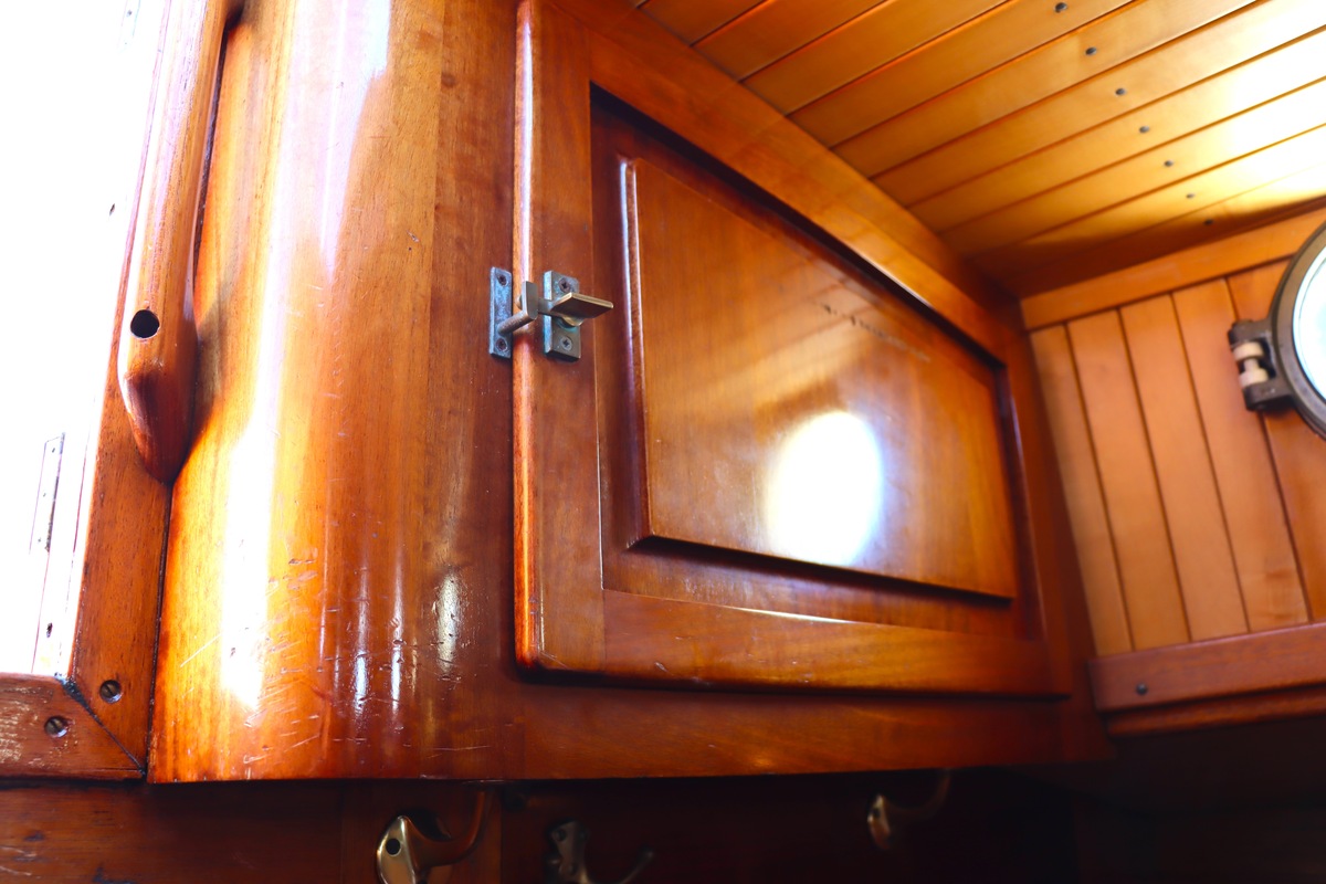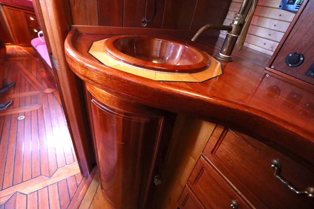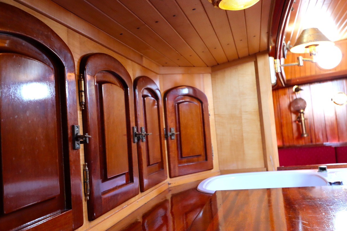 Maar het echte pronkstuk bevindt zich onderdeks. Het interieur is met ongekende precisie en liefde voor detail ingetimmerd. Geen concessies aan tijd of materiaal – en dat zie je in alles. Van de houtverbindingen tot de afwerking alles straalt vakmanschap uit. Het is een schip dat niet alleen gebouwd is om de wereldzeeën te trotseren, maar ook om je thuis te laten voelen zodra je aan boord stapt. Een echte blikvanger, van buiten én van binnen.