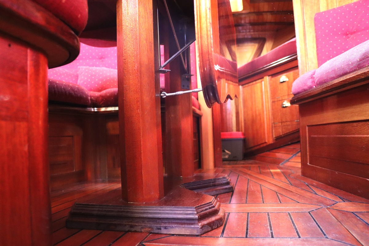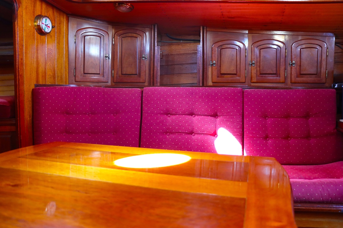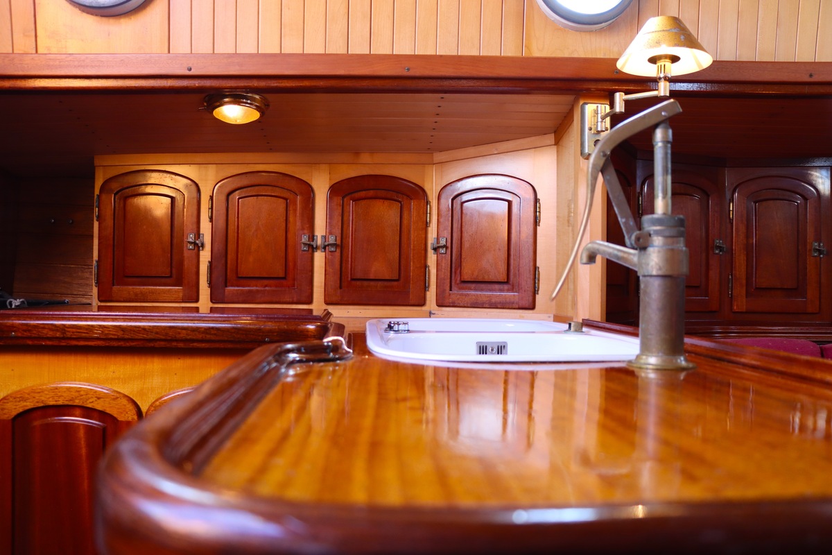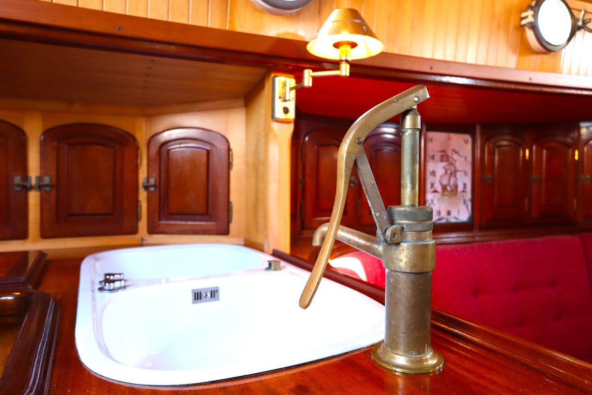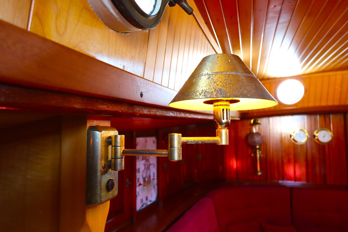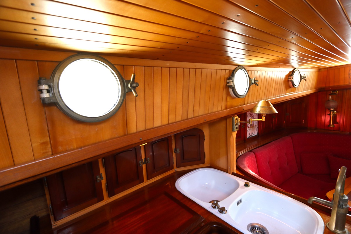 Maar het echte pronkstuk bevindt zich onderdeks. Het interieur is met ongekende precisie en liefde voor detail ingetimmerd. Geen concessies aan tijd of materiaal – en dat zie je in alles. Van de houtverbindingen tot de afwerking alles straalt vakmanschap uit. Het is een schip dat niet alleen gebouwd is om de wereldzeeën te trotseren, maar ook om je thuis te laten voelen zodra je aan boord stapt. Een echte blikvanger, van buiten én van binnen.