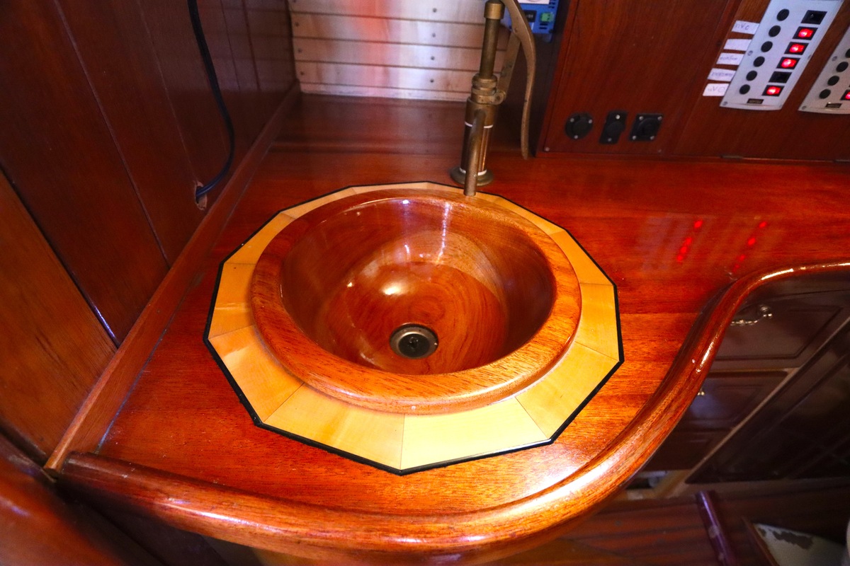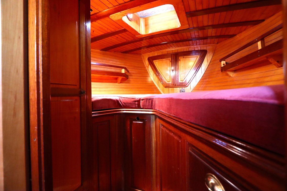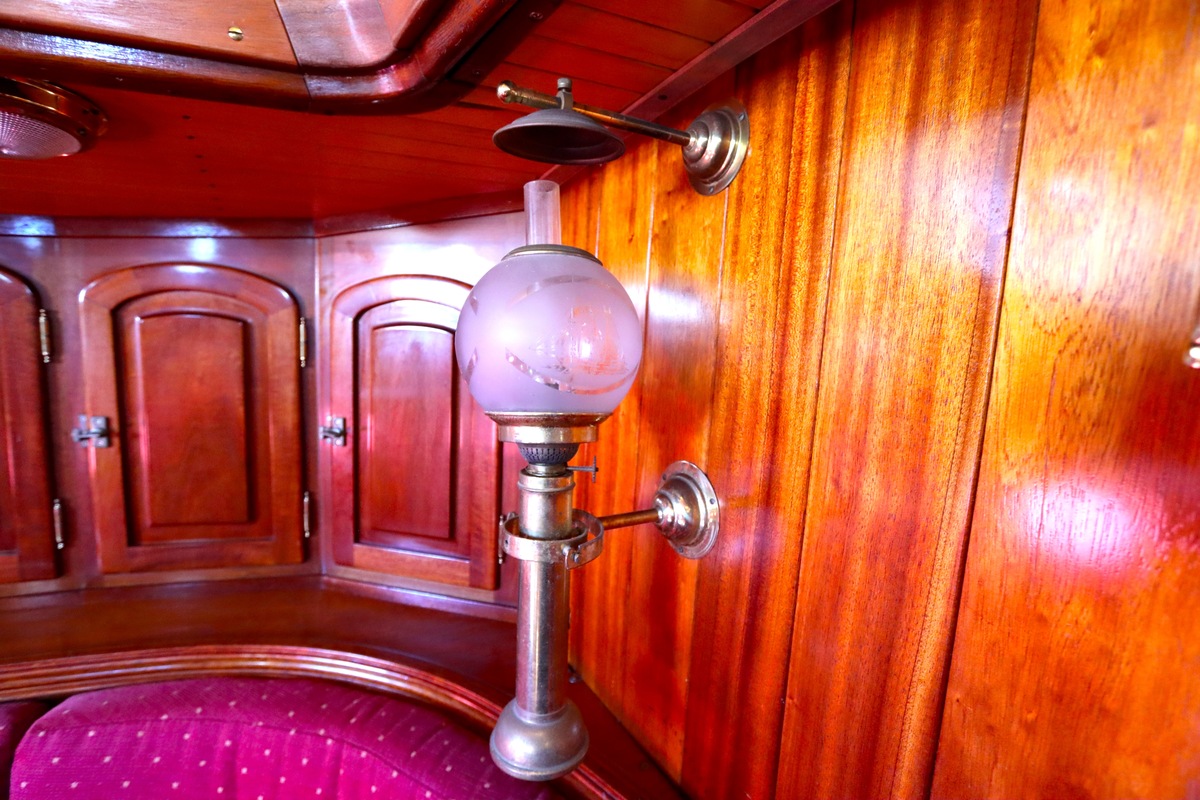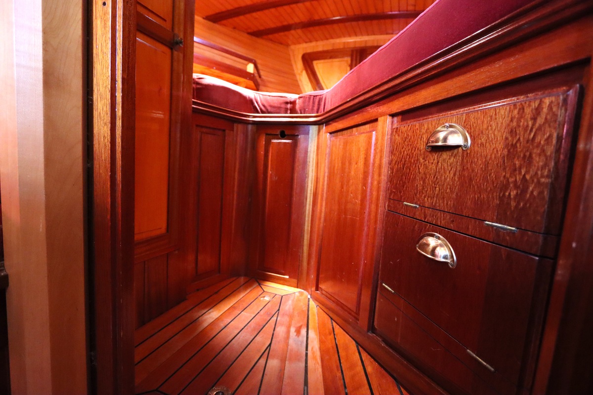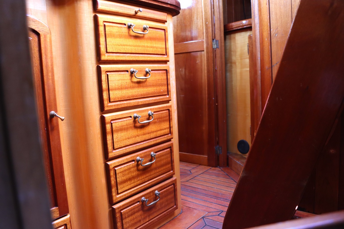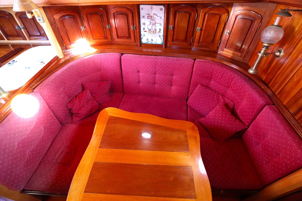 Maar het echte pronkstuk bevindt zich onderdeks. Het interieur is met ongekende precisie en liefde voor detail ingetimmerd. Geen concessies aan tijd of materiaal – en dat zie je in alles. Van de houtverbindingen tot de afwerking alles straalt vakmanschap uit. Het is een schip dat niet alleen gebouwd is om de wereldzeeën te trotseren, maar ook om je thuis te laten voelen zodra je aan boord stapt. Een echte blikvanger, van buiten én van binnen.