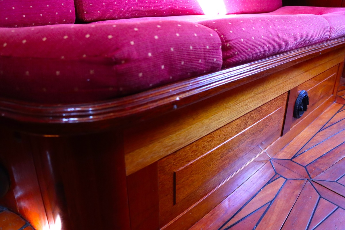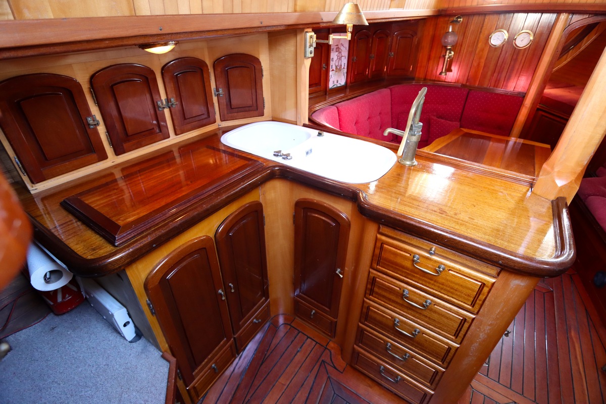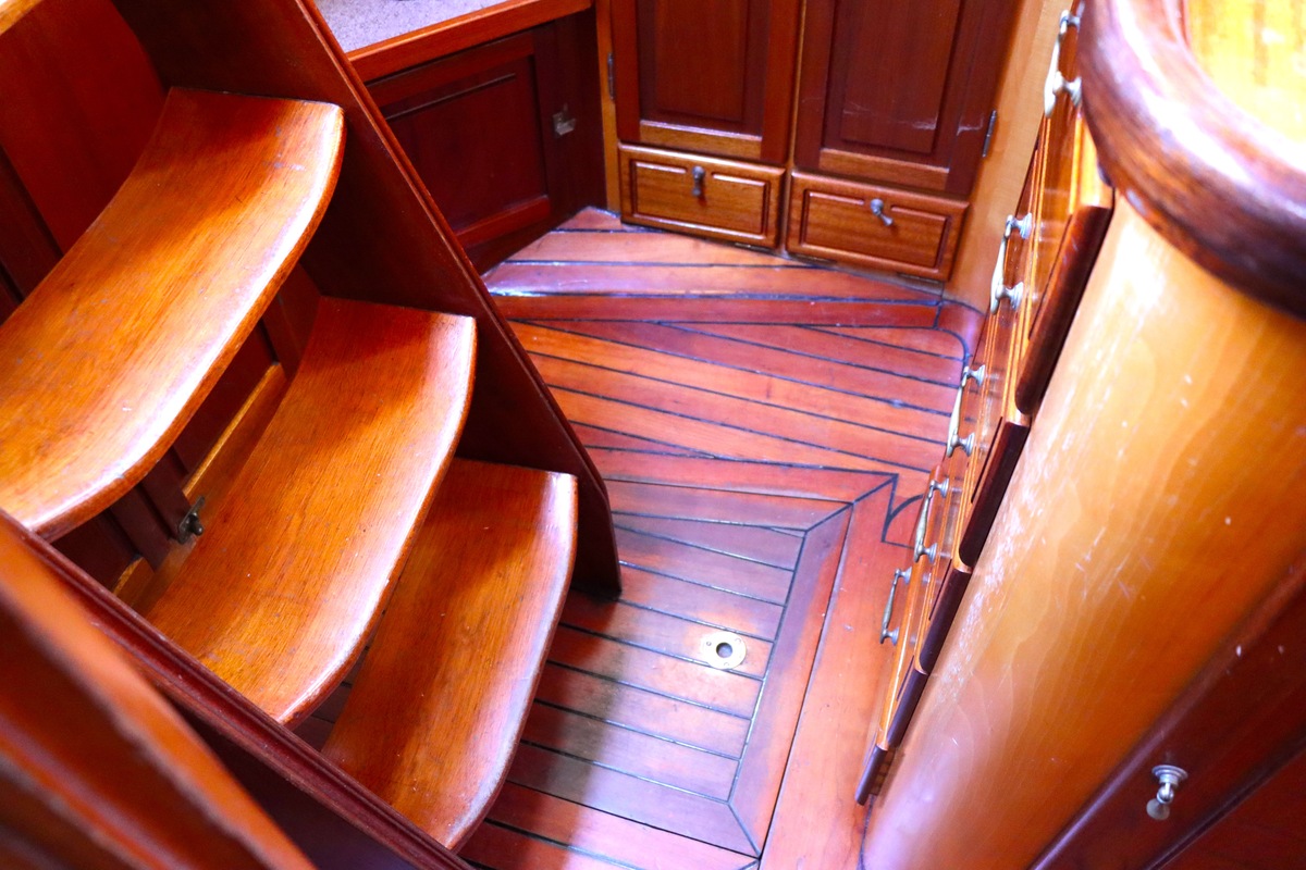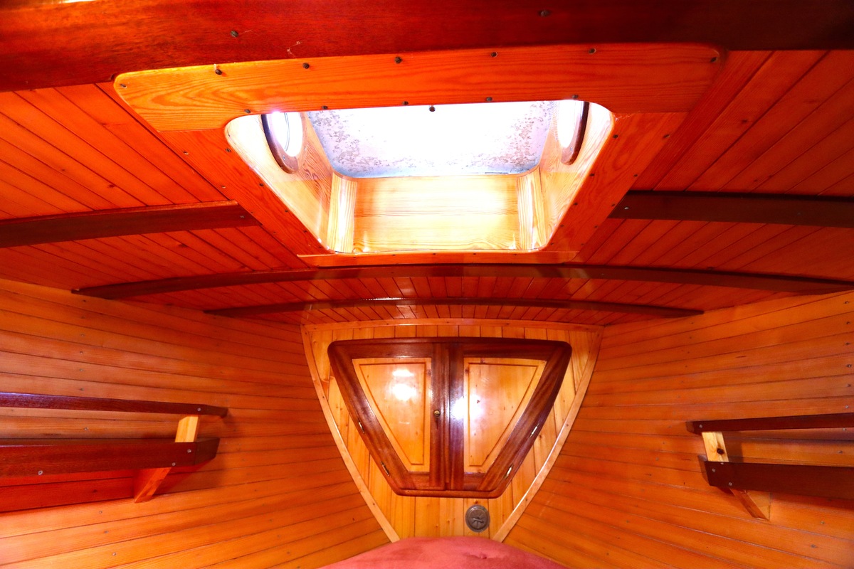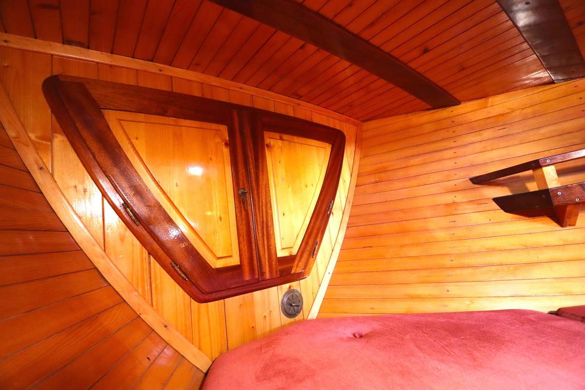 Maar het echte pronkstuk bevindt zich onderdeks. Het interieur is met ongekende precisie en liefde voor detail ingetimmerd. Geen concessies aan tijd of materiaal – en dat zie je in alles. Van de houtverbindingen tot de afwerking alles straalt vakmanschap uit. Het is een schip dat niet alleen gebouwd is om de wereldzeeën te trotseren, maar ook om je thuis te laten voelen zodra je aan boord stapt. Een echte blikvanger, van buiten én van binnen.