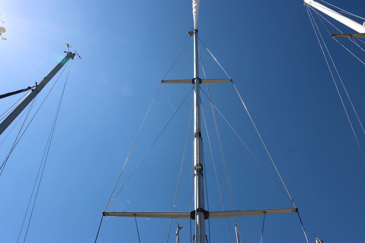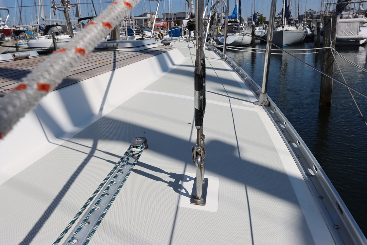 Spinnakerboom tegen de mast.Kan ook op het dek gelegd worden in twee houders.