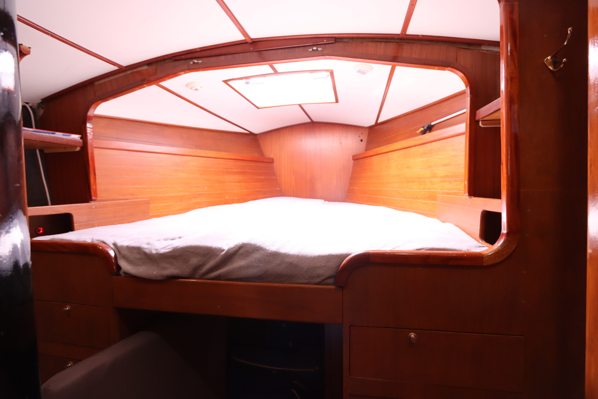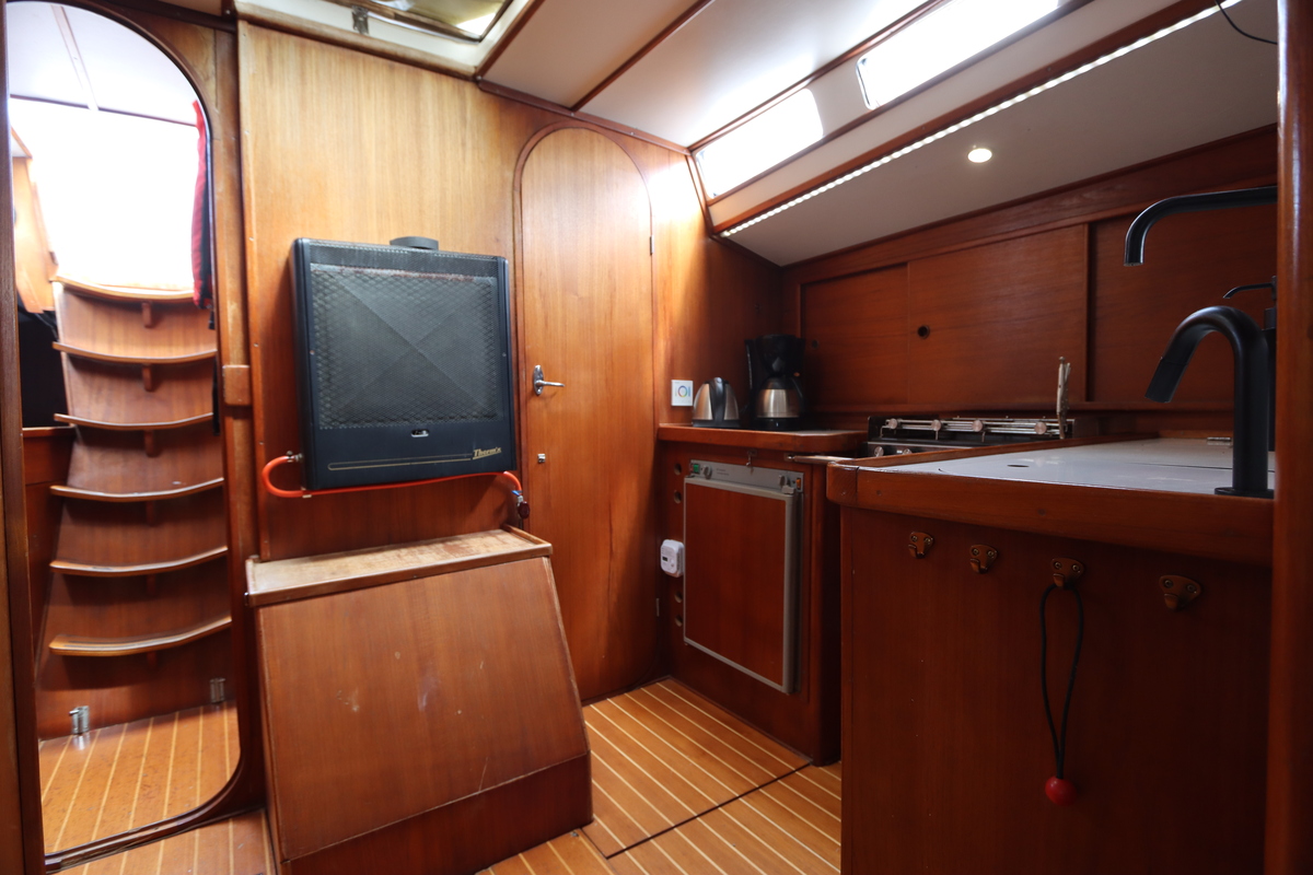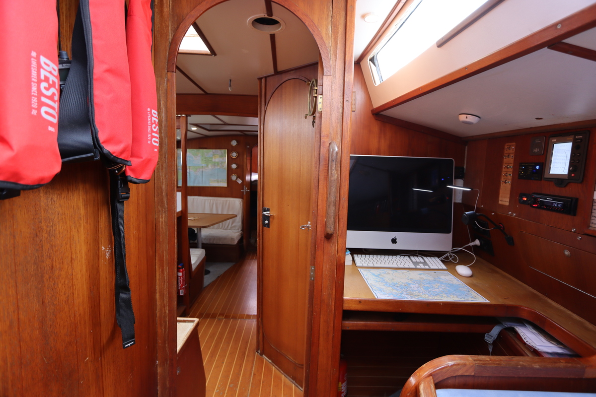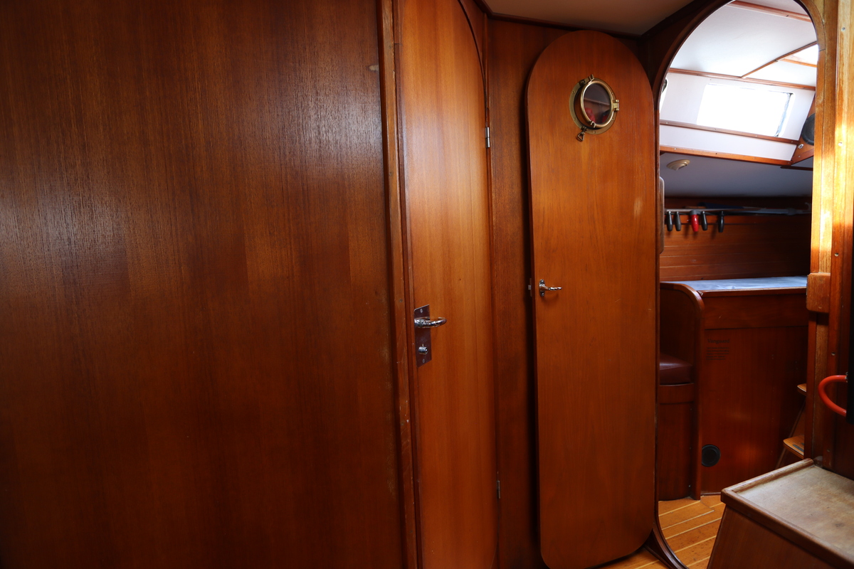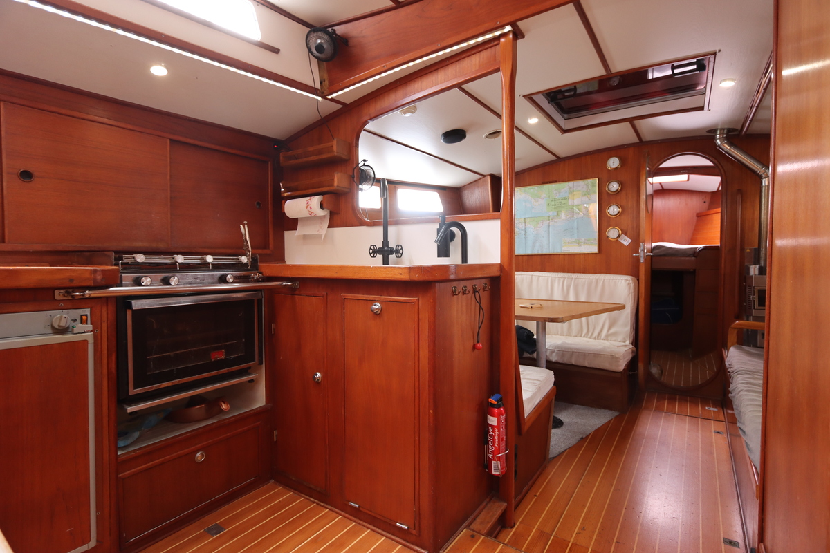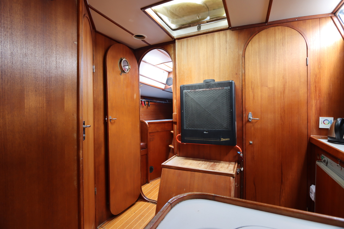 Het schip heeft een s-spant, koersvast en bijzonder goede eigenschappen voor lange tochten. Voldoende luchthappers aan dek voor goede ventilatie benedendeks wat speciaal in zuidelijke streken prettig is. Voorin is een derde kajuit met een dubbel bed. Het schip is verder geriefelijk ingericht met een ruime kombuis, een goed toilet en veel bergruimte. Van achter naar voren is er de kuip, dan - benedendeks de zeekajuit met hondekooi. Aan bakboordzijden achterhut met 2 slaapplaatsen en verder naar voren de hoofdkajuit met douche/toilet, kombuis en veel zitgelegenheid, en dan de voorste kajuit met 2 slaapplaatsen en ruime bergplaats. Het schip heeft grote tanks waarmee ook langere oversteken probleemloos kunnen worden gemaakt.