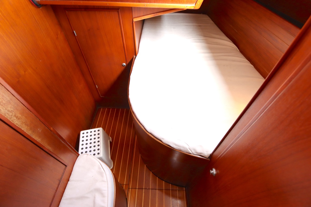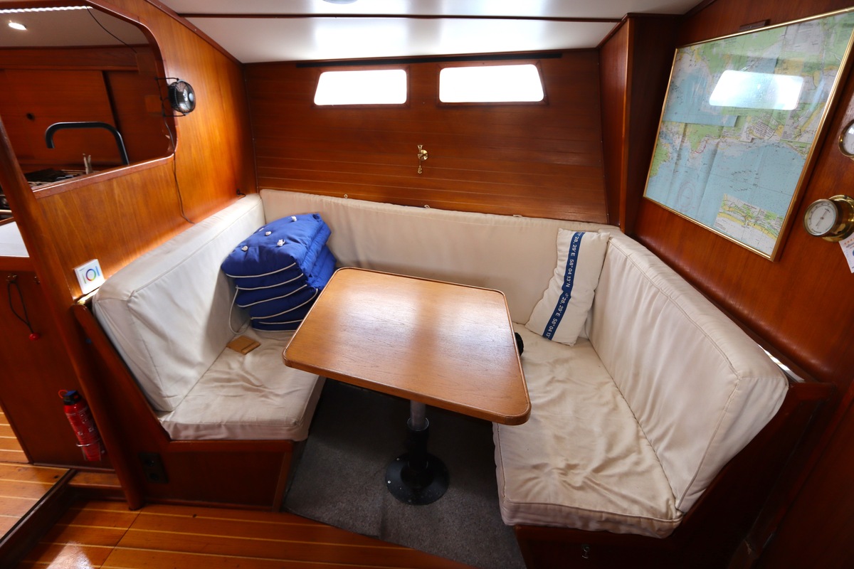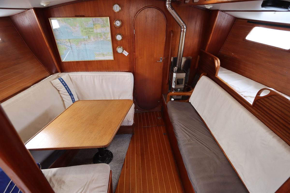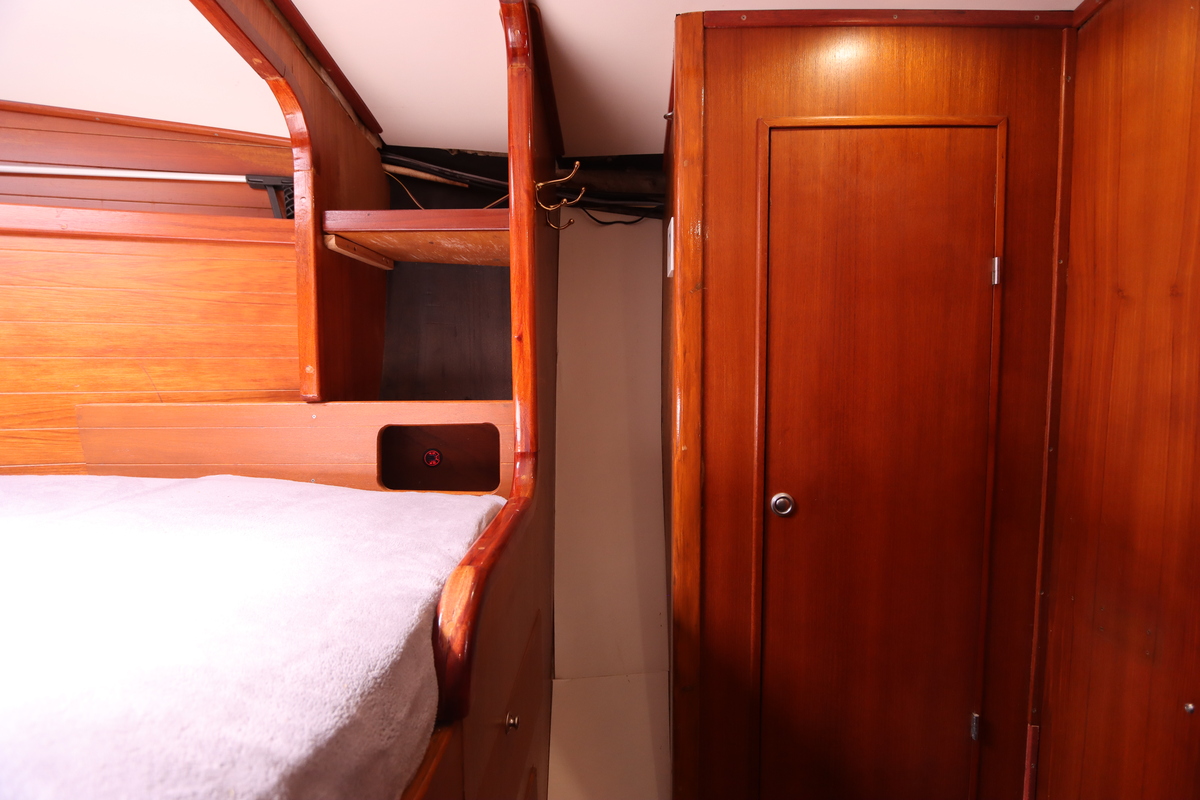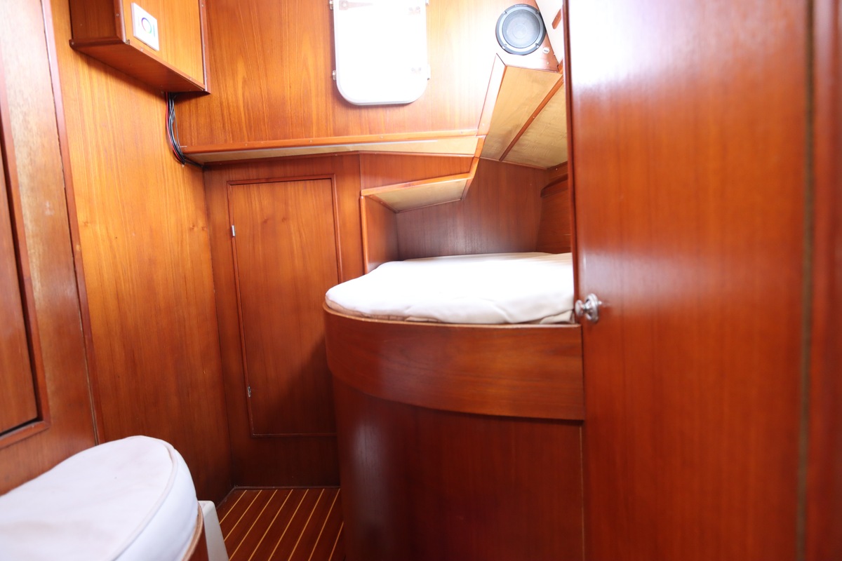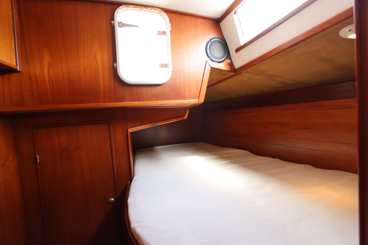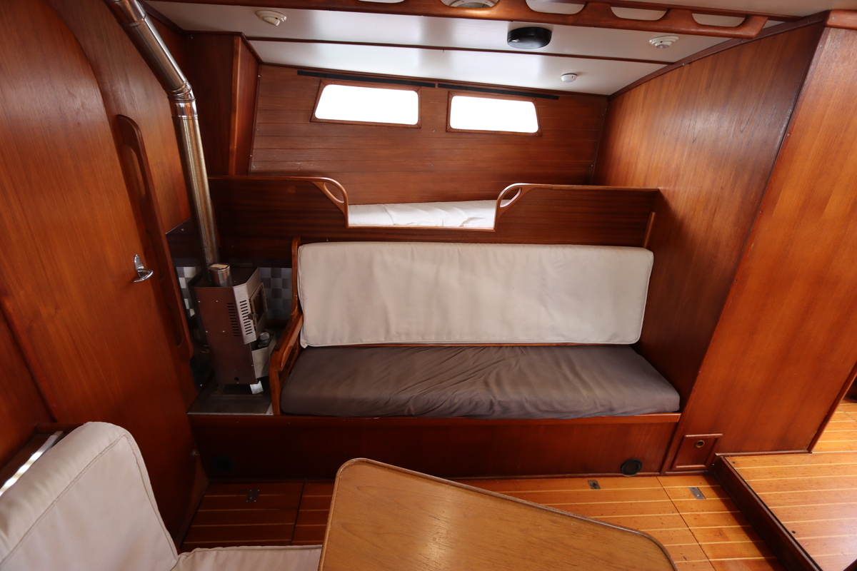 Het schip heeft een s-spant, koersvast en bijzonder goede eigenschappen voor lange tochten. Voldoende luchthappers aan dek voor goede ventilatie benedendeks wat speciaal in zuidelijke streken prettig is. Voorin is een derde kajuit met een dubbel bed. Het schip is verder geriefelijk ingericht met een ruime kombuis, een goed toilet en veel bergruimte. Van achter naar voren is er de kuip, dan - benedendeks de zeekajuit met hondekooi. Aan bakboordzijden achterhut met 2 slaapplaatsen en verder naar voren de hoofdkajuit met douche/toilet, kombuis en veel zitgelegenheid, en dan de voorste kajuit met 2 slaapplaatsen en ruime bergplaats. Het schip heeft grote tanks waarmee ook langere oversteken probleemloos kunnen worden gemaakt.