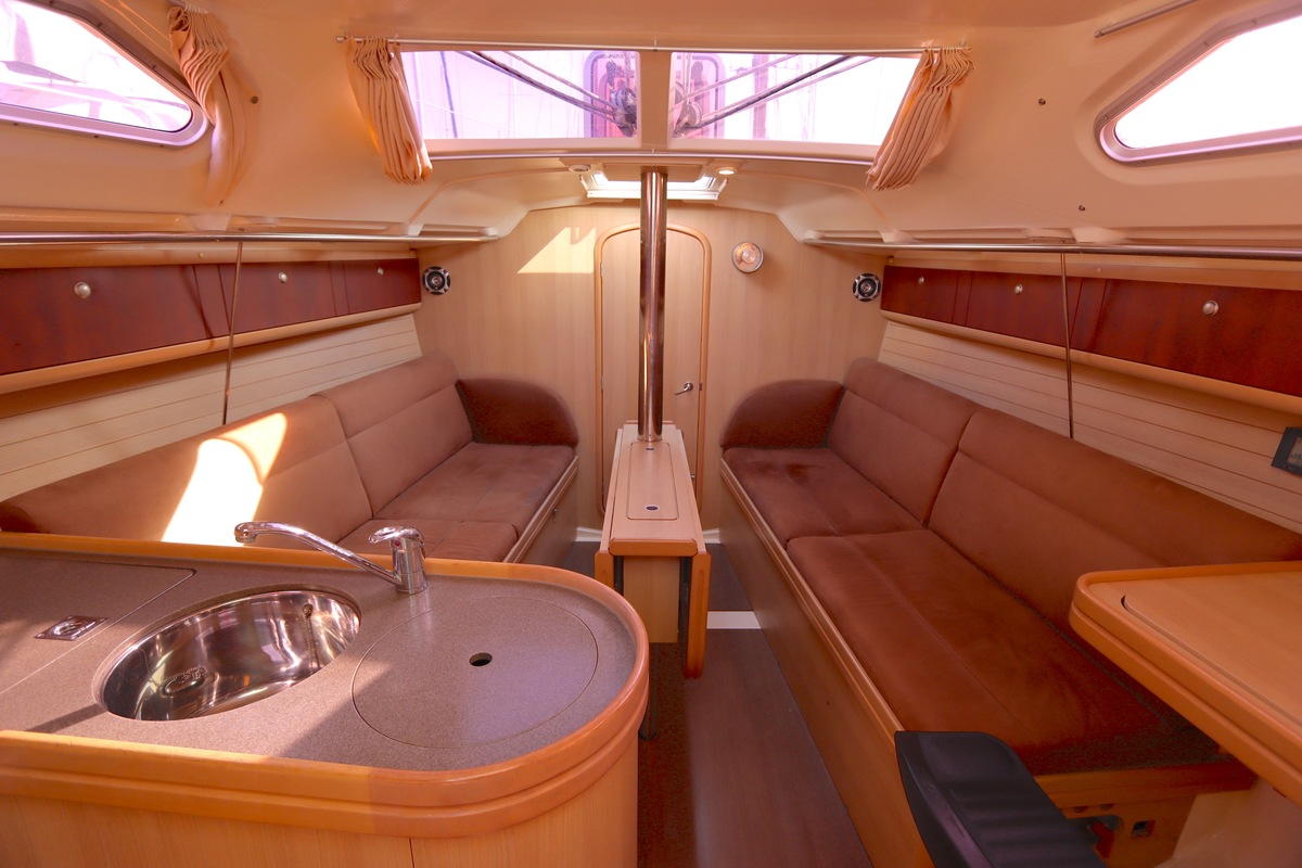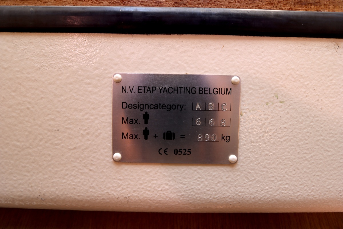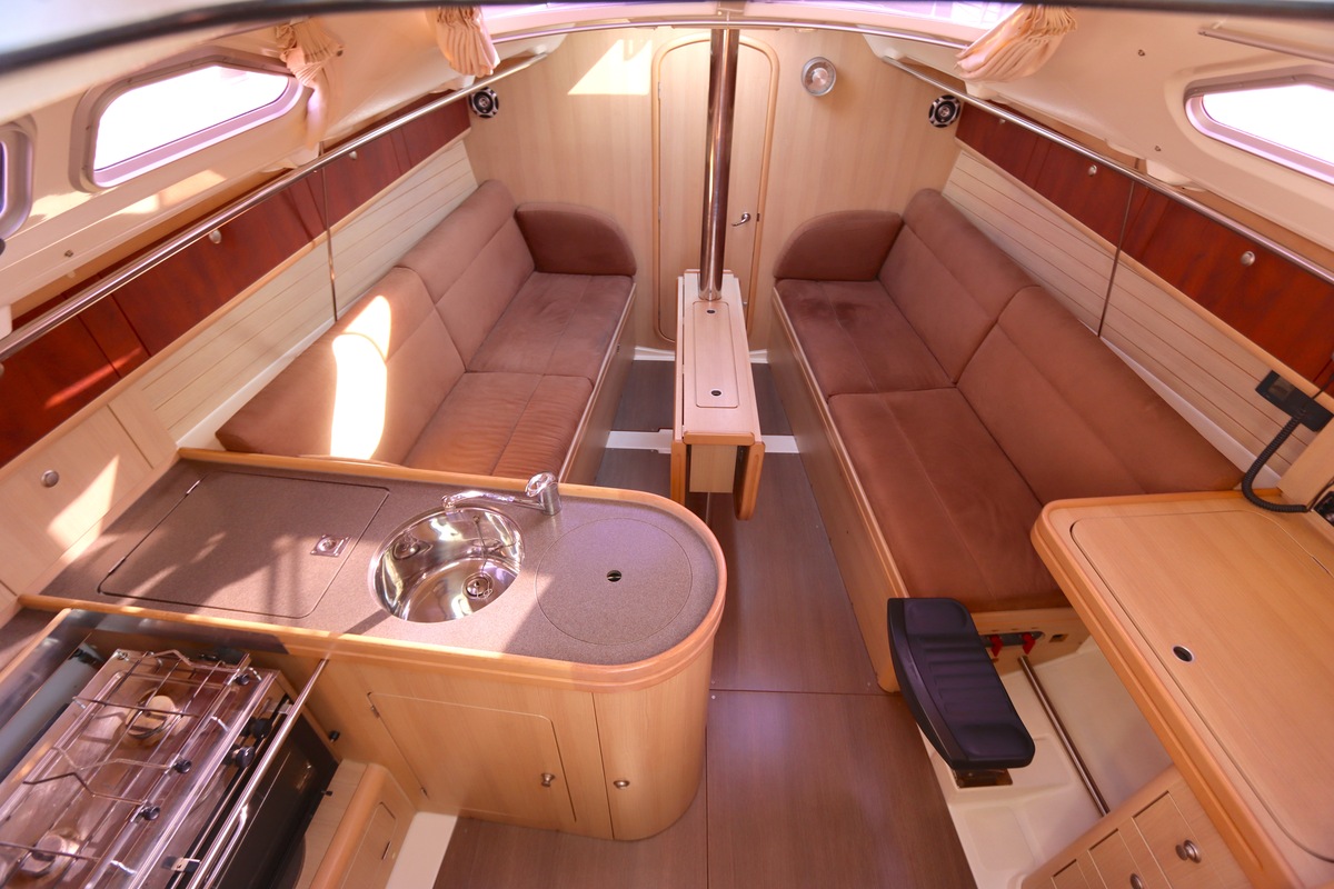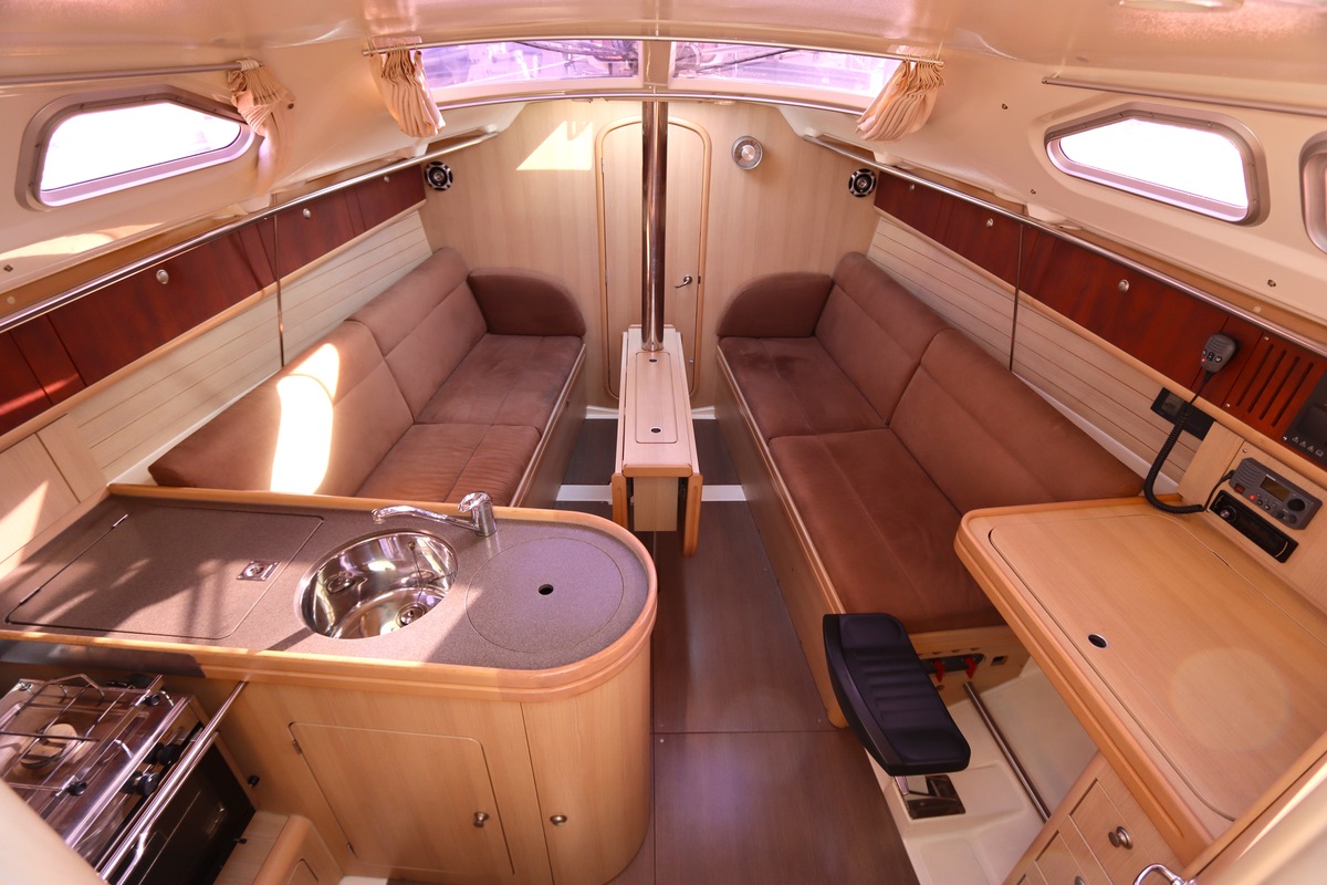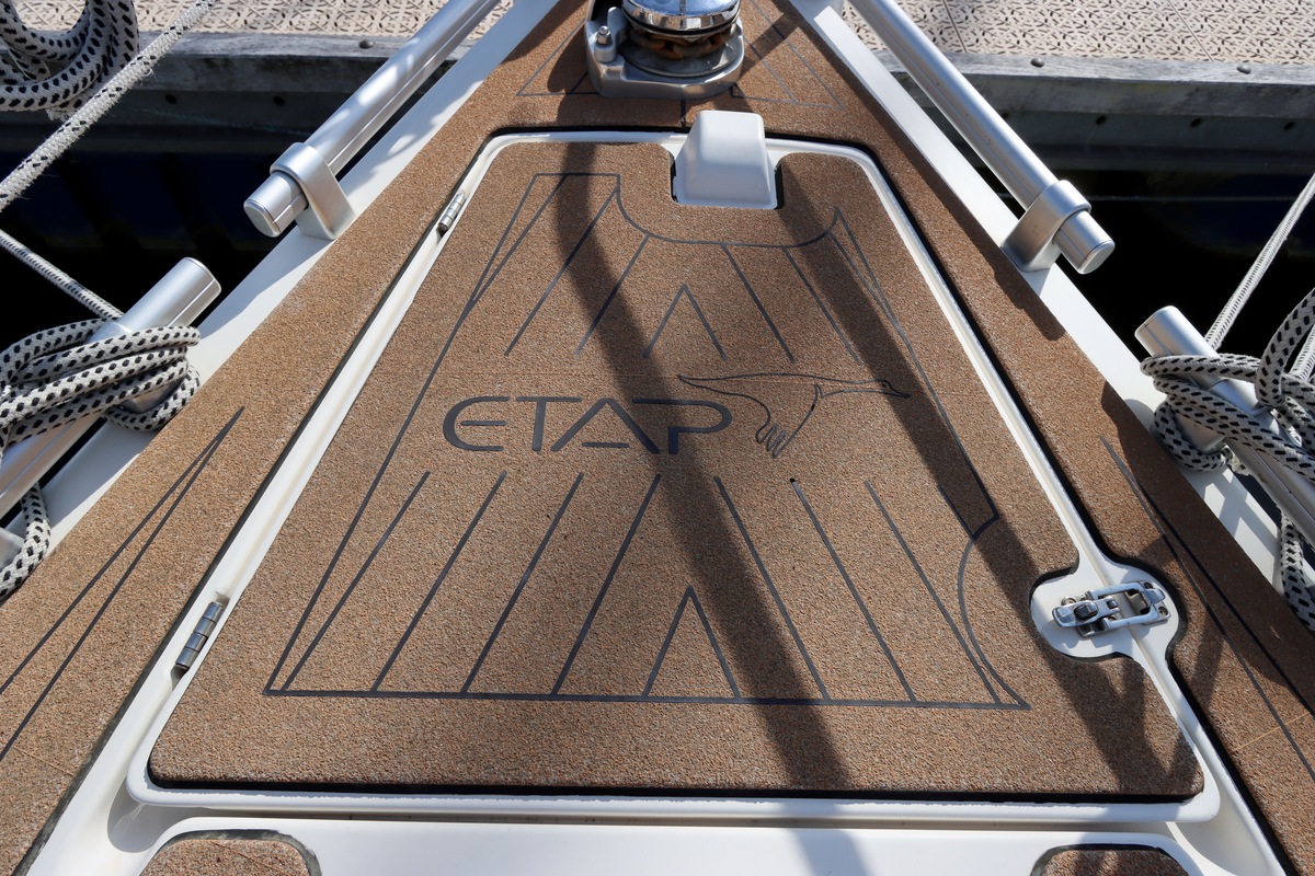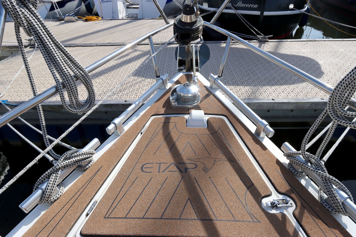 Het schip is onzinkbaar, snel en veilig – typisch Etap. Dankzij de ondiepe kiel (1,30 m) is deze zeilboot perfect voor binnenwater én kustvaart. De lichte salon is sfeervol afgewerkt met essen/notenhout en biedt een comfortabele zit, langskeuken en praktische navigatietafel.