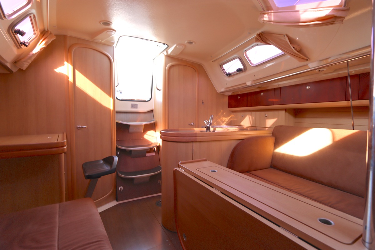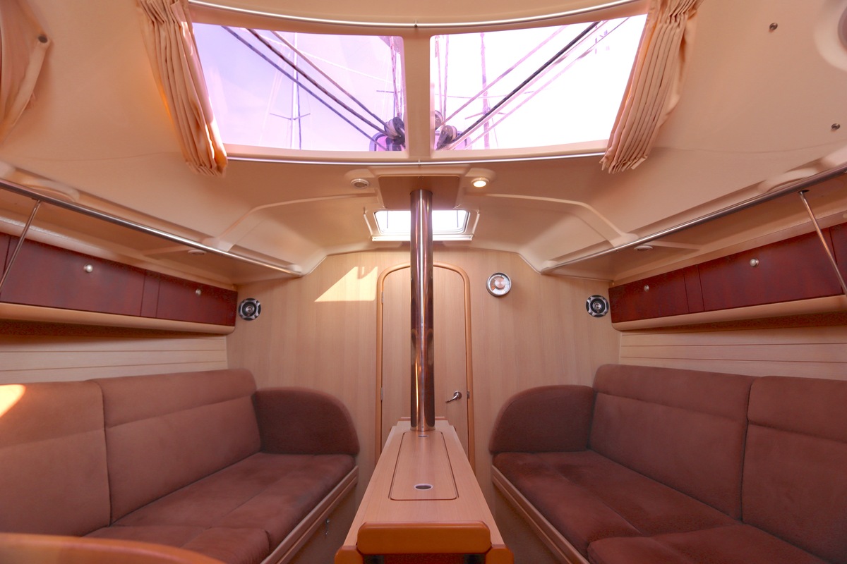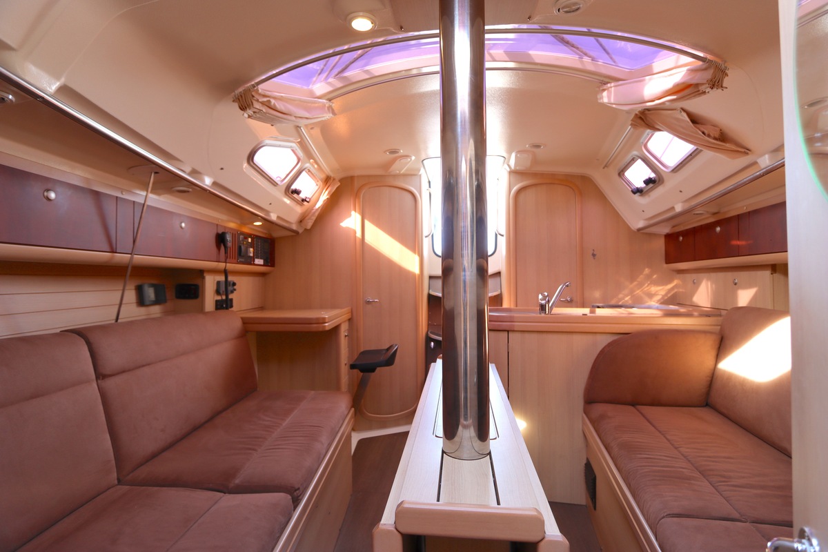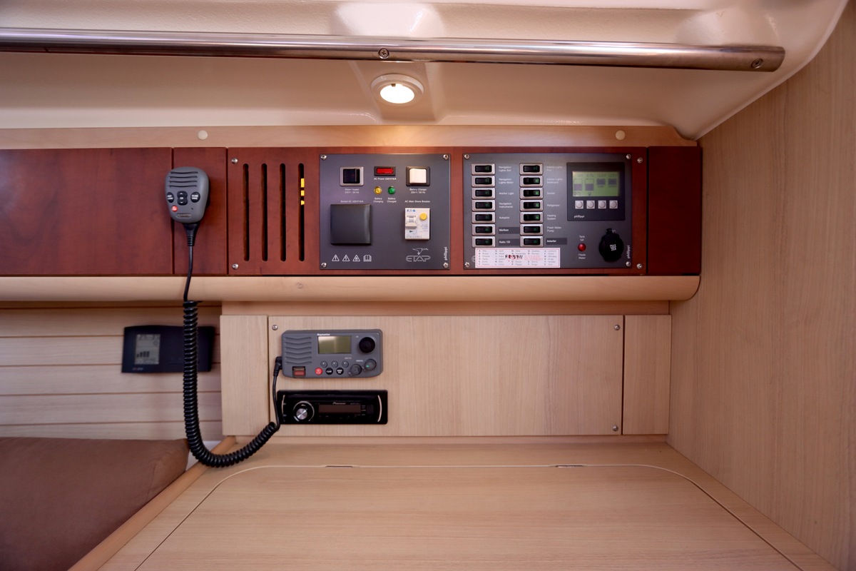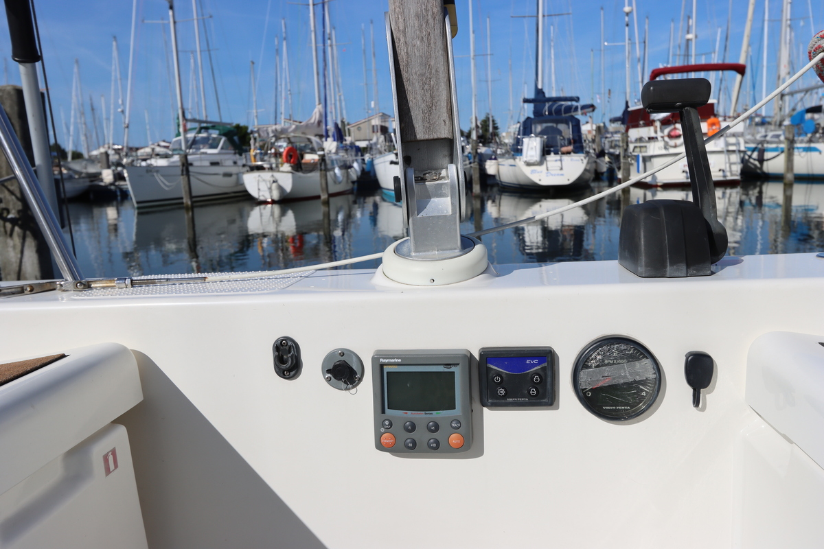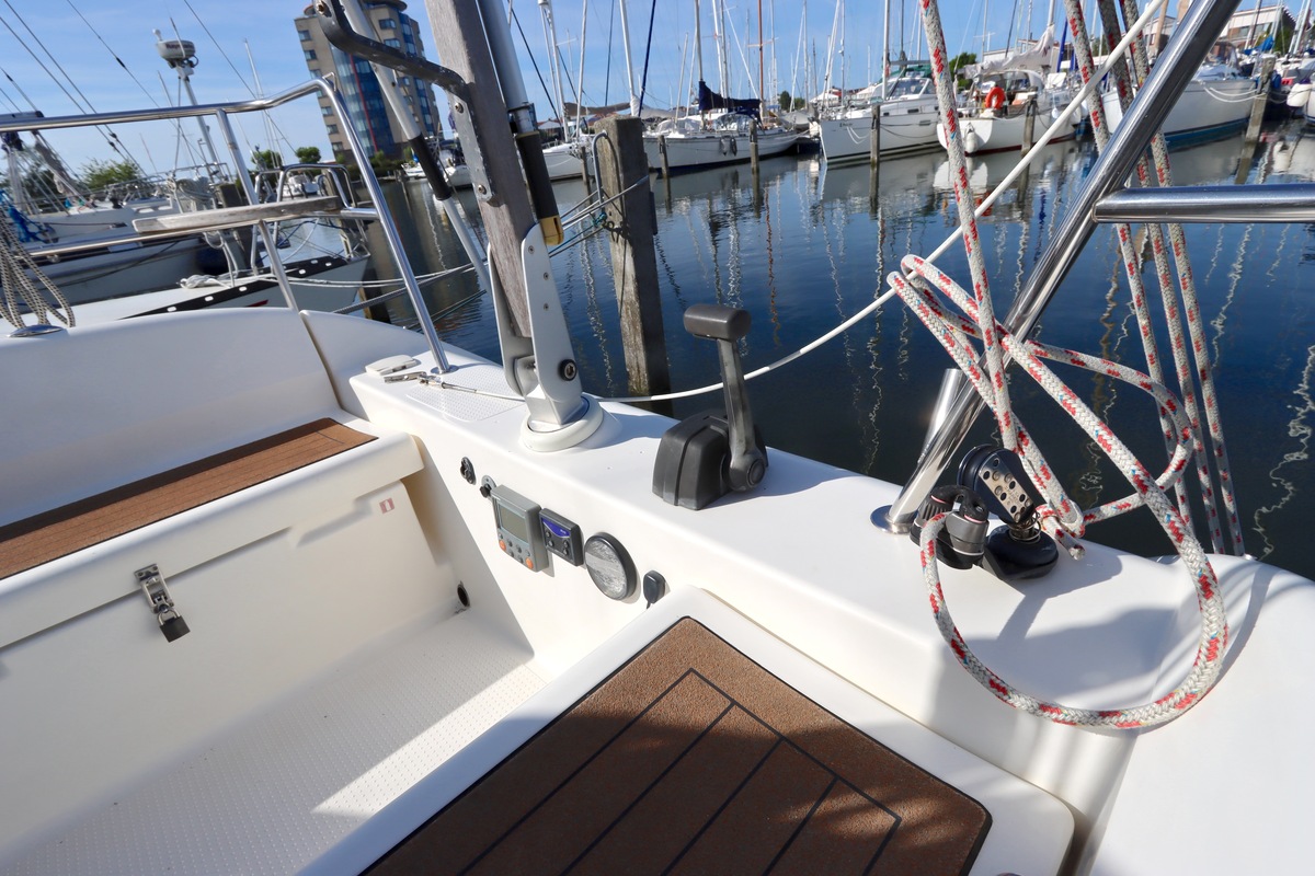 Het schip is onzinkbaar, snel en veilig – typisch Etap. Dankzij de ondiepe kiel (1,30 m) is deze zeilboot perfect voor binnenwater én kustvaart. De lichte salon is sfeervol afgewerkt met essen/notenhout en biedt een comfortabele zit, langskeuken en praktische navigatietafel.