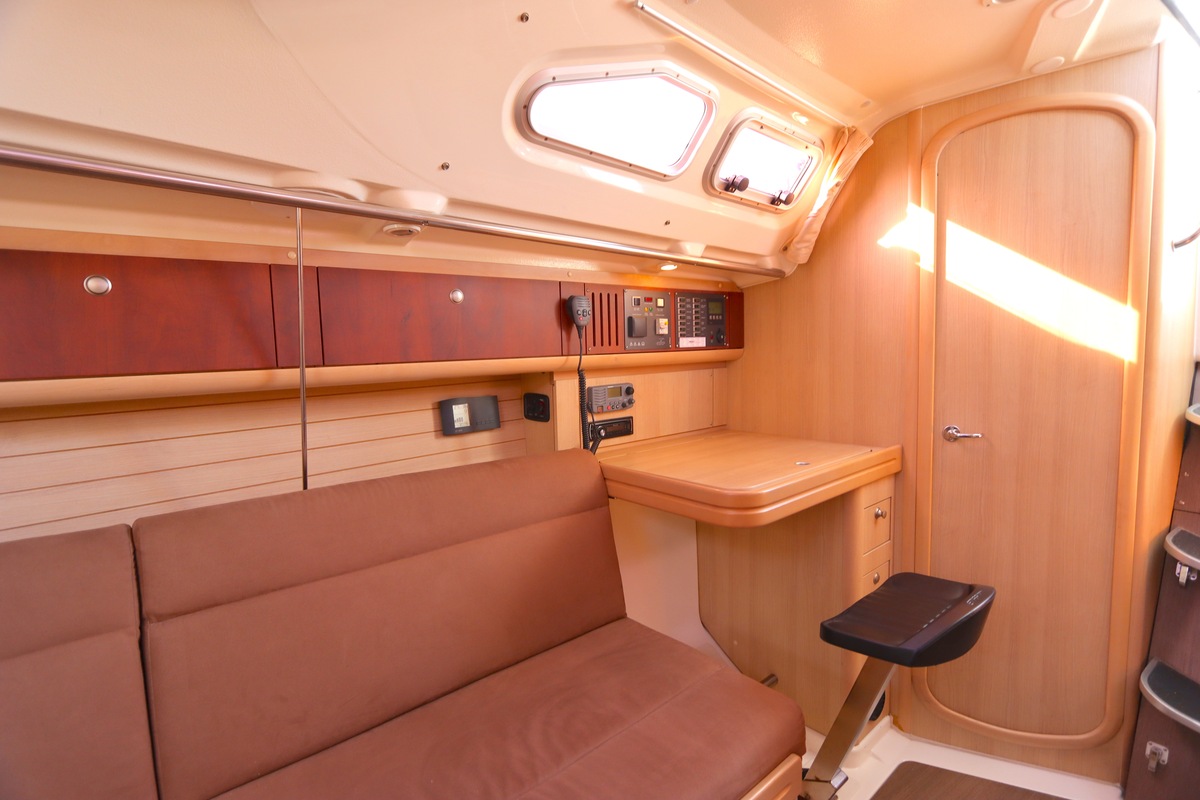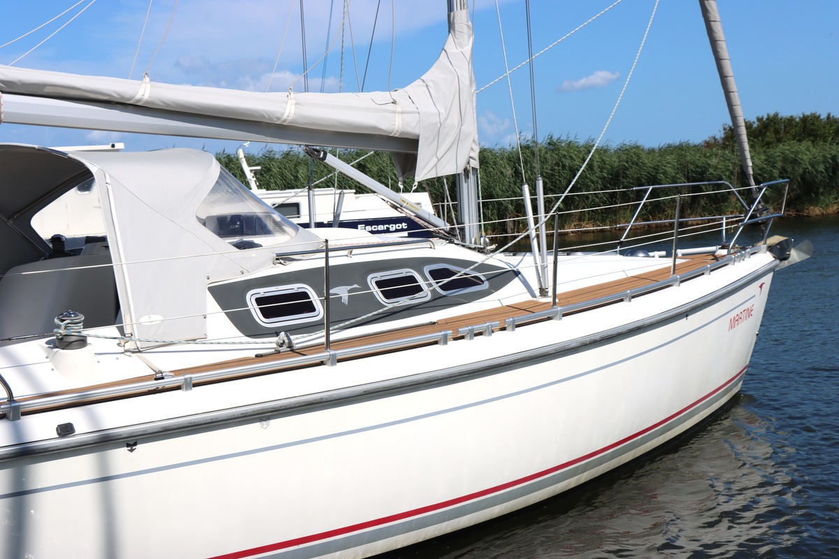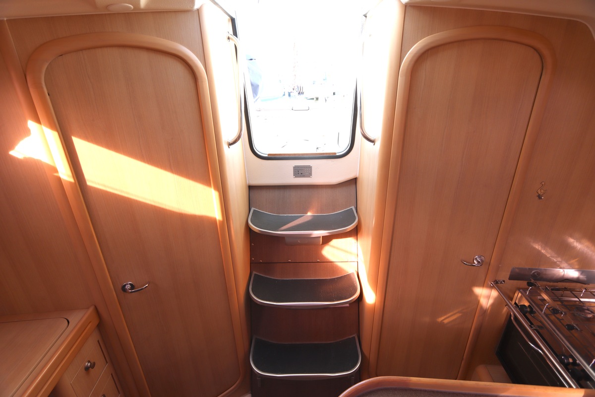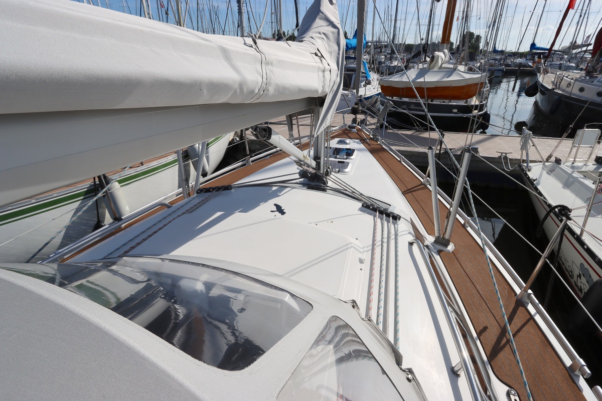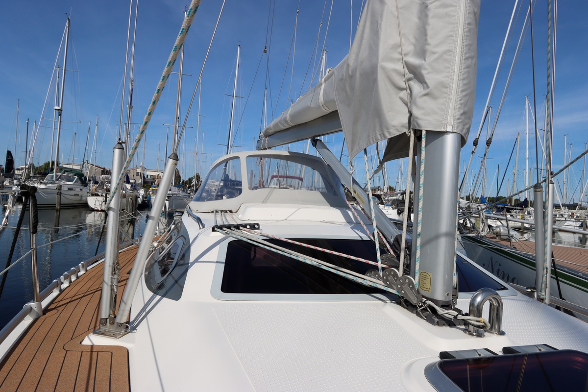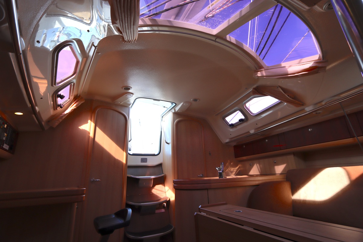 Het schip is onzinkbaar, snel en veilig – typisch Etap. Dankzij de ondiepe kiel (1,30 m) is deze zeilboot perfect voor binnenwater én kustvaart. De lichte salon is sfeervol afgewerkt met essen/notenhout en biedt een comfortabele zit, langskeuken en praktische navigatietafel.