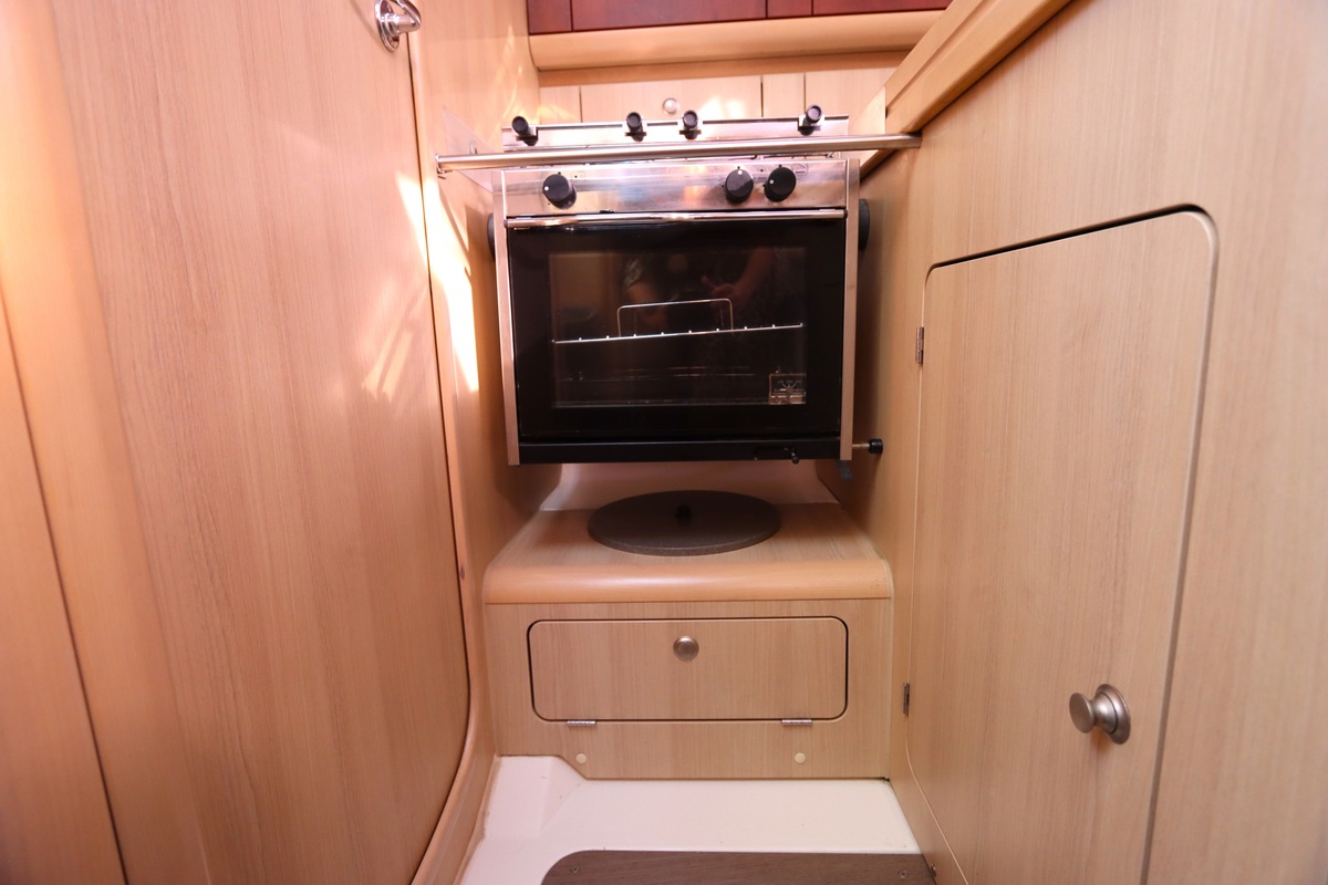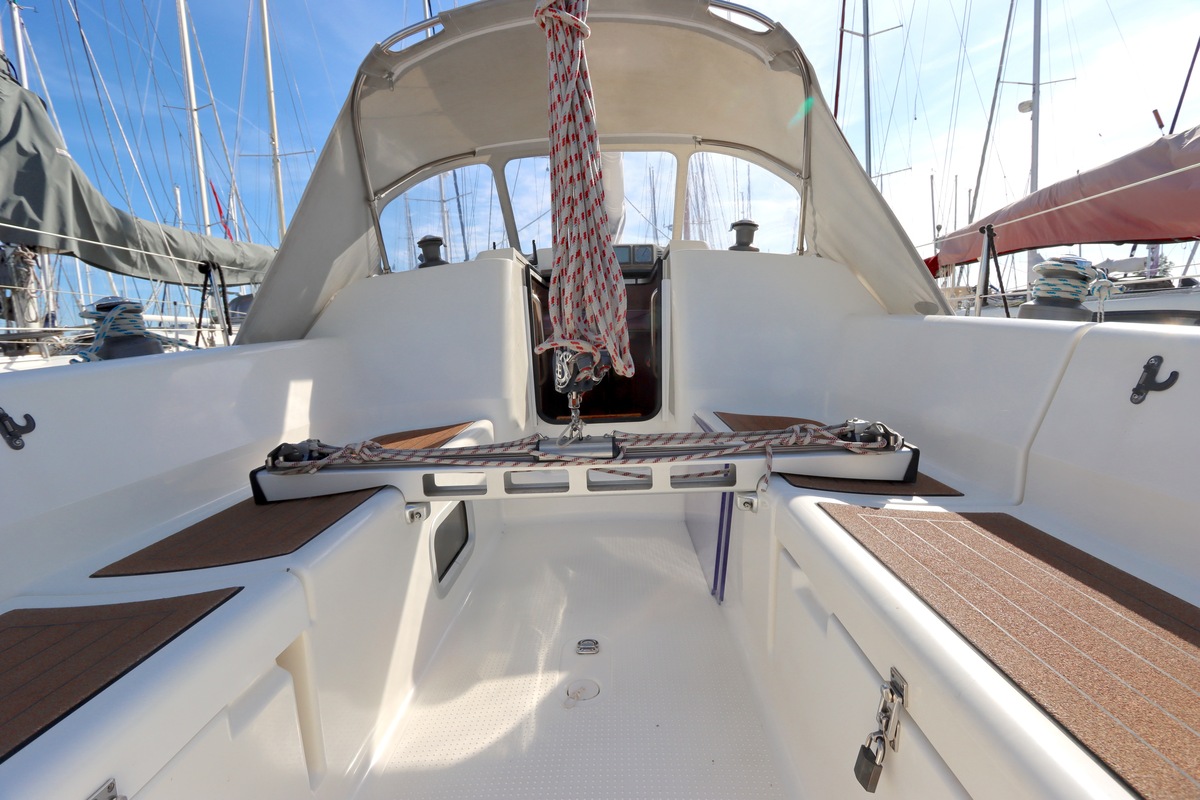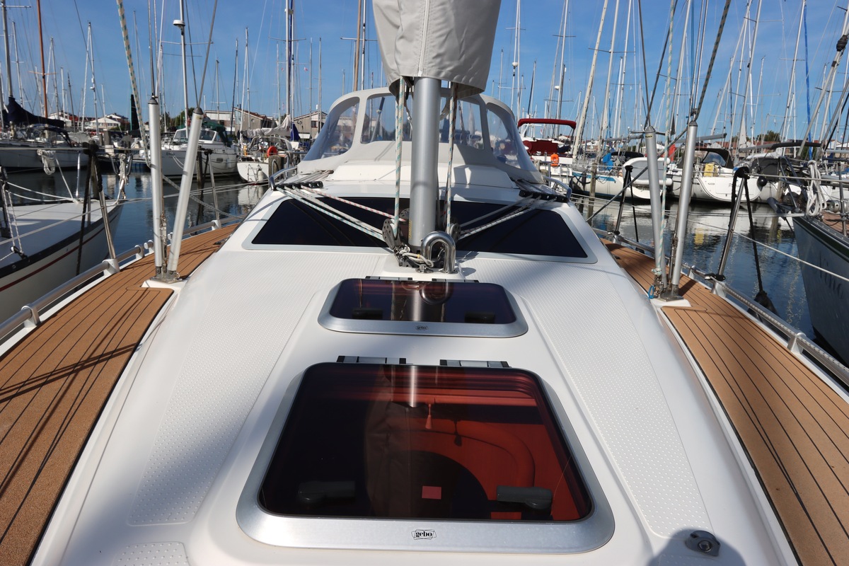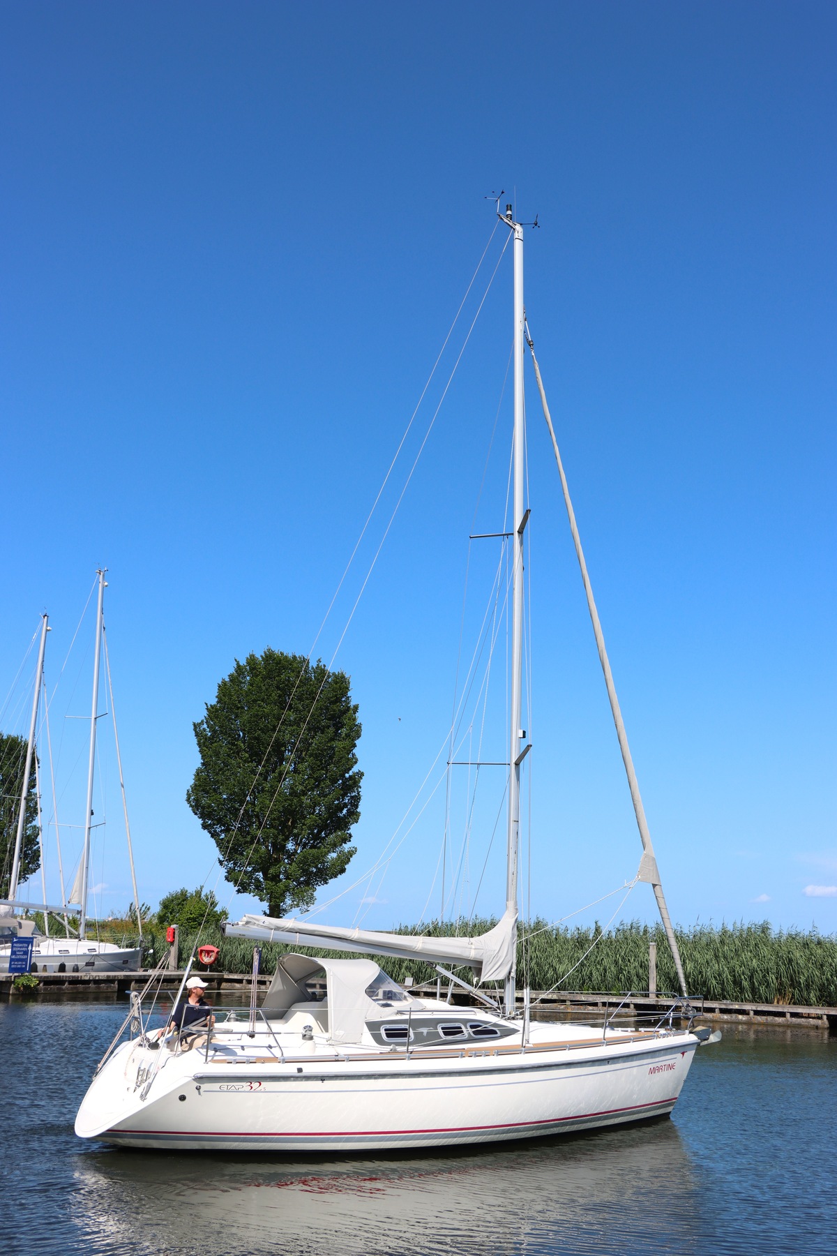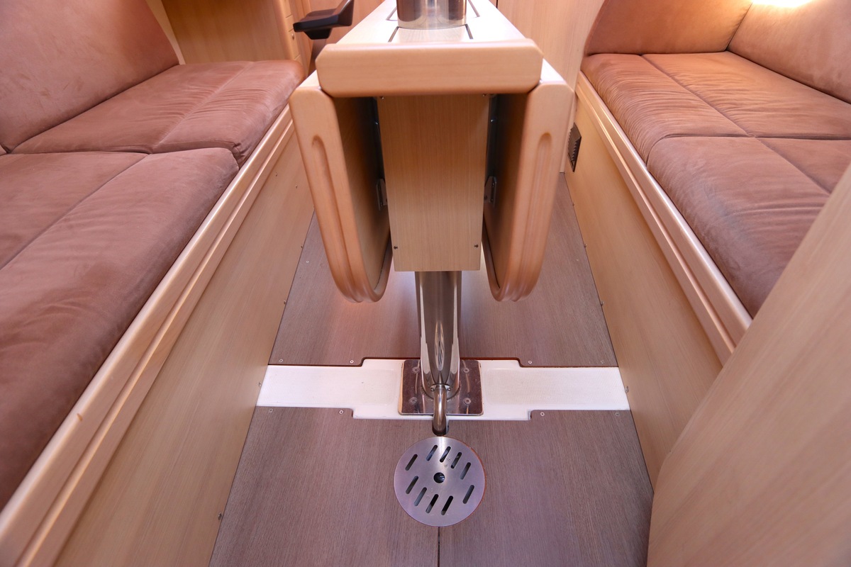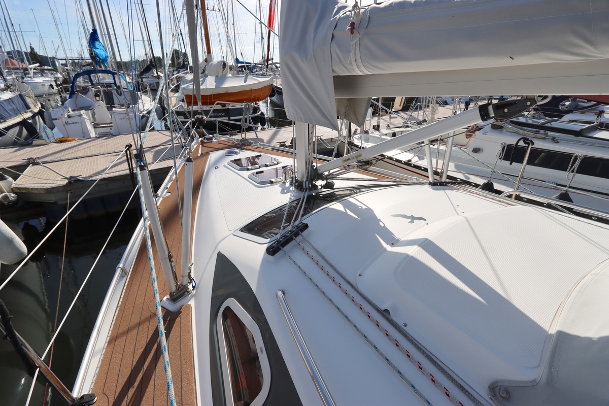 Het schip is onzinkbaar, snel en veilig – typisch Etap. Dankzij de ondiepe kiel (1,30 m) is deze zeilboot perfect voor binnenwater én kustvaart. De lichte salon is sfeervol afgewerkt met essen/notenhout en biedt een comfortabele zit, langskeuken en praktische navigatietafel.