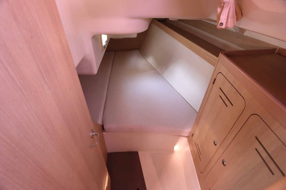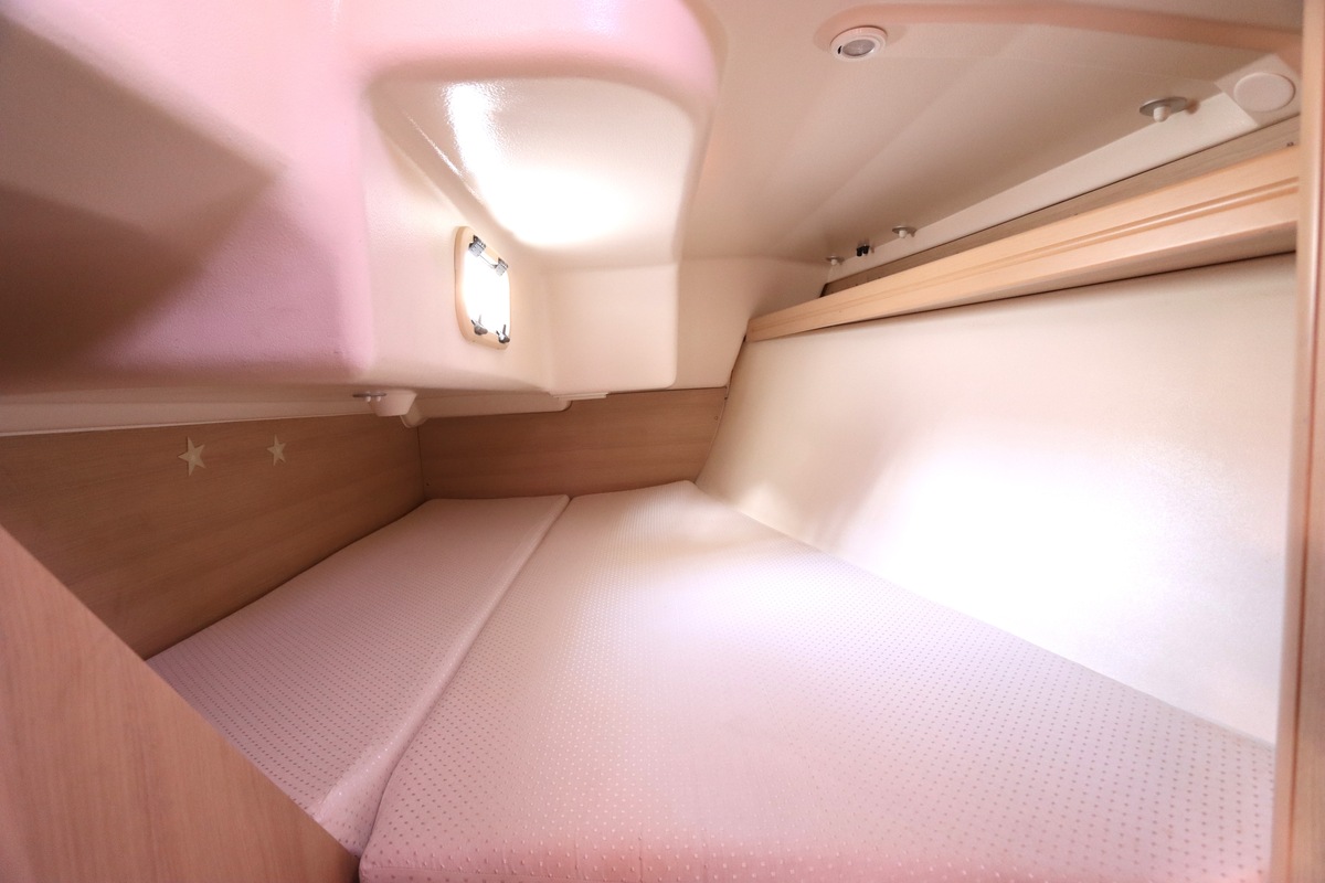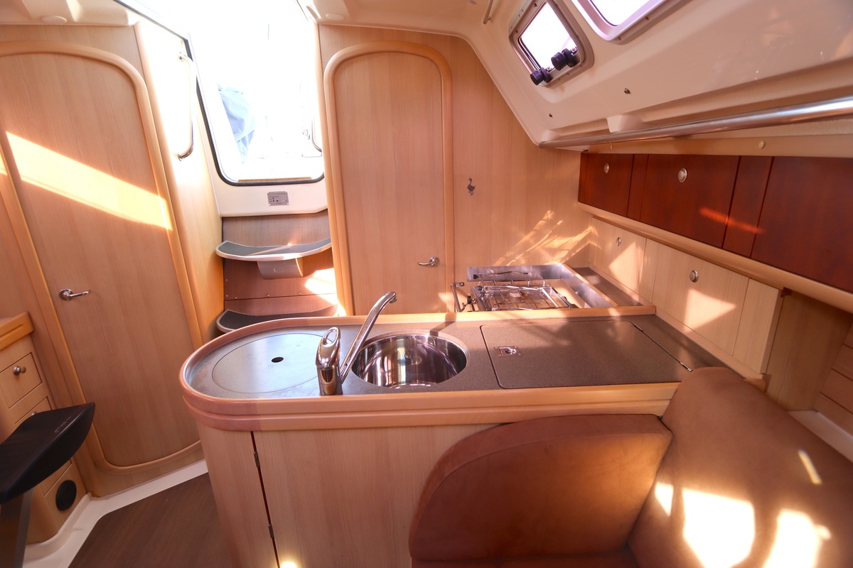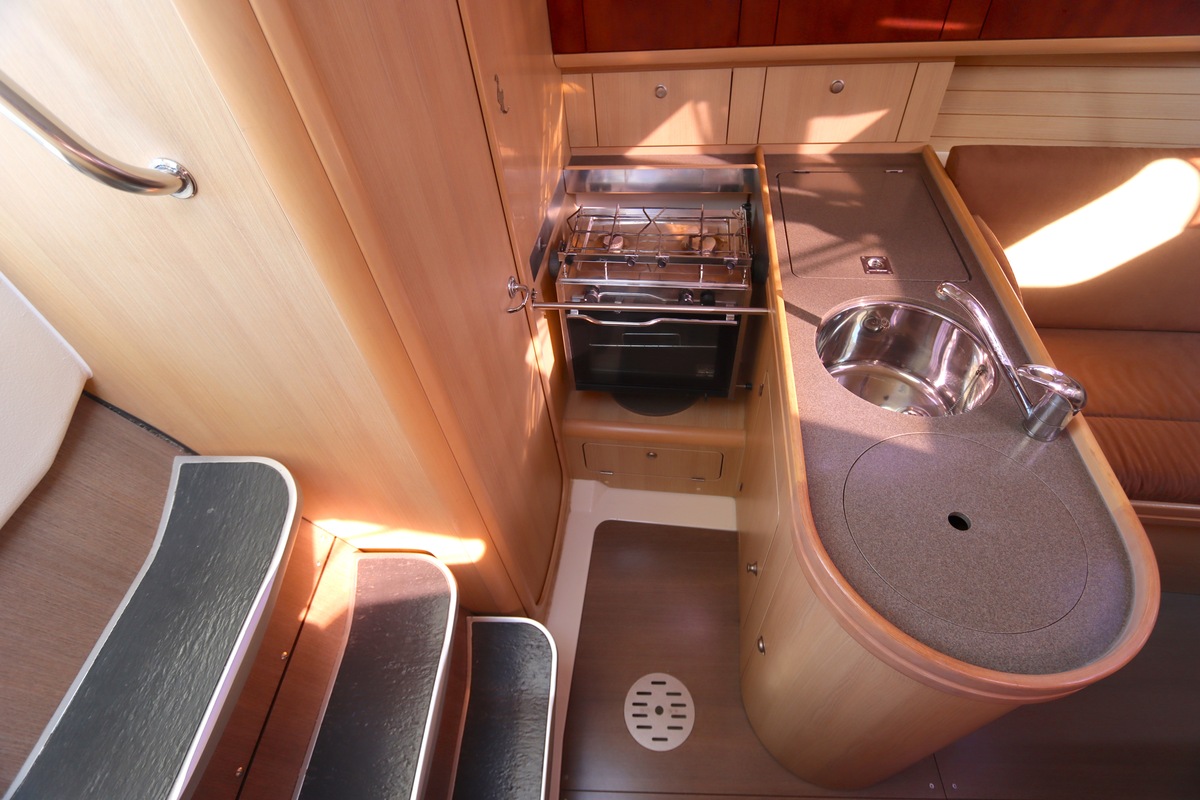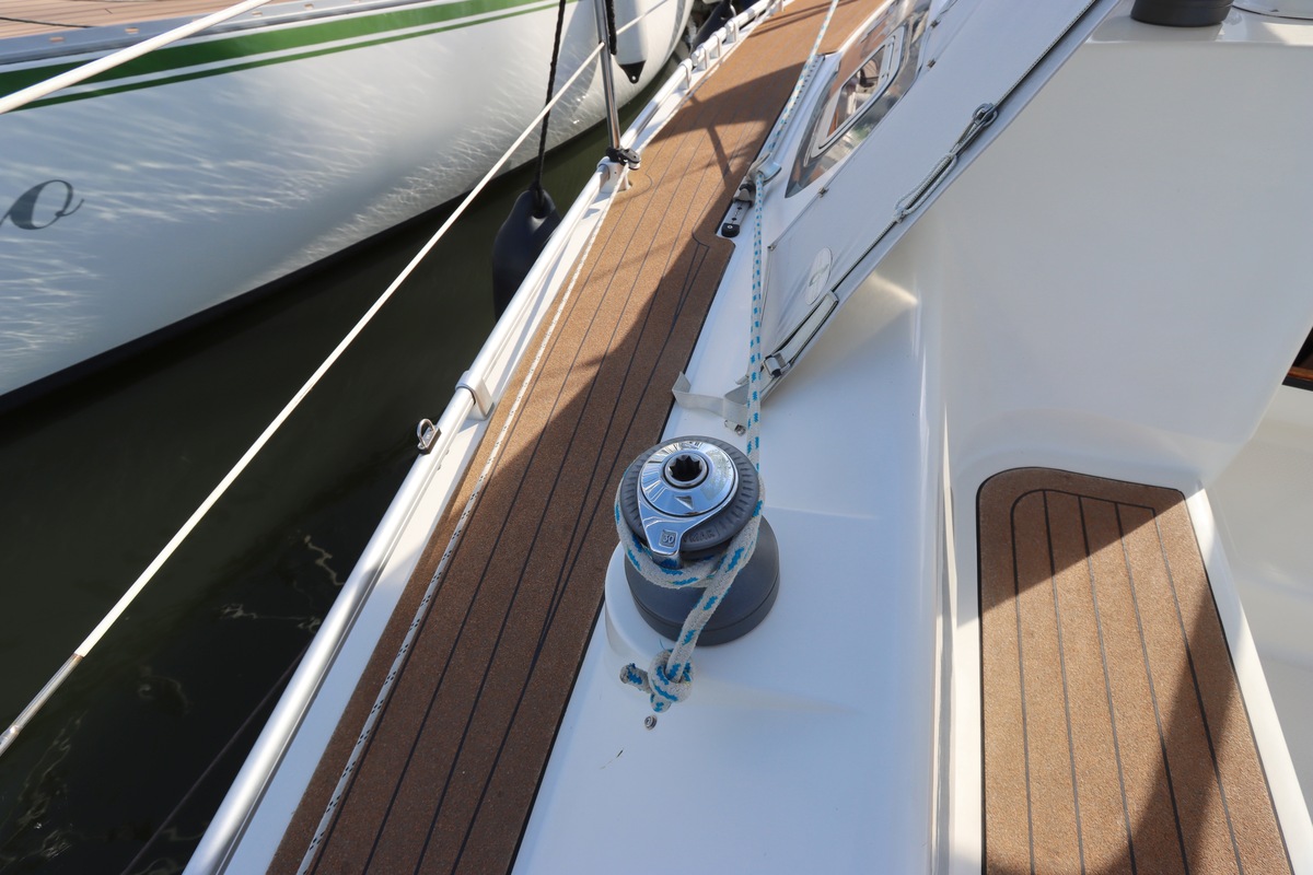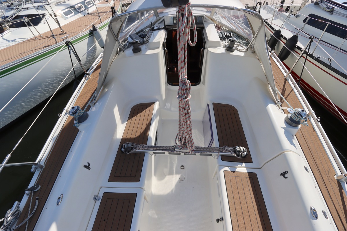 Het schip is onzinkbaar, snel en veilig – typisch Etap. Dankzij de ondiepe kiel (1,30 m) is deze zeilboot perfect voor binnenwater én kustvaart. De lichte salon is sfeervol afgewerkt met essen/notenhout en biedt een comfortabele zit, langskeuken en praktische navigatietafel.
