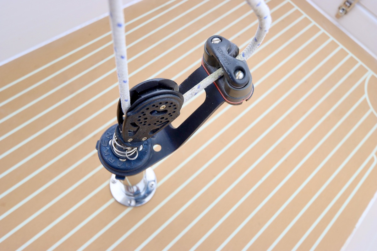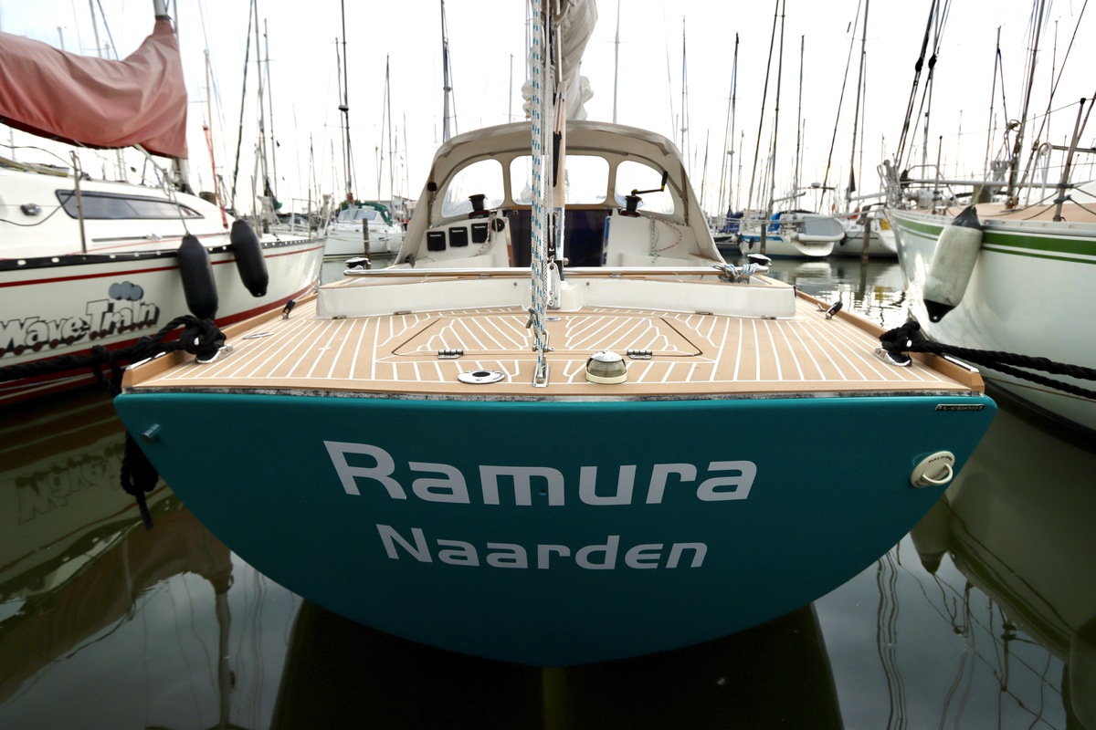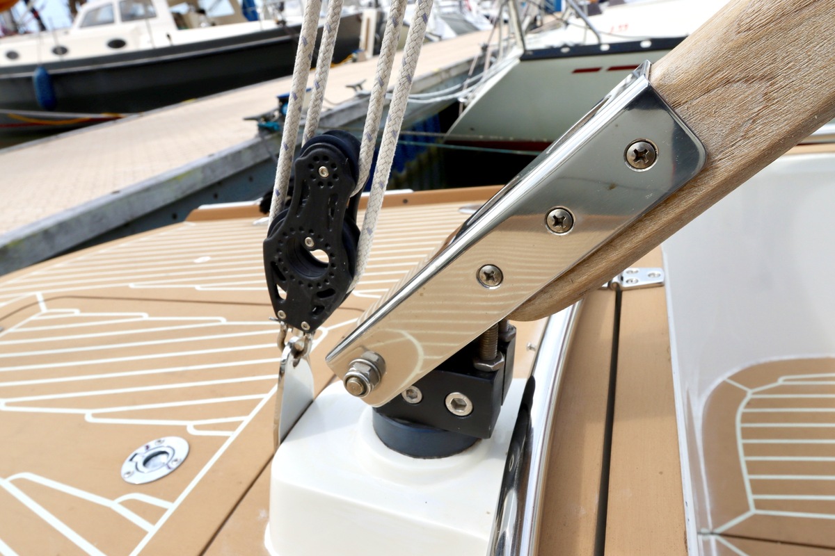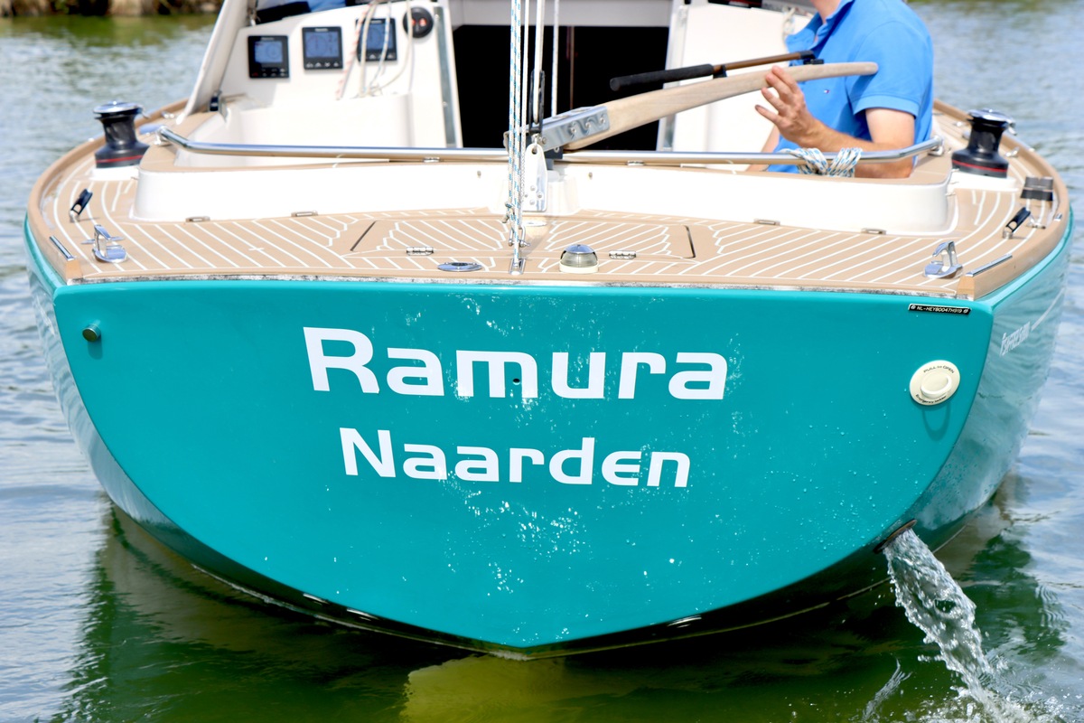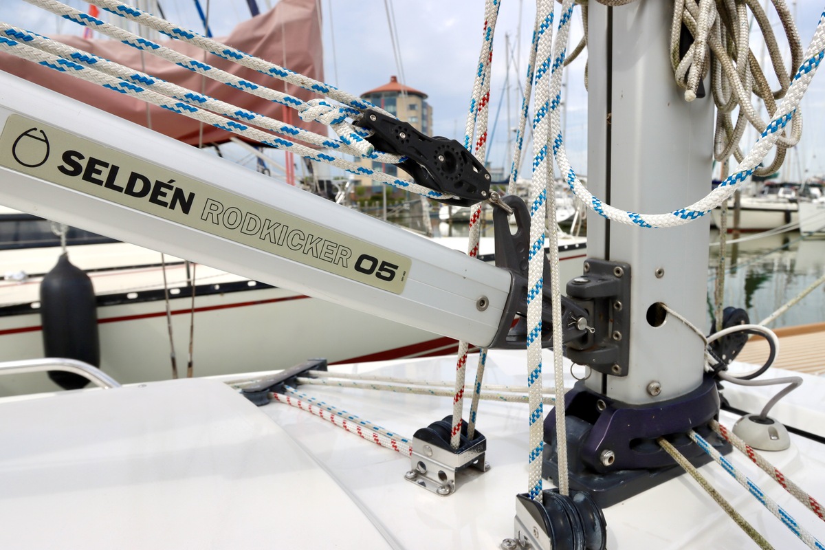 Dubbelreefbaar via enkellijns reefsysteem vanaf de kuip. Grootzeil in Lazybag en gedragen door een Selden Rodkicker.