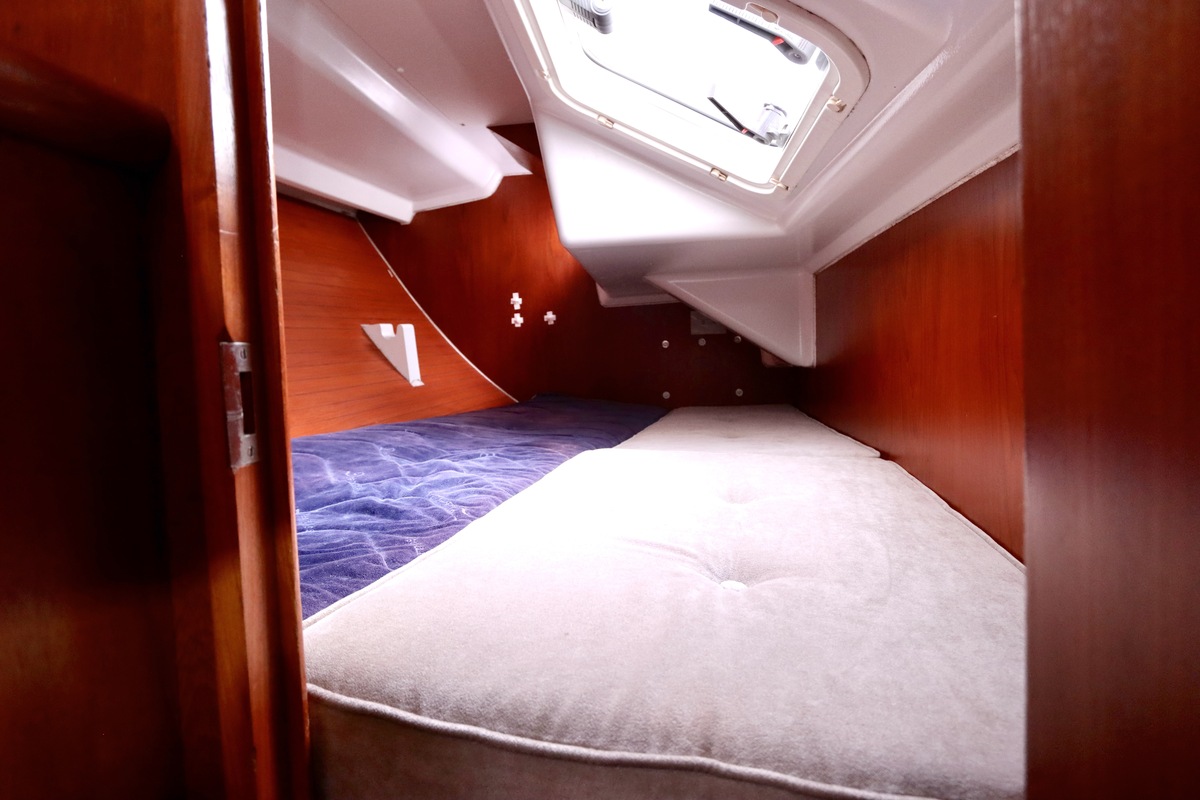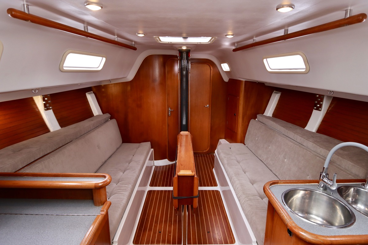 Het interieur is in teak gelakt en biedt drie hutten en een natte cel met douche en toilet. Voor extra comfort zijn zes nieuwe dimbare leeslampen in de salon geplaatst (12V) met USB-aansluiting, eveneens in 2022 vernieuwd.
