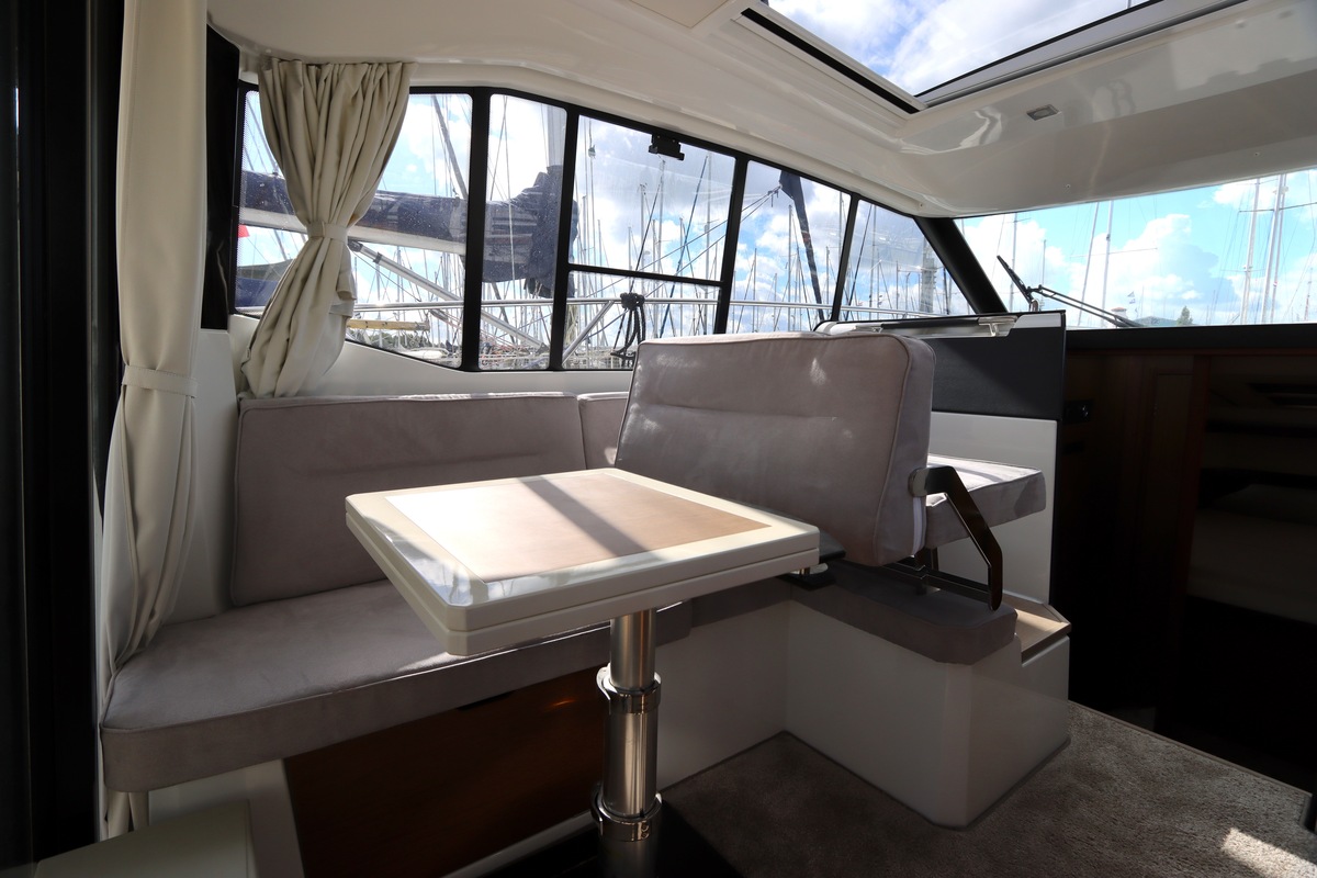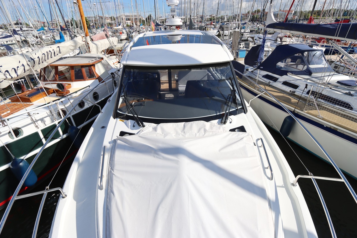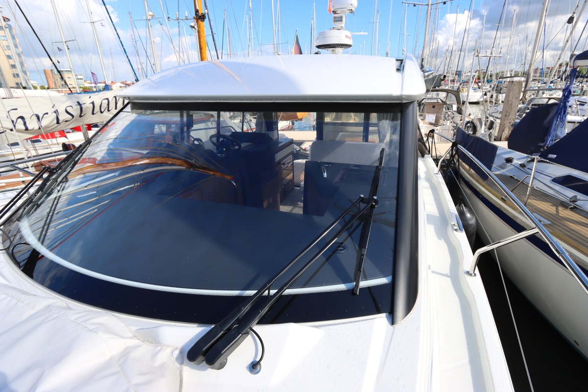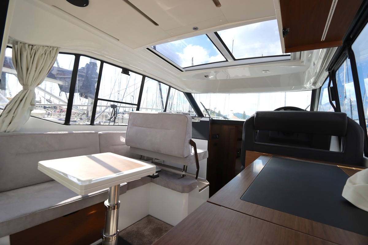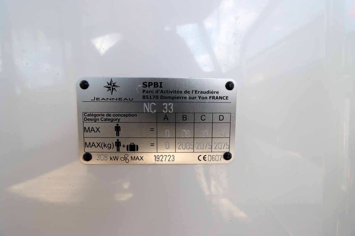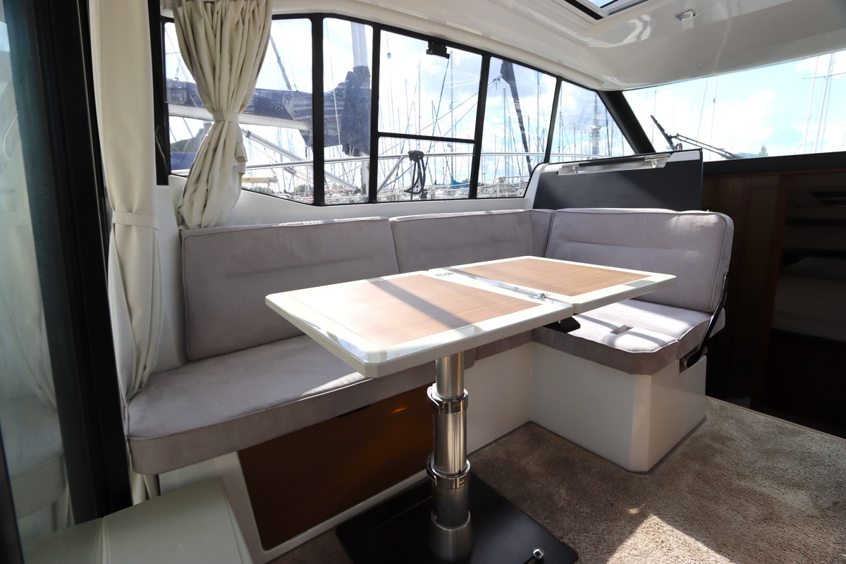 Met haar lengte van 10,5 meter, breedte van 3,27 meter en een diepgang van 0,96 meter biedt ze veel comfort, zowel binnen als buiten. Aan boord staan twee krachtige Volvo D3-motoren van elk 220 pk met joystickbesturing, goed voor moeiteloos manoeuvreren en uitstekende prestaties. De boot is gebouwd door Jeanneau en heeft een Polyester romp met een stabiele V-vorm, wat zorgt voor een soepele en veilige vaart. De salon is licht en modern ingericht, met bekleding in Pearl Grijs, een elektrisch schuifdak en een zitgroep die eenvoudig om te bouwen is tot zonnebed of extra slaapplaats.