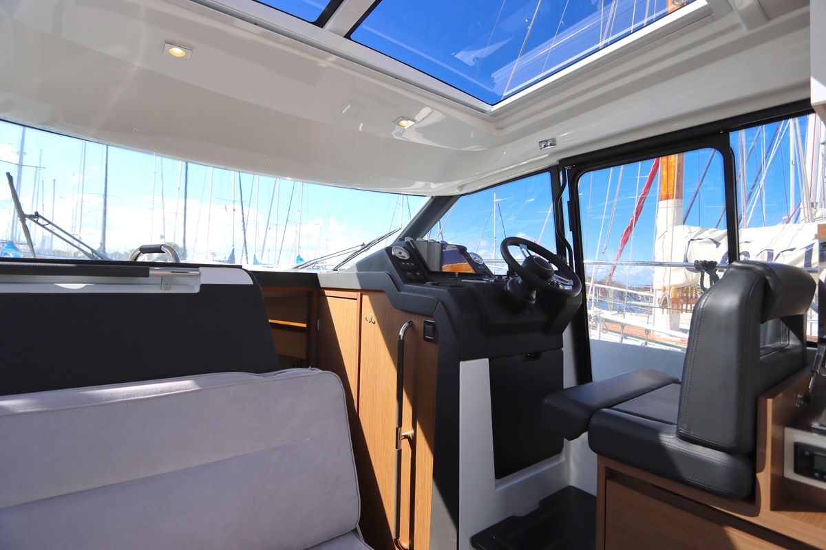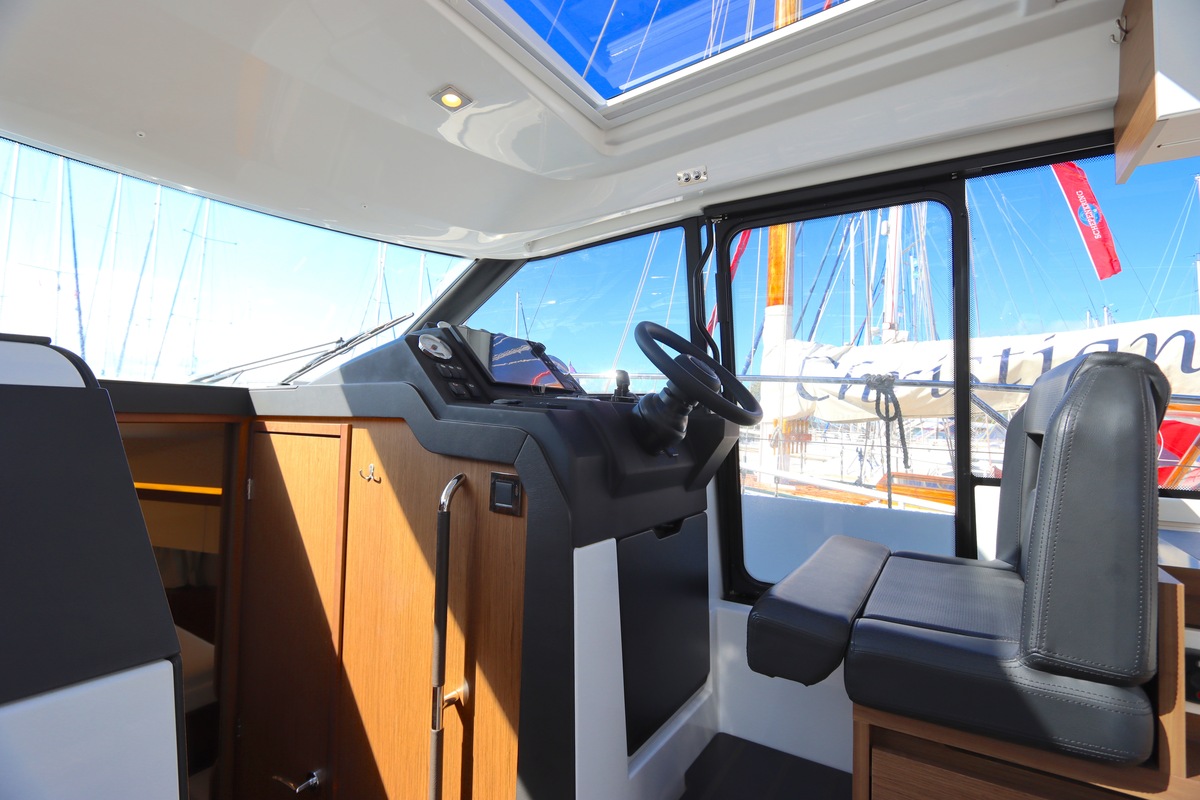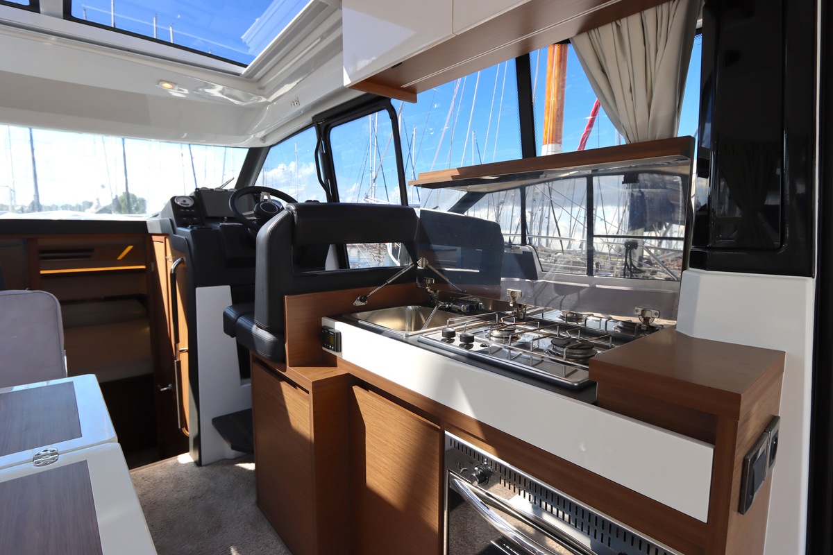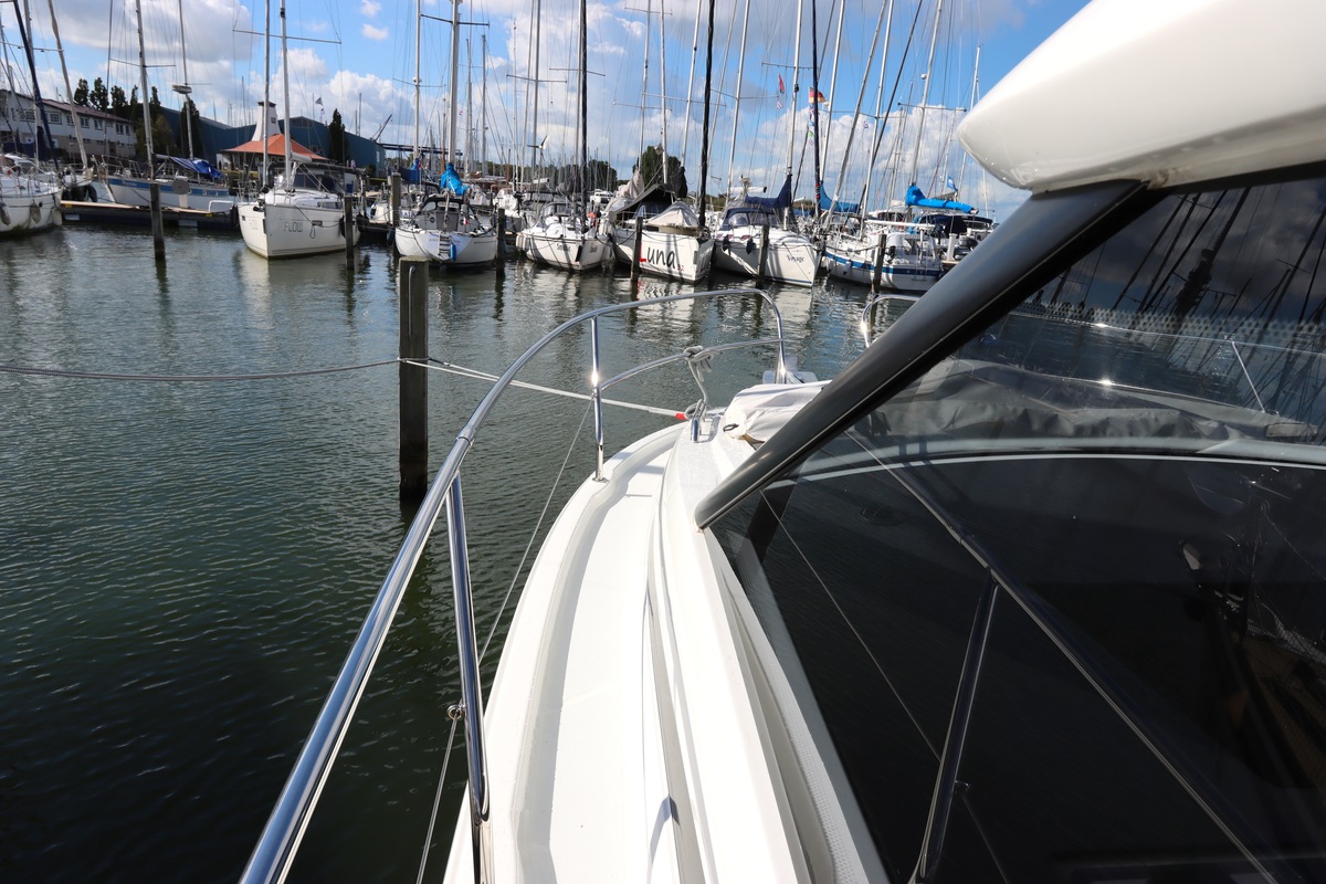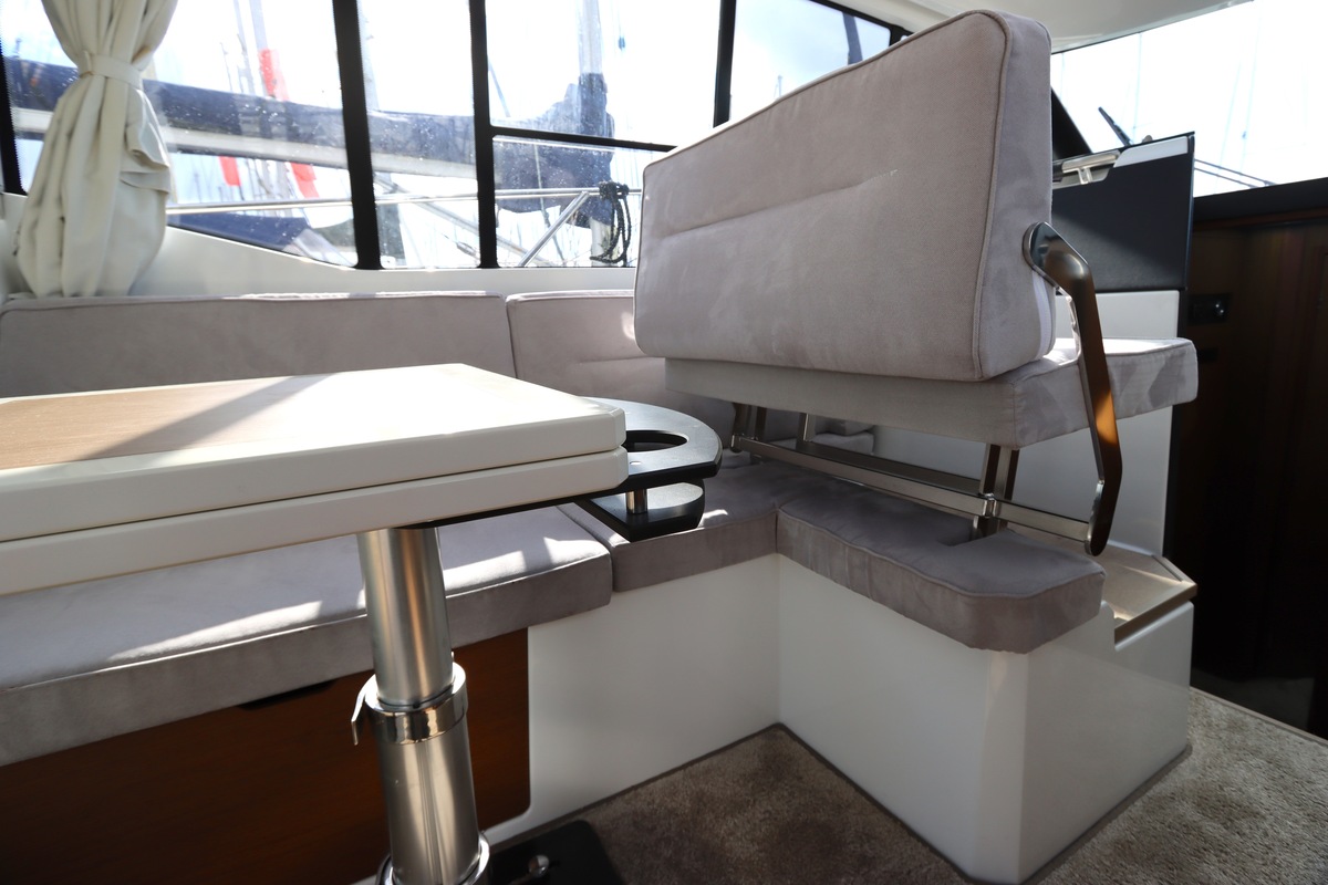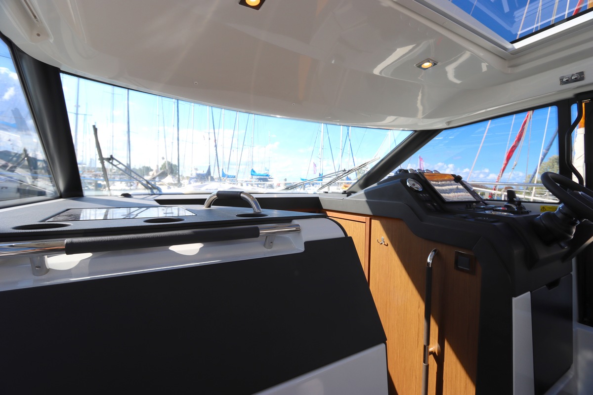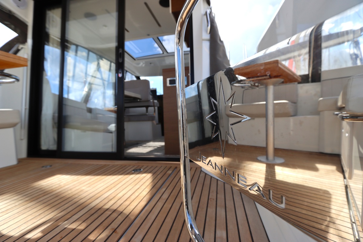Met haar lengte van 10,5 meter, breedte van 3,27 meter en een diepgang van 0,96 meter biedt ze veel comfort, zowel binnen als buiten. Aan boord staan twee krachtige Volvo D3-motoren van elk 220 pk met joystickbesturing, goed voor moeiteloos manoeuvreren en uitstekende prestaties. De boot is gebouwd door Jeanneau en heeft een Polyester romp met een stabiele V-vorm, wat zorgt voor een soepele en veilige vaart. De salon is licht en modern ingericht, met bekleding in Pearl Grijs, een elektrisch schuifdak en een zitgroep die eenvoudig om te bouwen is tot zonnebed of extra slaapplaats.