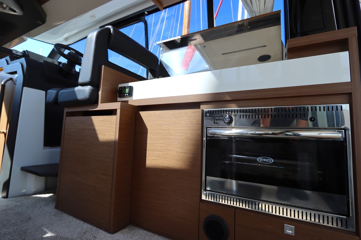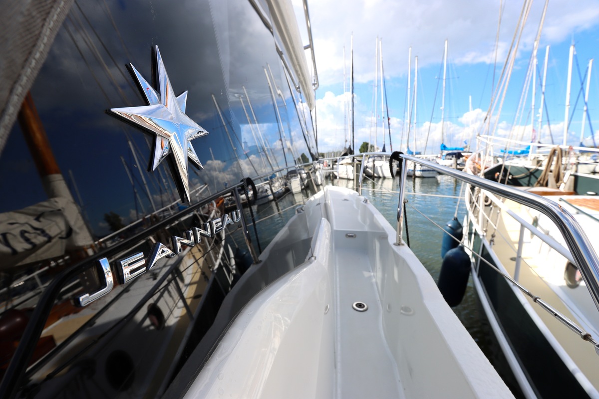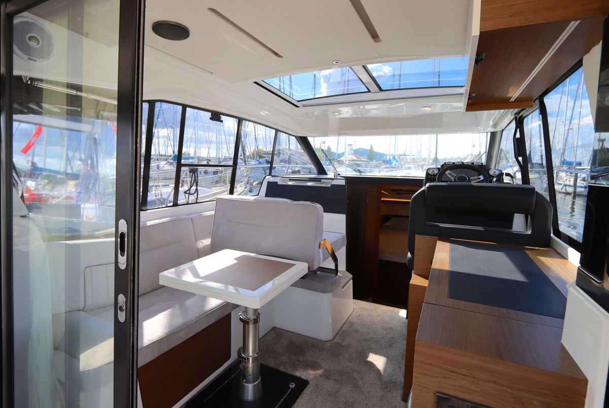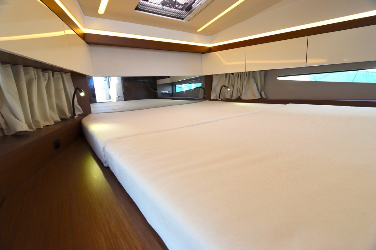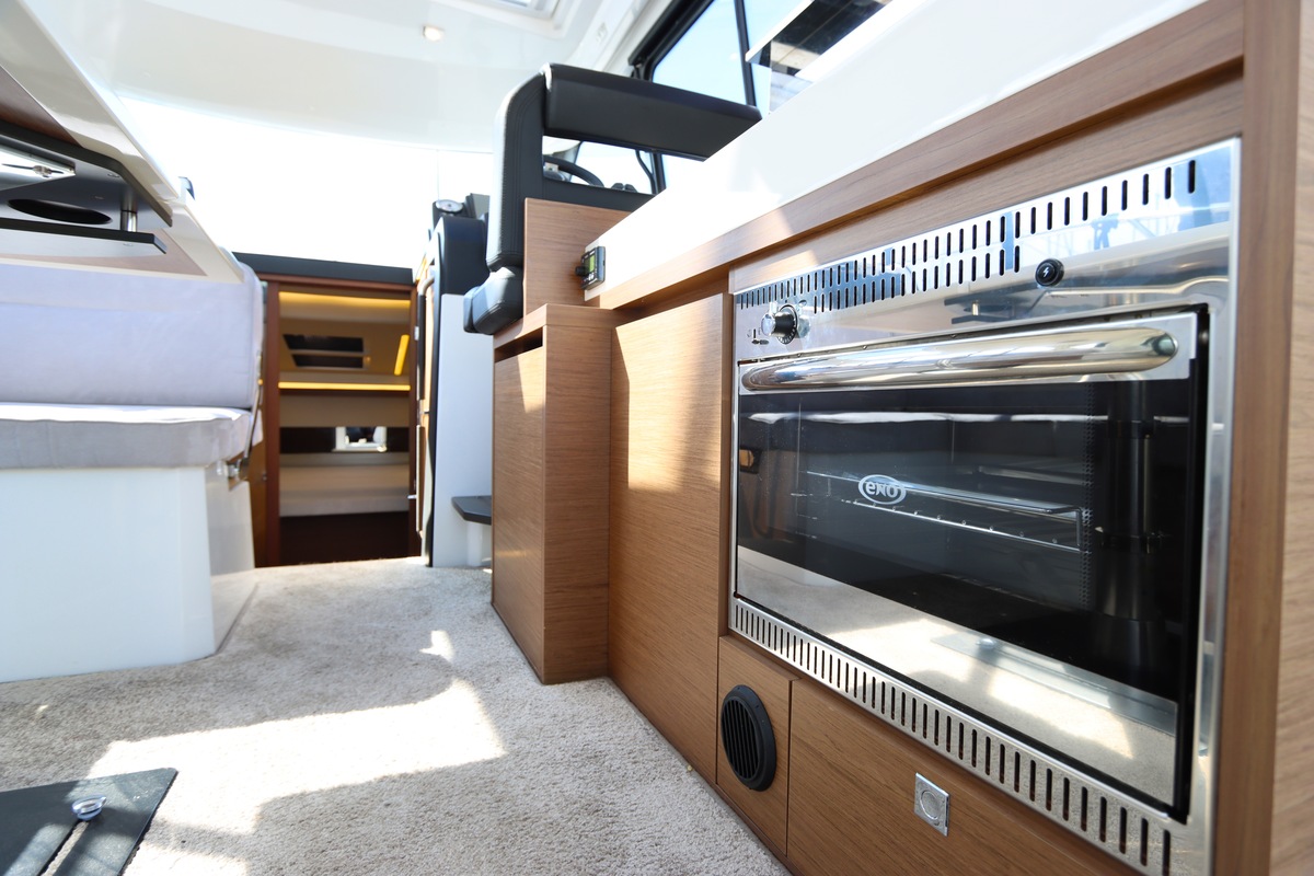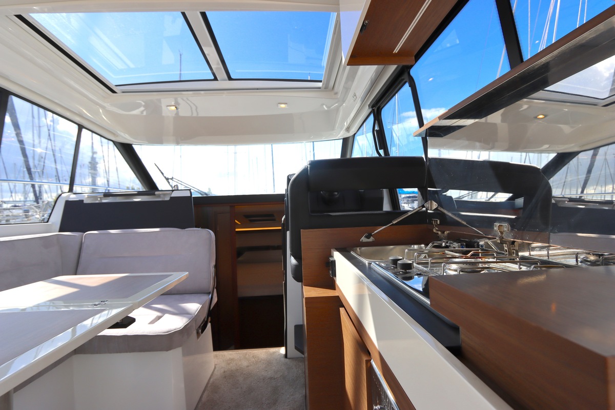 Met haar lengte van 10,5 meter, breedte van 3,27 meter en een diepgang van 0,96 meter biedt ze veel comfort, zowel binnen als buiten. Aan boord staan twee krachtige Volvo D3-motoren van elk 220 pk met joystickbesturing, goed voor moeiteloos manoeuvreren en uitstekende prestaties. De boot is gebouwd door Jeanneau en heeft een Polyester romp met een stabiele V-vorm, wat zorgt voor een soepele en veilige vaart. De salon is licht en modern ingericht, met bekleding in Pearl Grijs, een elektrisch schuifdak en een zitgroep die eenvoudig om te bouwen is tot zonnebed of extra slaapplaats.