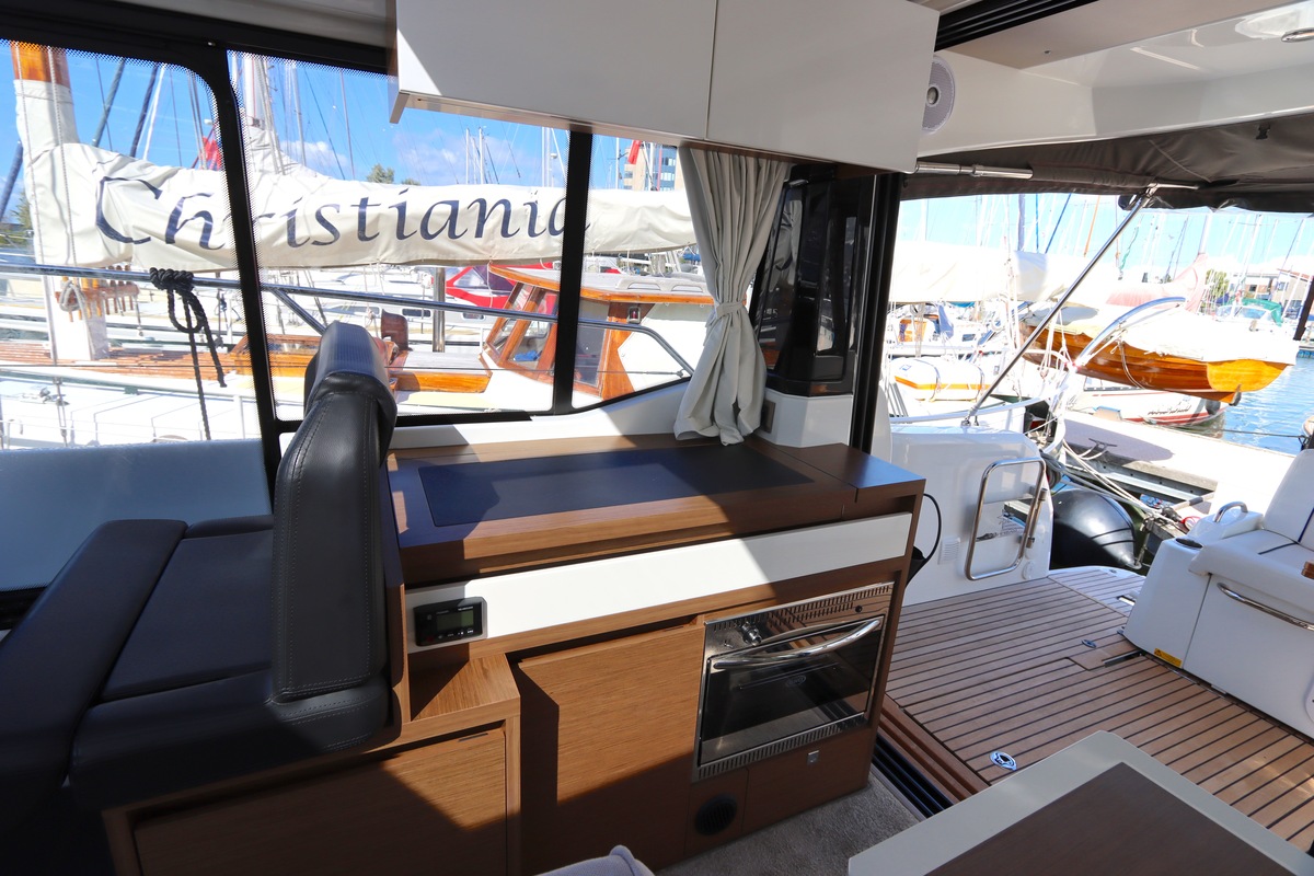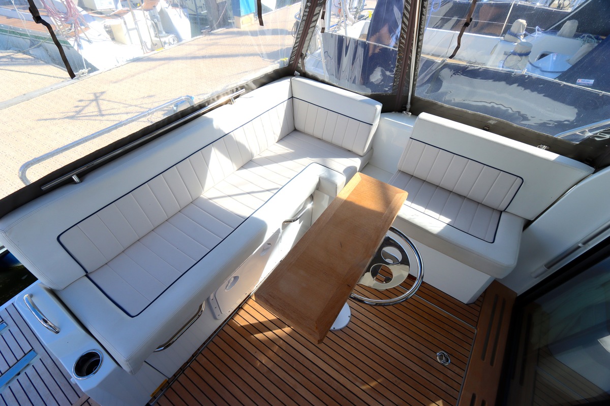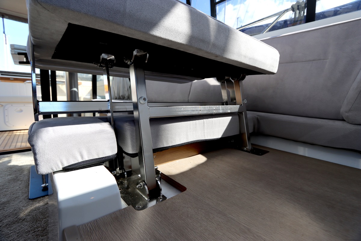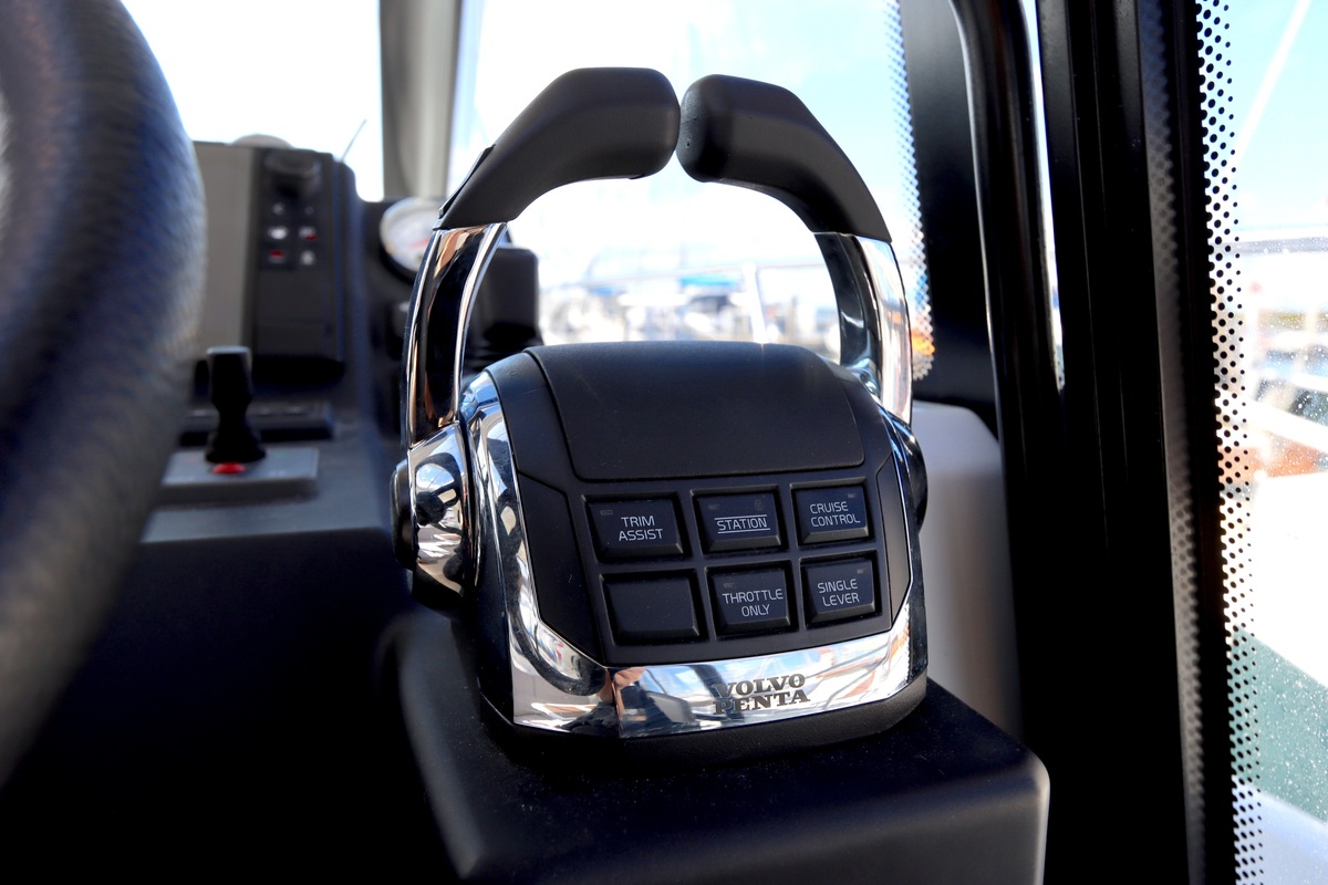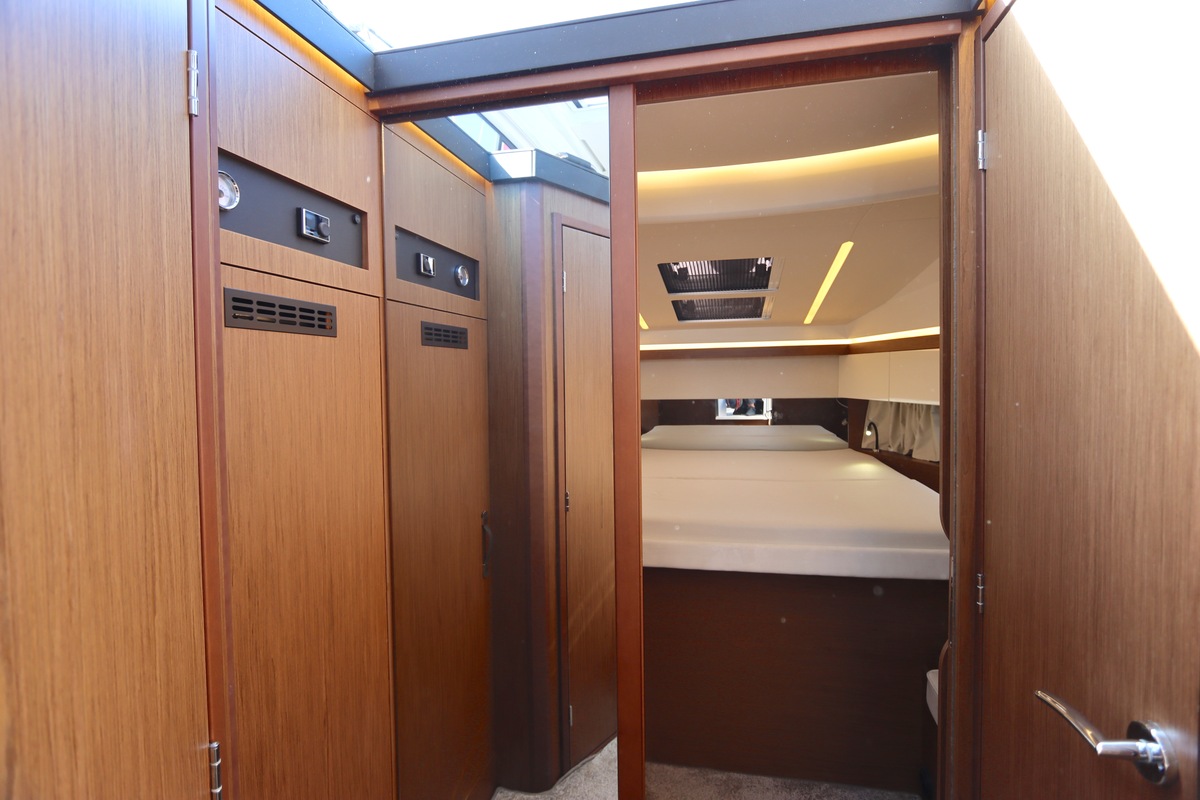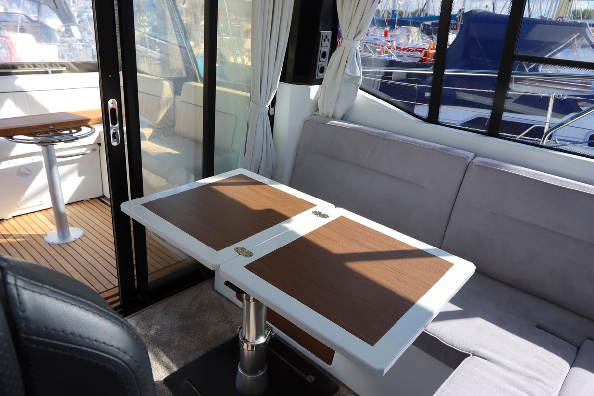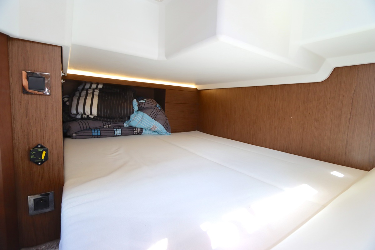 Met haar lengte van 10,5 meter, breedte van 3,27 meter en een diepgang van 0,96 meter biedt ze veel comfort, zowel binnen als buiten. Aan boord staan twee krachtige Volvo D3-motoren van elk 220 pk met joystickbesturing, goed voor moeiteloos manoeuvreren en uitstekende prestaties. De boot is gebouwd door Jeanneau en heeft een Polyester romp met een stabiele V-vorm, wat zorgt voor een soepele en veilige vaart. De salon is licht en modern ingericht, met bekleding in Pearl Grijs, een elektrisch schuifdak en een zitgroep die eenvoudig om te bouwen is tot zonnebed of extra slaapplaats.