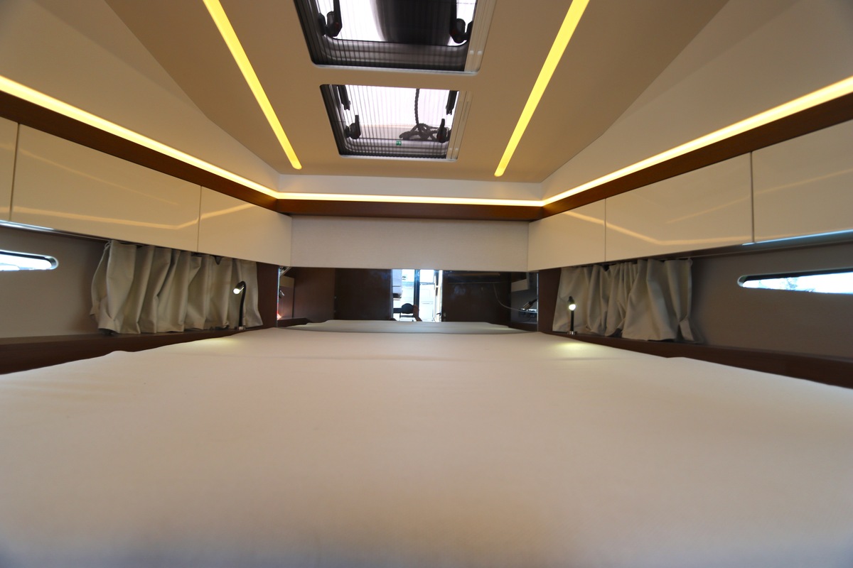Salonbekleding Pearl Grijs, Elektrisch schuifdak Cockpitbekleding wit Creme Blauw, om te bouwen tot zonnebed. Dubbelbed in salon.