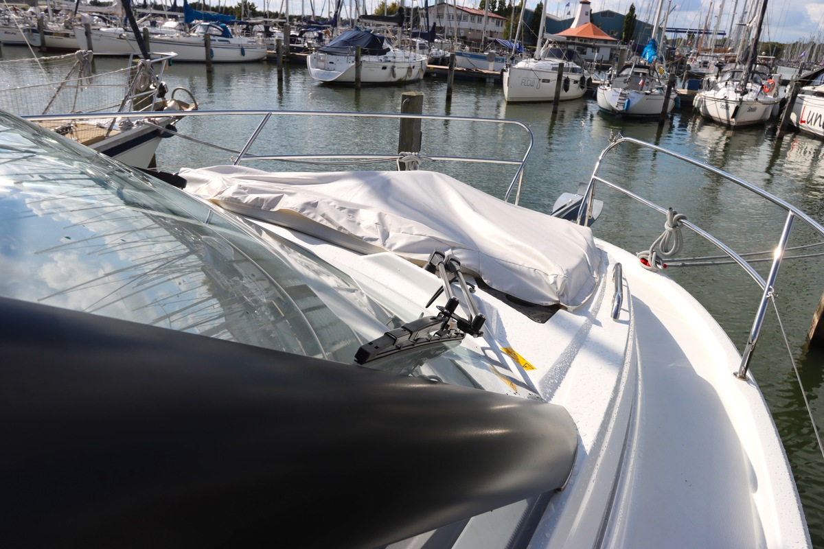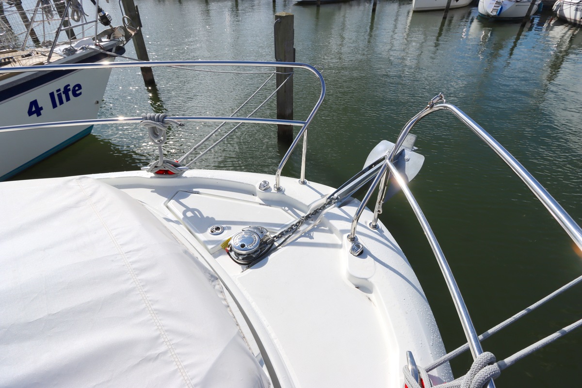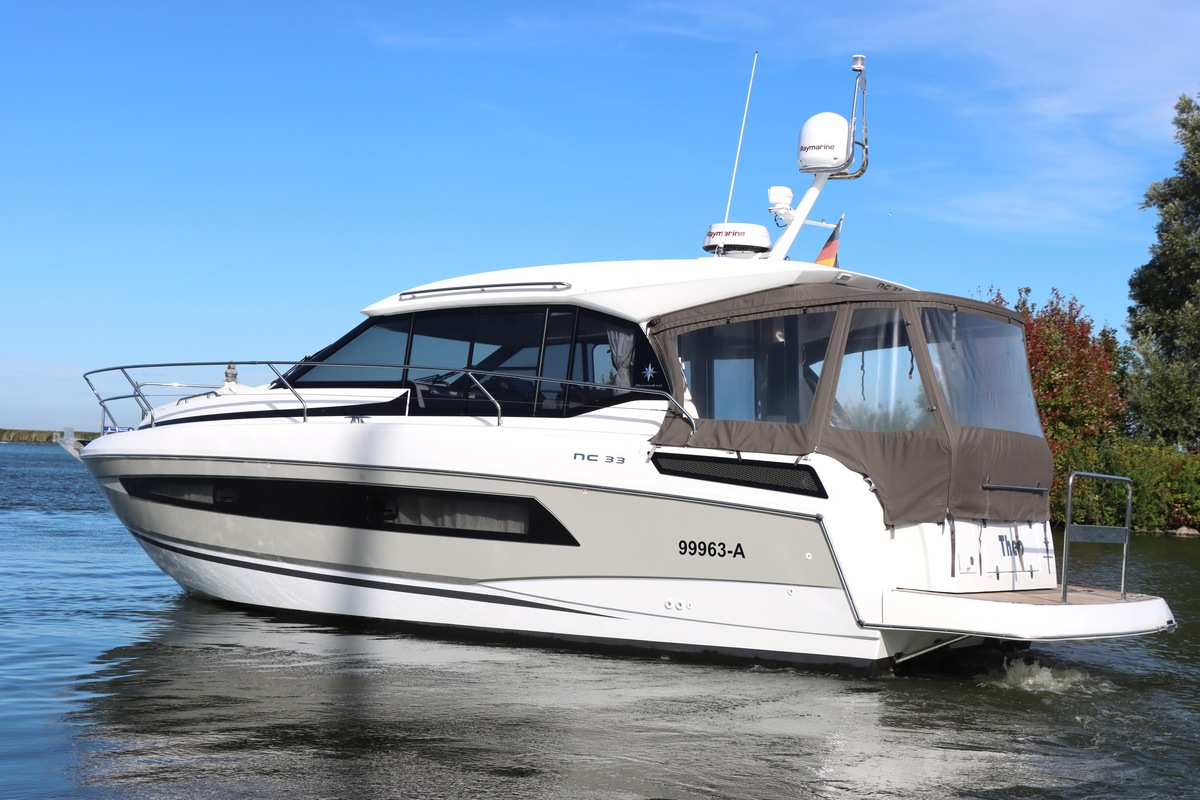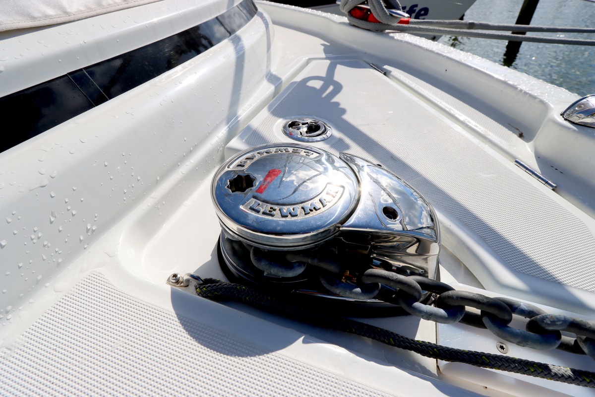 Met elektrisch ankerlier, kuiptent, zwemplatform en complete veiligheidsuitrusting is deze Jeanneau NC 33 volledig vaarklaar.