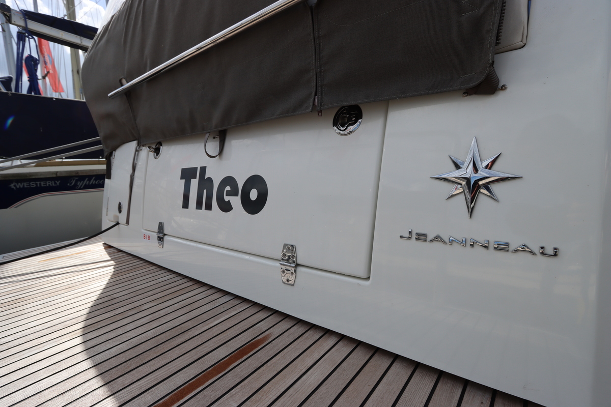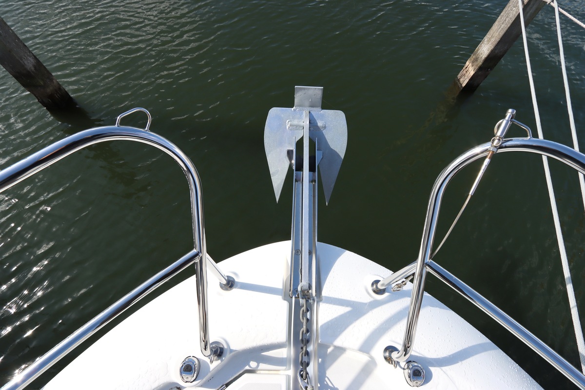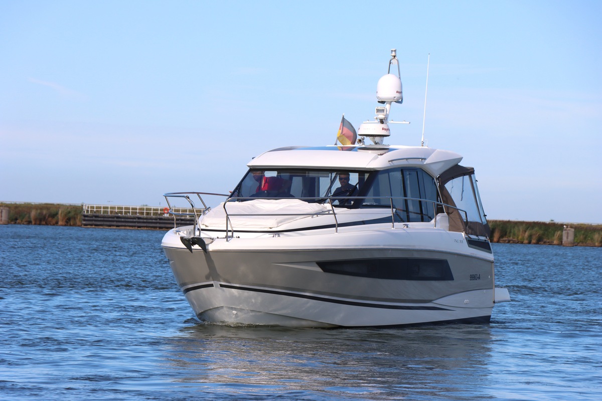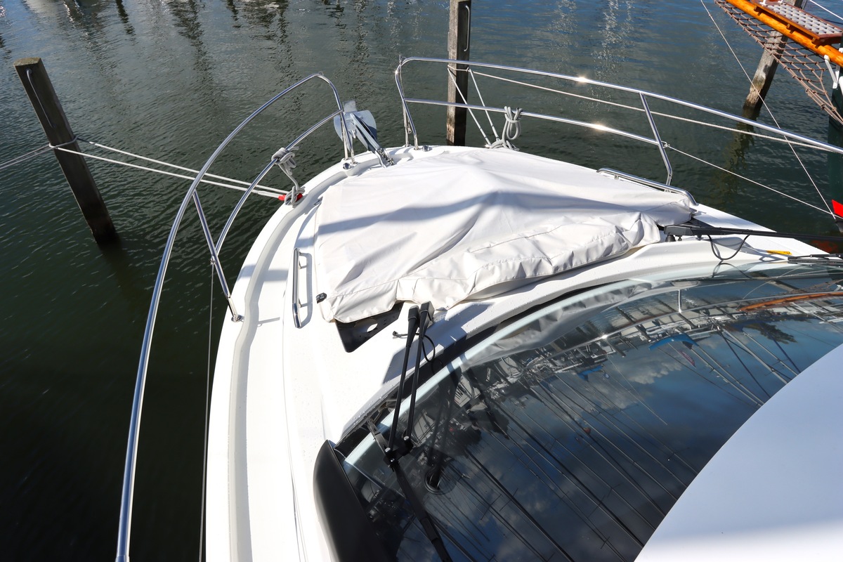 Met elektrisch ankerlier, kuiptent, zwemplatform en complete veiligheidsuitrusting is deze Jeanneau NC 33 volledig vaarklaar.