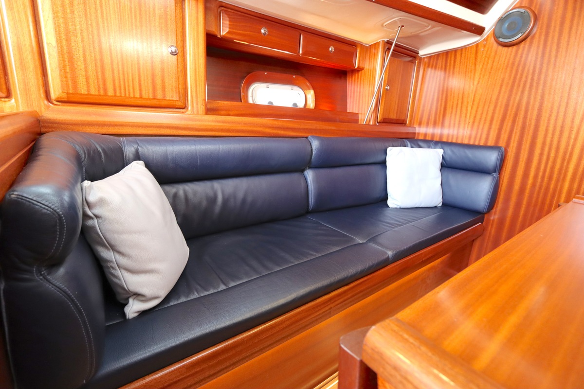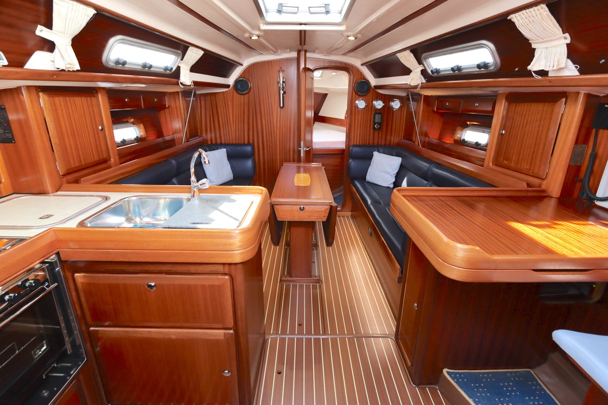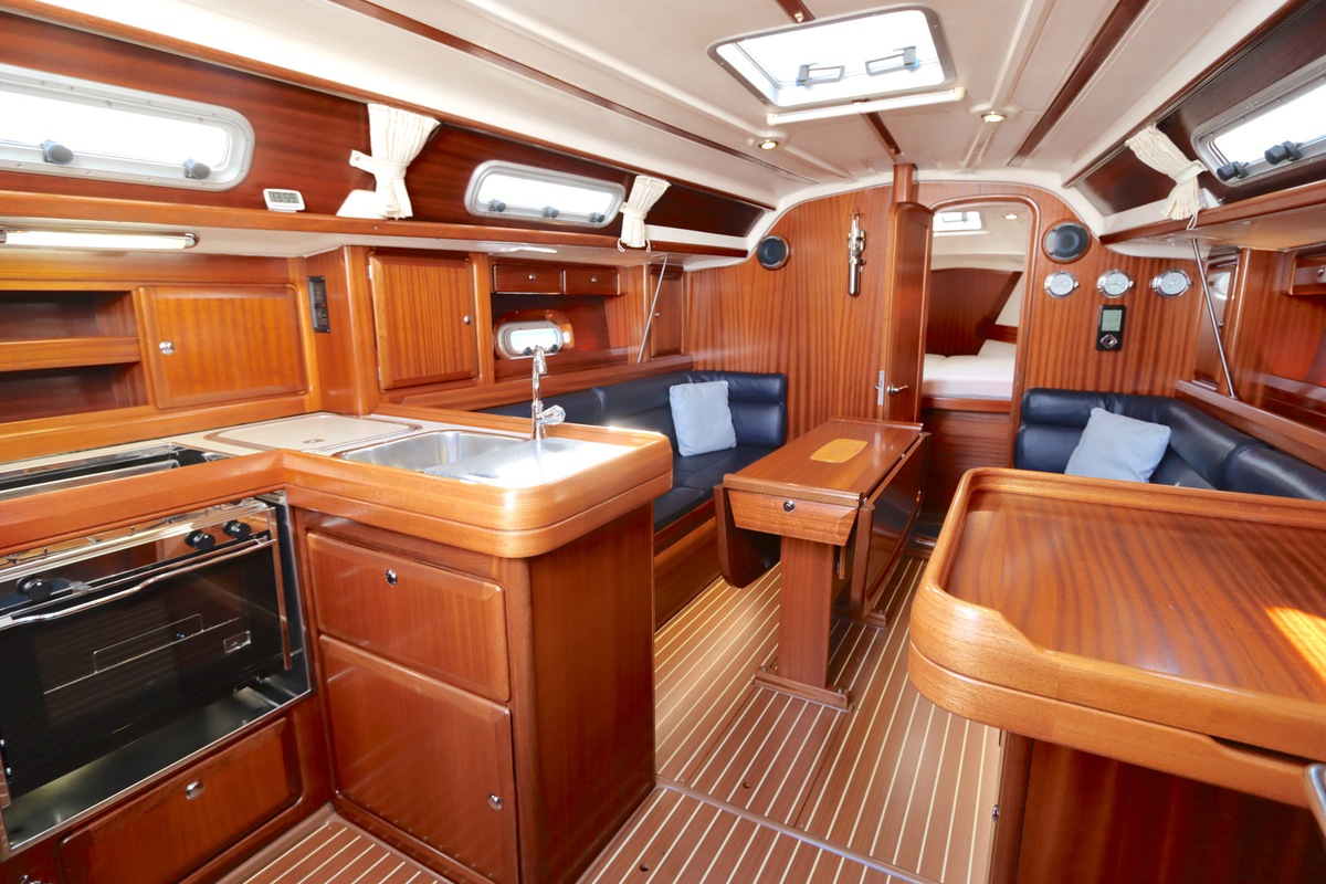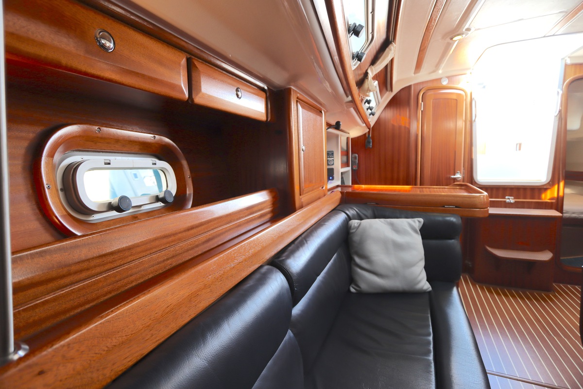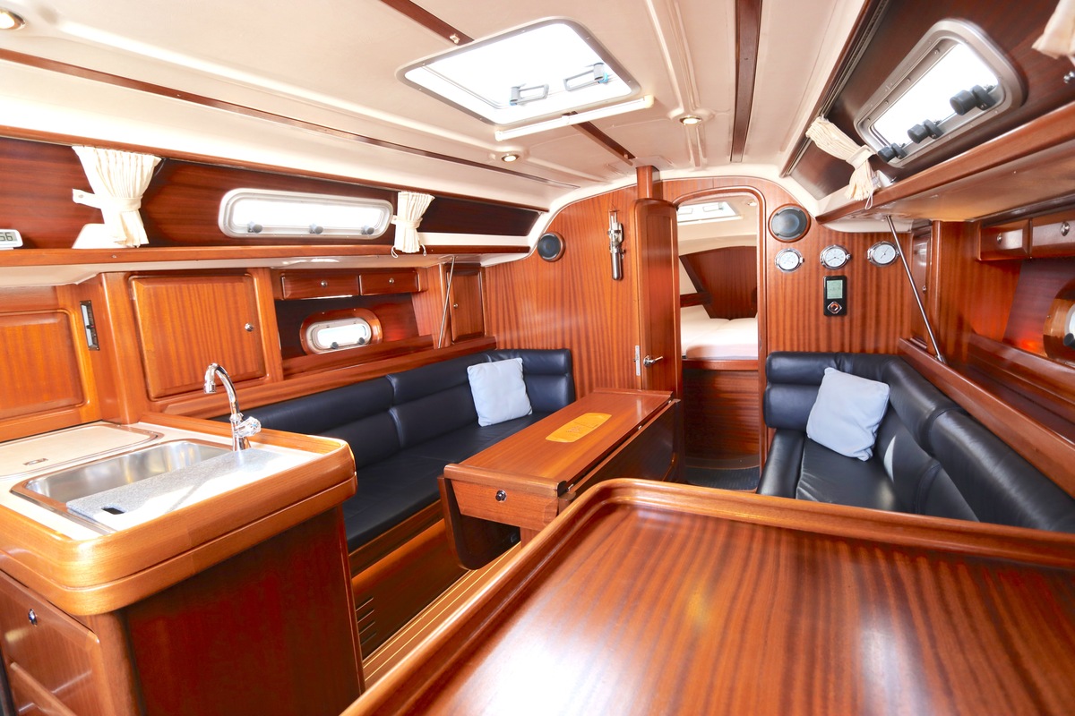 Binnen treft u een ruime en gezellige salon met lederen bekleding en houtwerk dat nog altijd in nieuwstaat verkeert. Er zijn twee hutten en extra slaapplaatsen in de salon, in totaal geschikt voor 4 tot 6 personen. Voorzieningen zoals verwarming (Eberspächer), een Pioneer radio/CD-speler en een nette kombuis maken langere verblijven aan boord comfortabel.