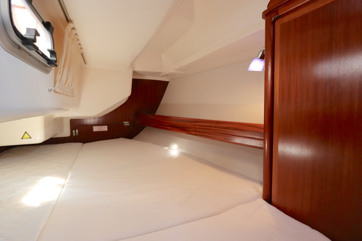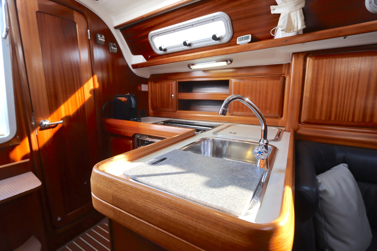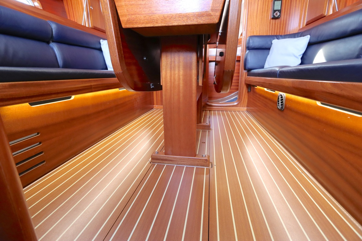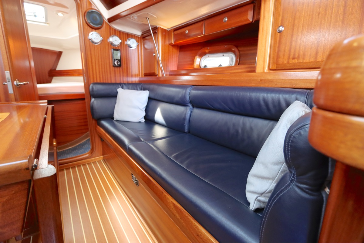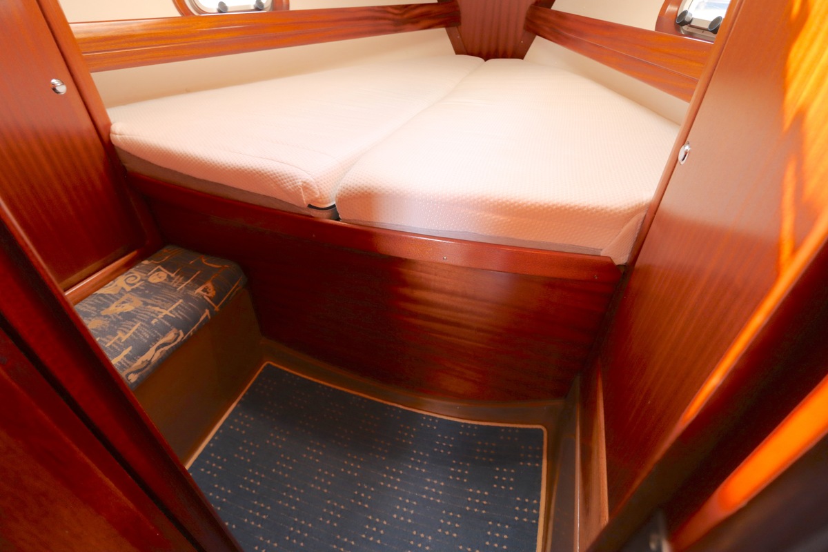 Binnen treft u een ruime en gezellige salon met lederen bekleding en houtwerk dat nog altijd in nieuwstaat verkeert. Er zijn twee hutten en extra slaapplaatsen in de salon, in totaal geschikt voor 4 tot 6 personen. Voorzieningen zoals verwarming (Eberspächer), een Pioneer radio/CD-speler en een nette kombuis maken langere verblijven aan boord comfortabel.