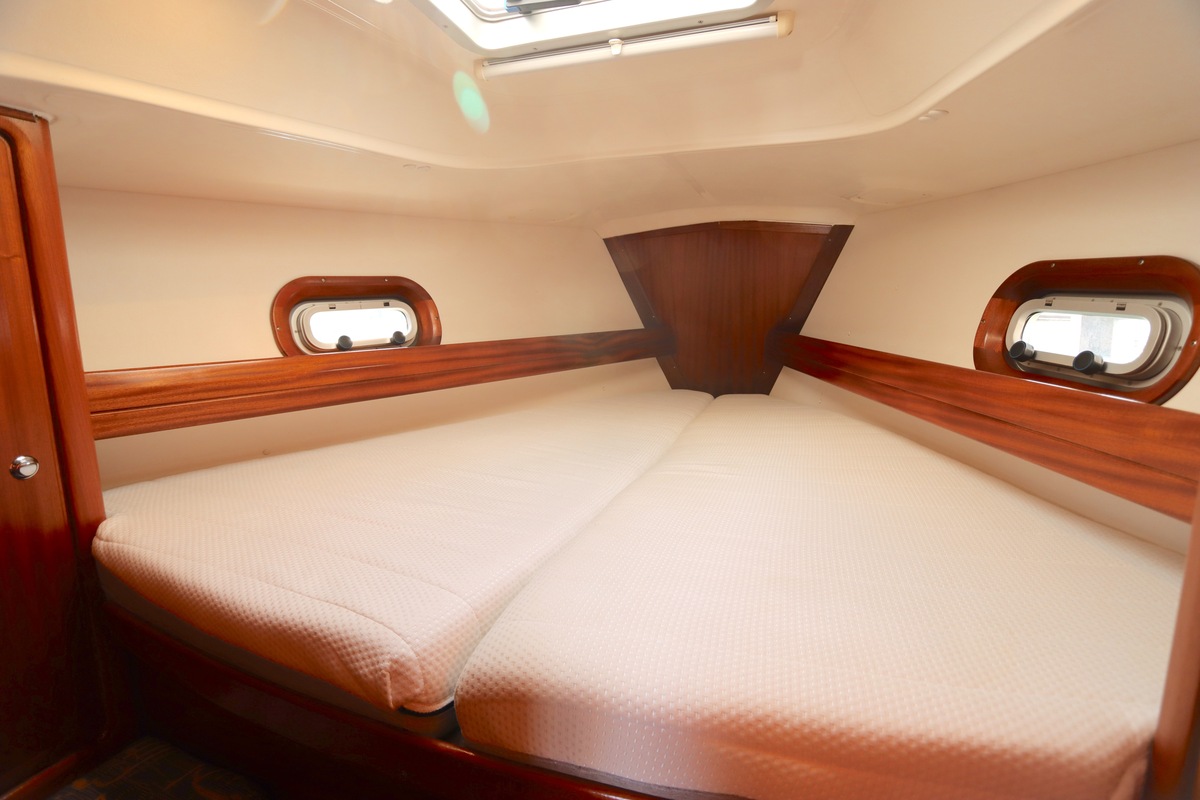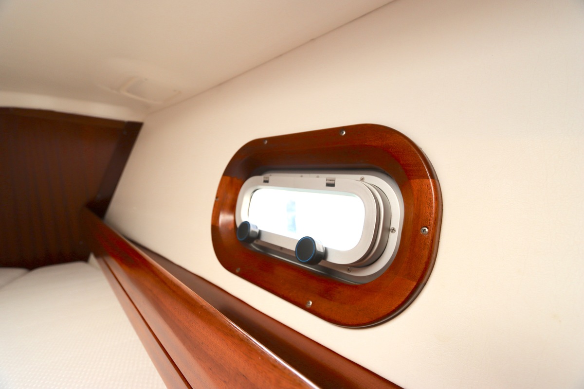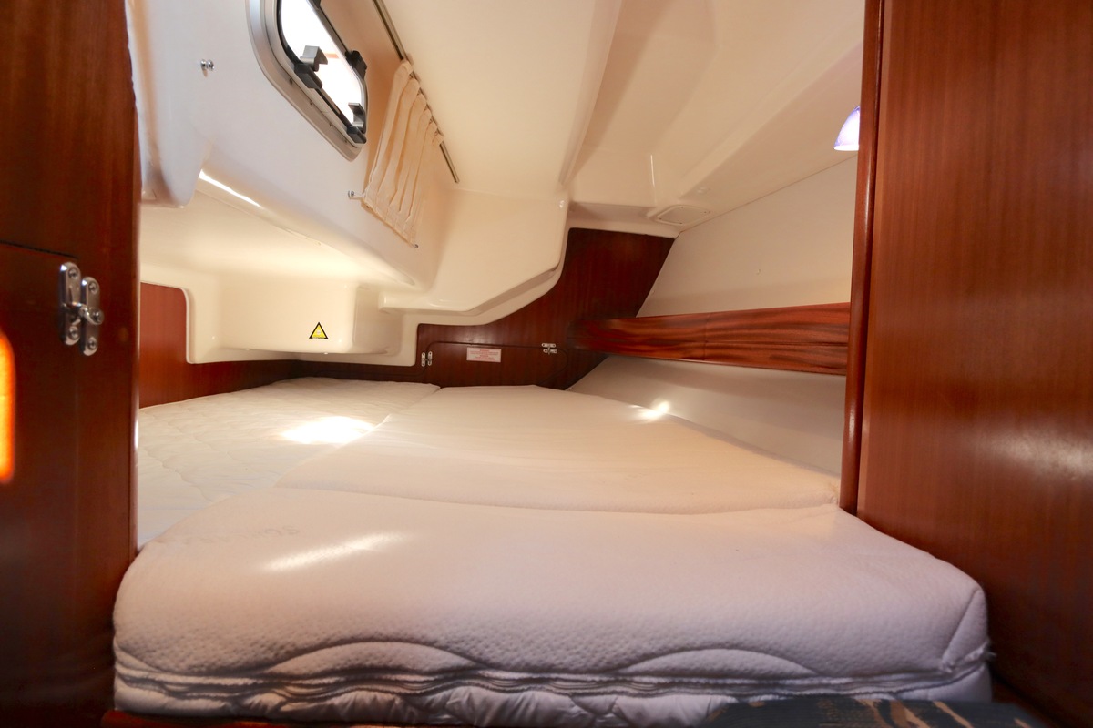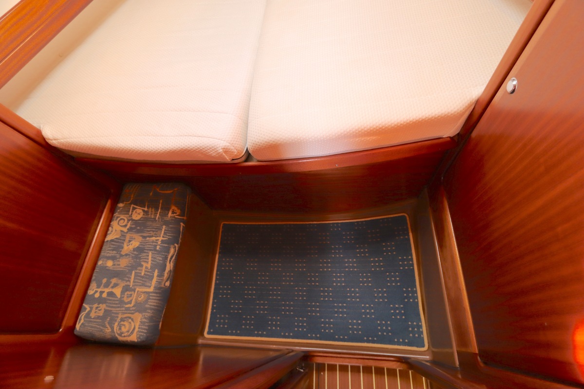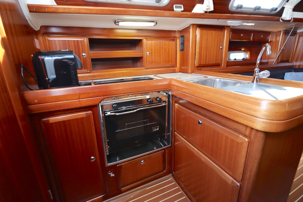 Binnen treft u een ruime en gezellige salon met lederen bekleding en houtwerk dat nog altijd in nieuwstaat verkeert. Er zijn twee hutten en extra slaapplaatsen in de salon, in totaal geschikt voor 4 tot 6 personen. Voorzieningen zoals verwarming (Eberspächer), een Pioneer radio/CD-speler en een nette kombuis maken langere verblijven aan boord comfortabel.