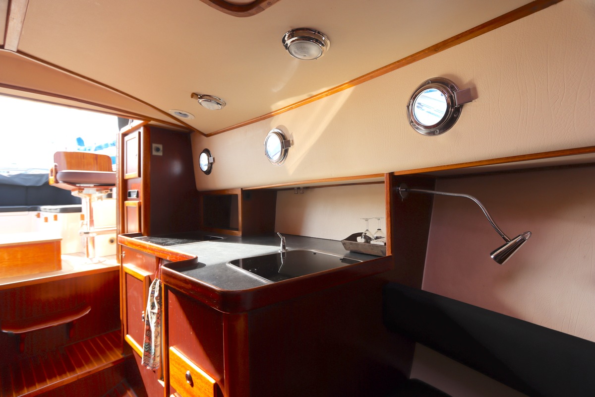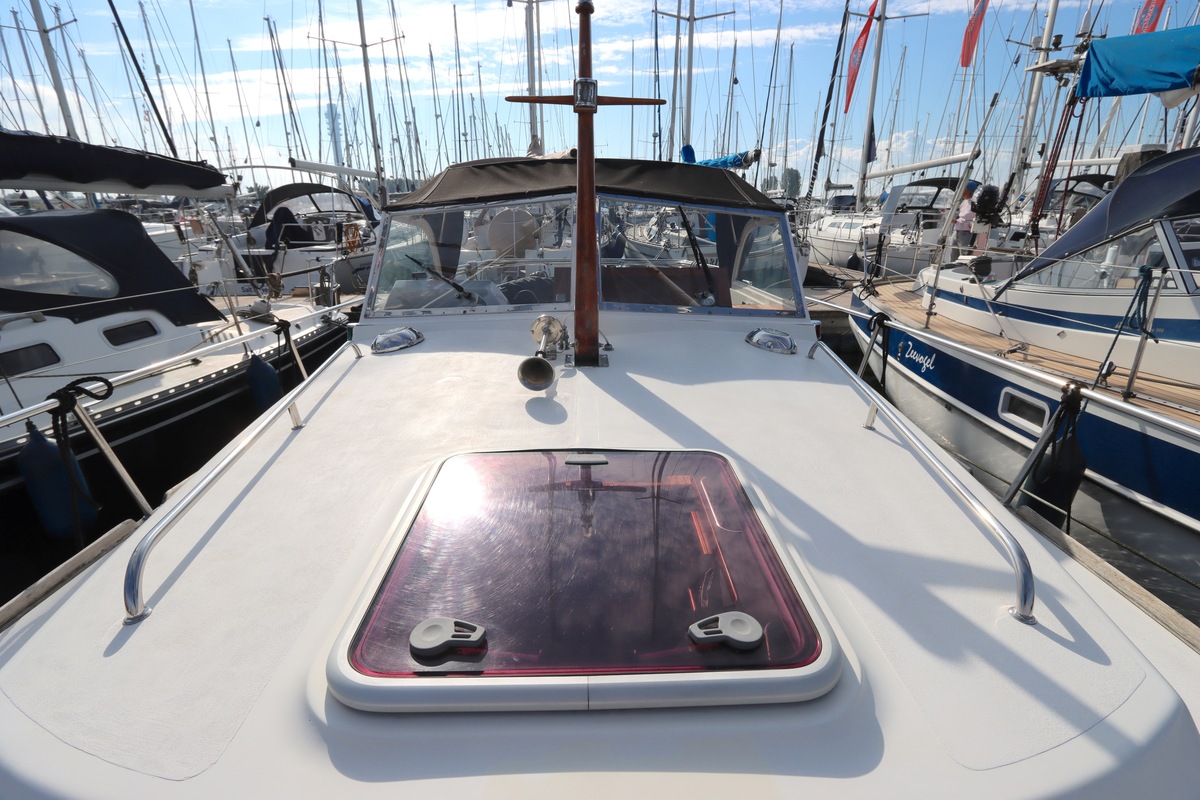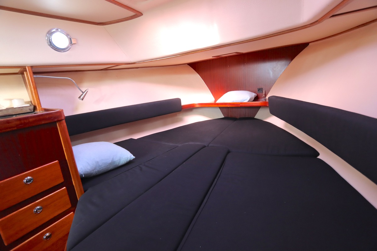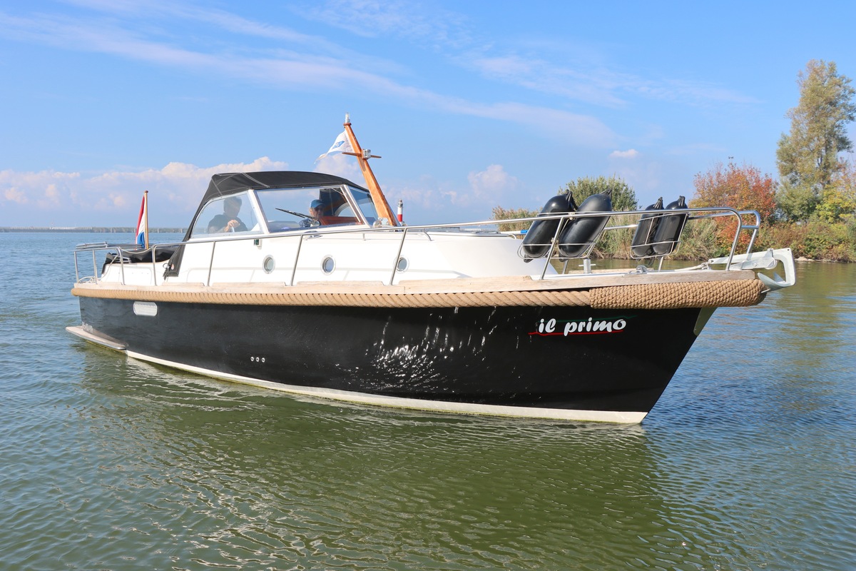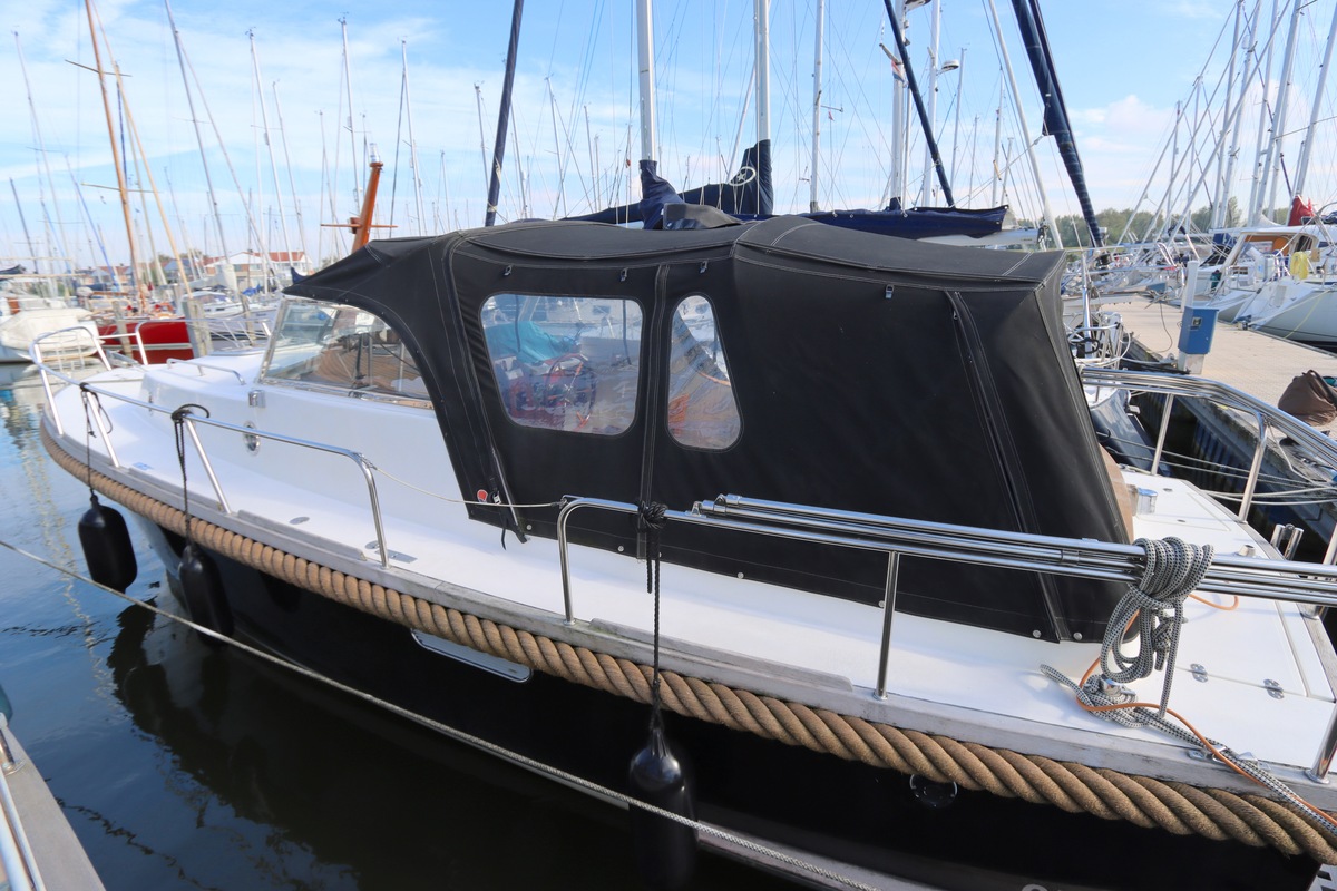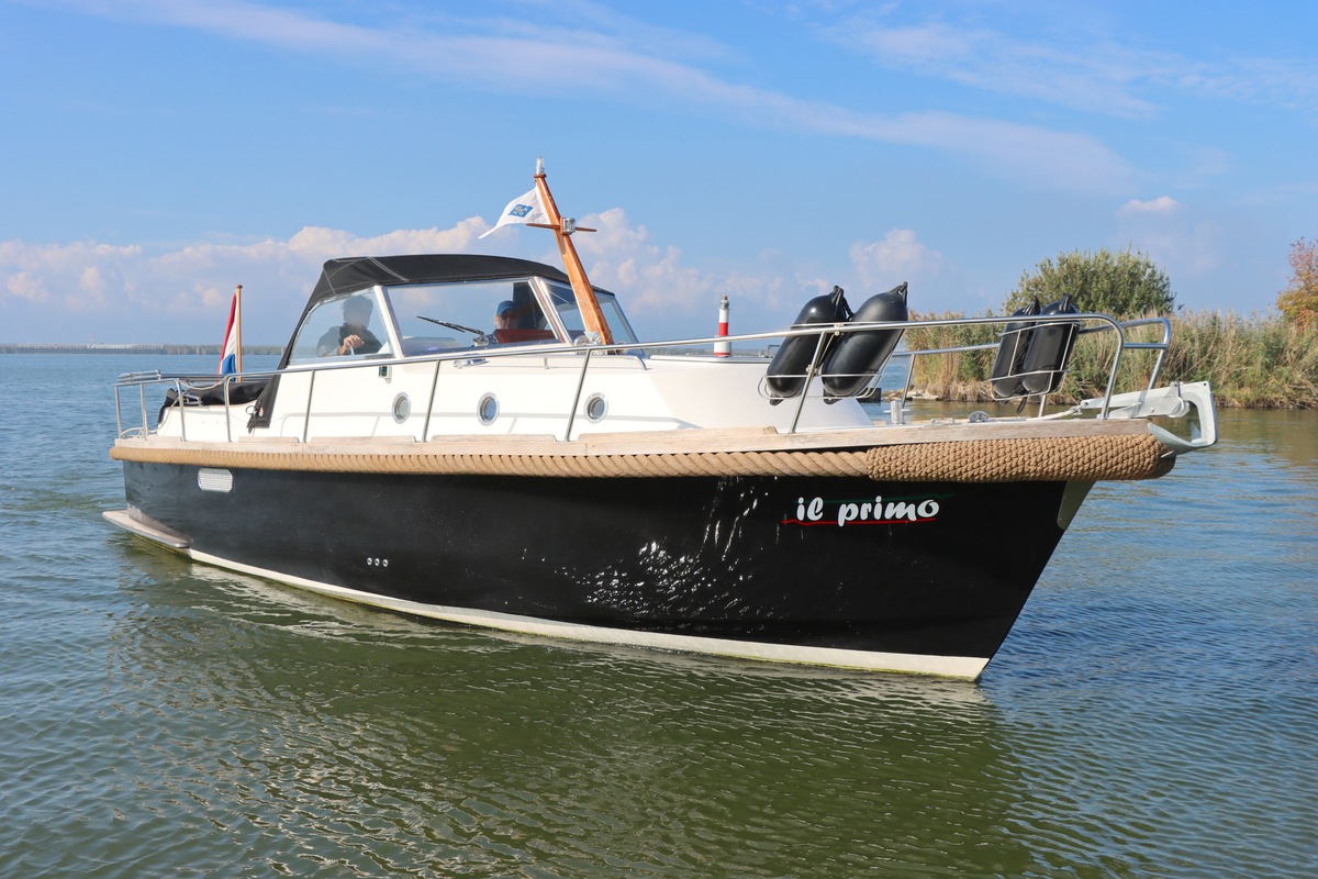 De ruime open kuip met teakvloer, U-bank en dubbele stuurstoel biedt comfort en gezelligheid. Binnen vind je een kajuit met kombuis, badkamer en slaapplaatsen voor twee personen. Voorzien van boeg- en hekschroef, verwarming, koelkast en moderne elektra.