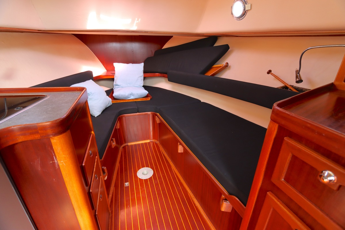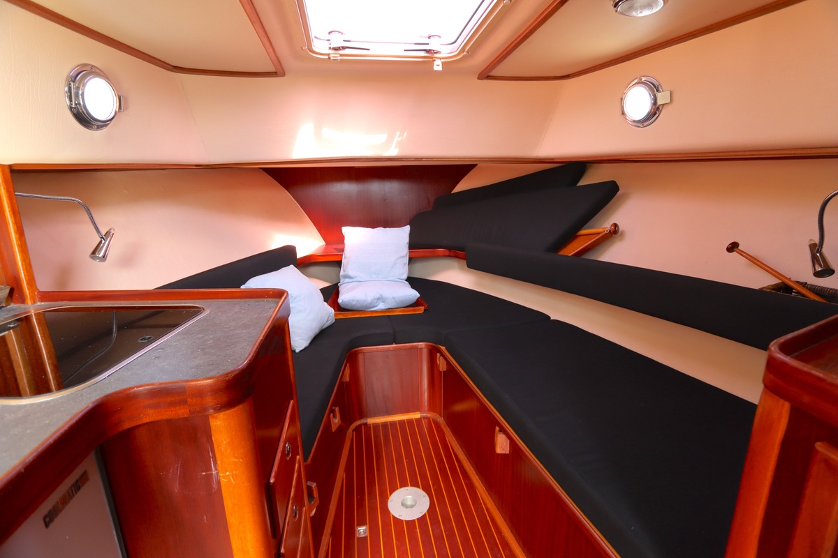 Open kuip met tafek en U-bank, stuurstand met dubbele stuurstoel, kajuit met kombuis, badkamer, langsbanken/2-persoonsbed
