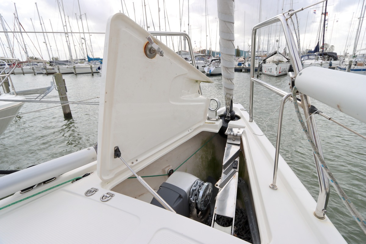 Ploegschaaranker, 50 meter ketting. Boegbeslag voor het anker is inklapbaar.