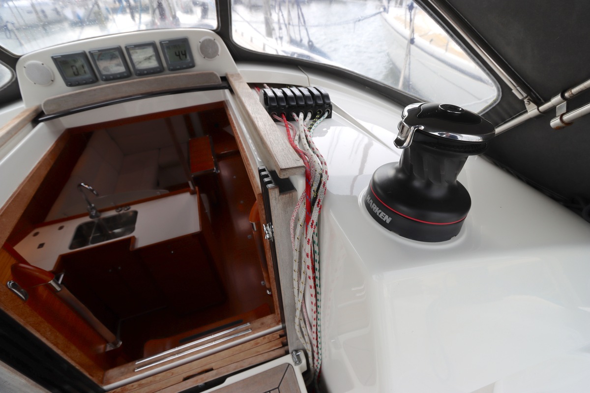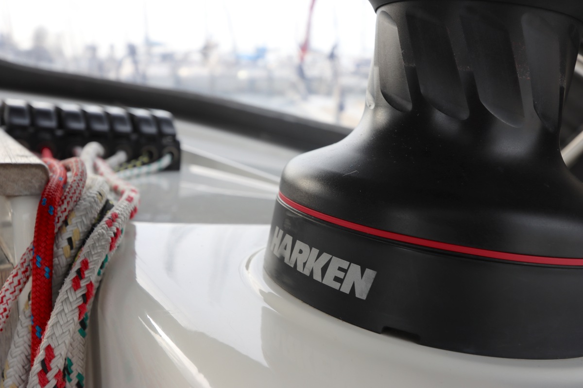 2012, 103m31 elektrische lier Harken St50 tbv grootzeilval op dak kajuit onder buiskap.