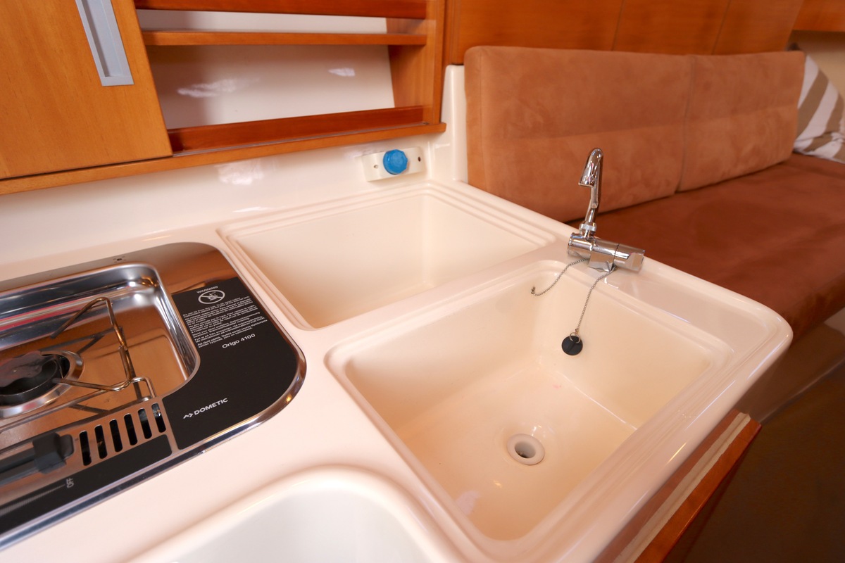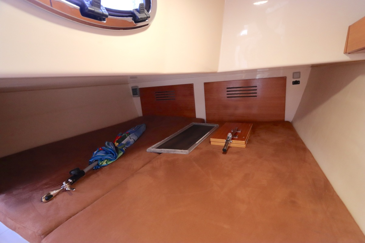 Open cabineontwerp met afgesloten was-/toiletruimte. Zeer elegant interieur met houten kasten en bijpassende stoffering, matrassen en tapijten.
