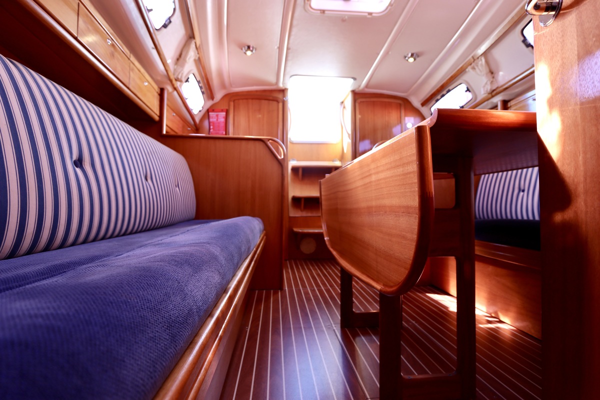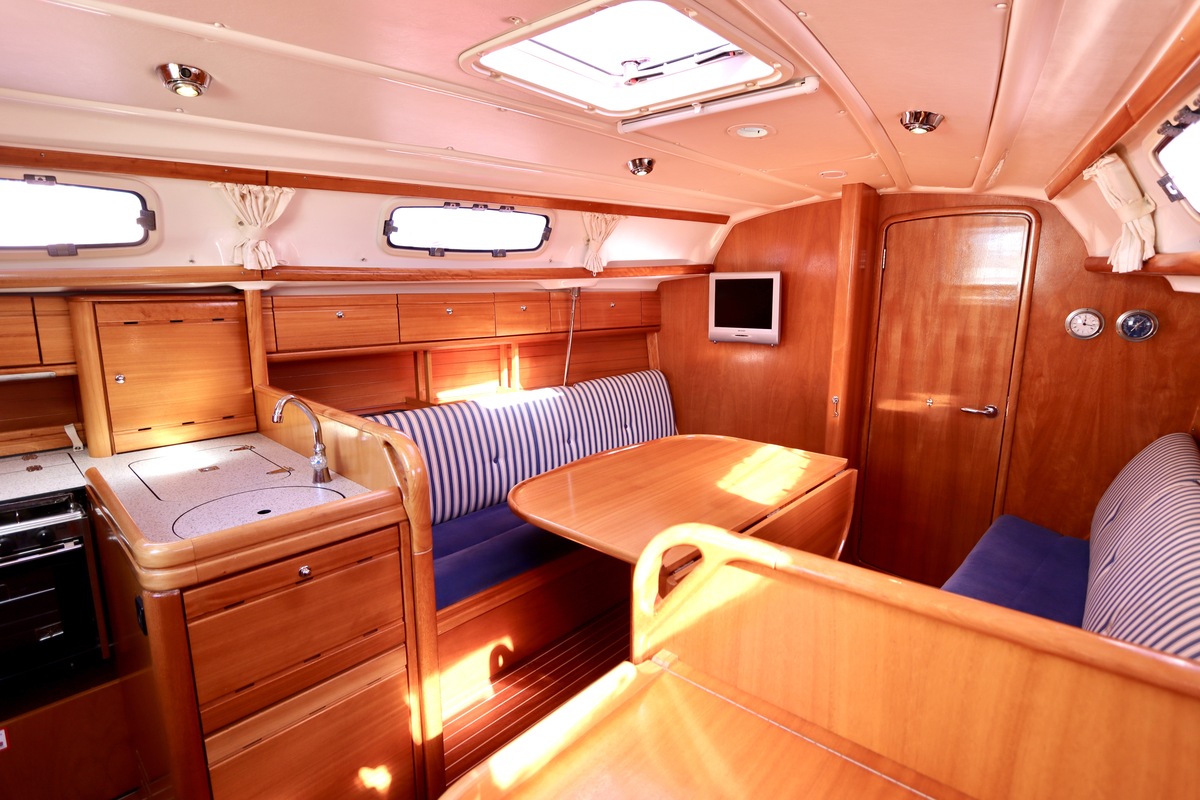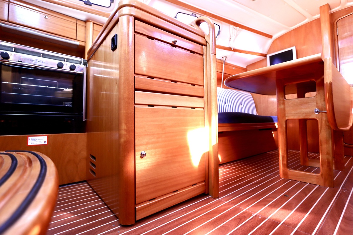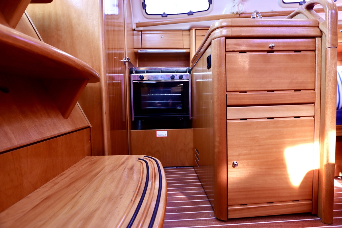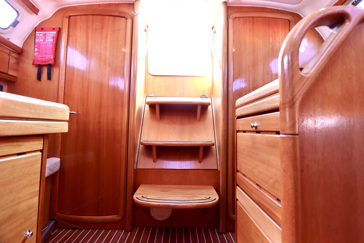 Binnen tref je een frisse en nette accommodatie met twee hutten, aangevuld met extra slaapruimte in de salon. De kombuis is compleet met een 2-pits kooktoestel met oven (gekeurd in 2024) en een koelkast. De verwarming uit 2018 zorgt voor comfort in alle seizoenen. Technisch is het schip goed bijgehouden. De Volvo Penta D1-20 motor heeft circa 850 uur en is betrouwbaar. Accu’s zijn vernieuwd in 2023, Saildrive manchet in 2020 en de schroefas en anoden in 2024. Ook is de verstaging in 2020 vervangen.