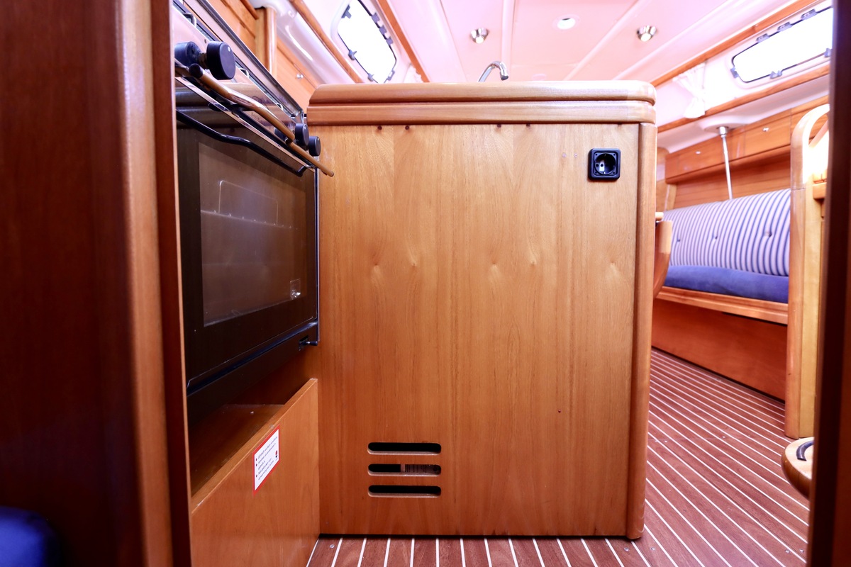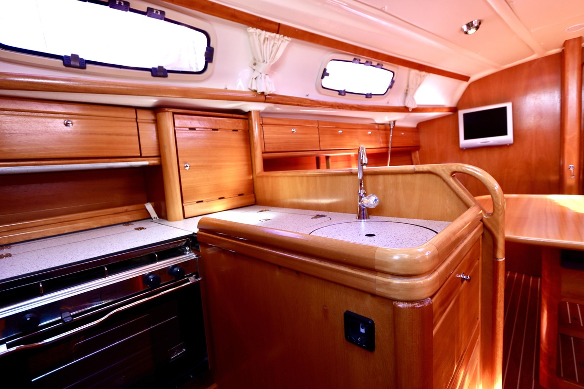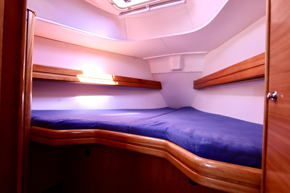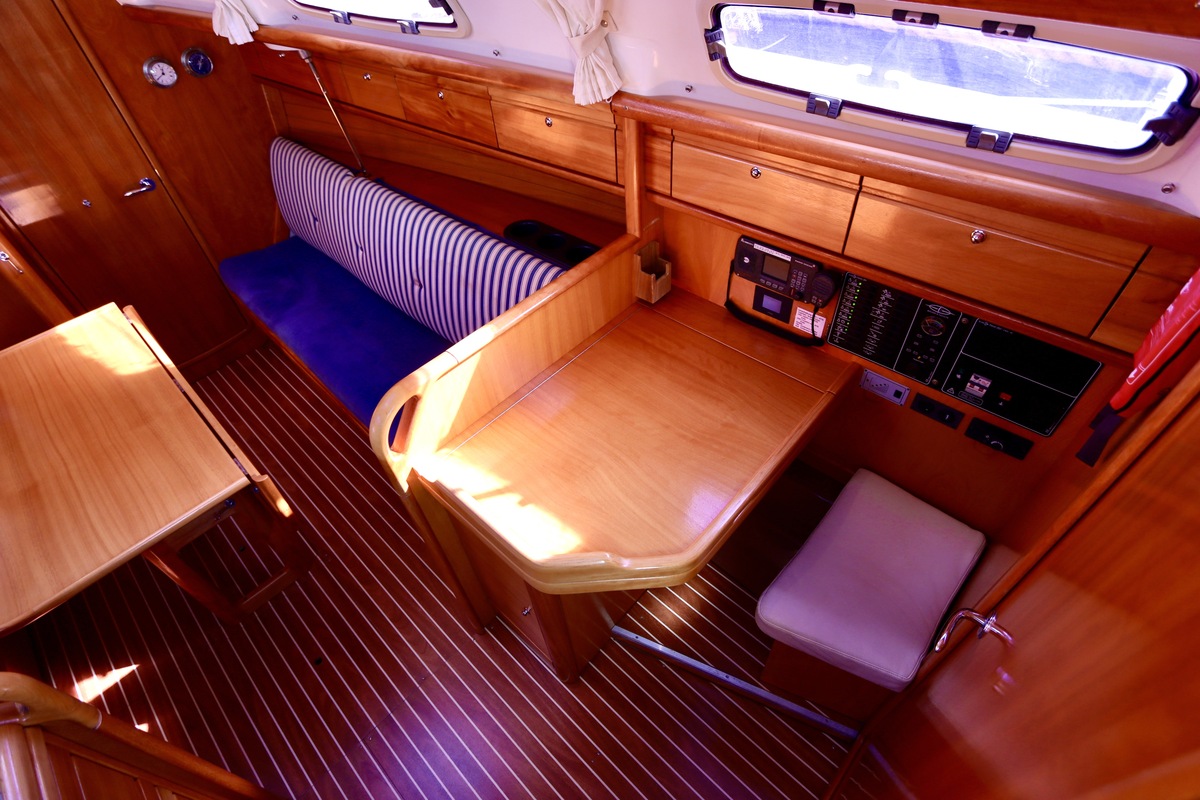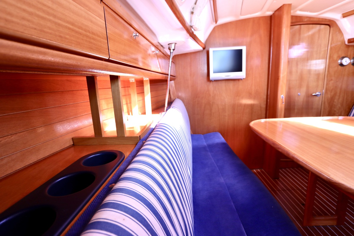 Binnen tref je een frisse en nette accommodatie met twee hutten, aangevuld met extra slaapruimte in de salon. De kombuis is compleet met een 2-pits kooktoestel met oven (gekeurd in 2024) en een koelkast. De verwarming uit 2018 zorgt voor comfort in alle seizoenen. Technisch is het schip goed bijgehouden. De Volvo Penta D1-20 motor heeft circa 850 uur en is betrouwbaar. Accu’s zijn vernieuwd in 2023, Saildrive manchet in 2020 en de schroefas en anoden in 2024. Ook is de verstaging in 2020 vervangen.