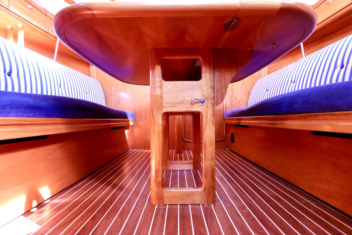 Twee hutten met vier vaste kooien. Salon met comfortabele banken. Mooi vormgegeven salontafel. Aan weerszijden van salon opbergvakken en kastjes. Kaartentafel met vak voor kaarten en instrumenten.