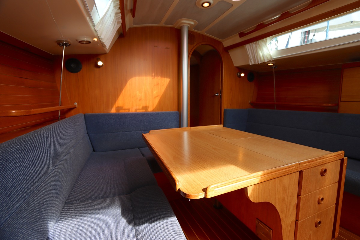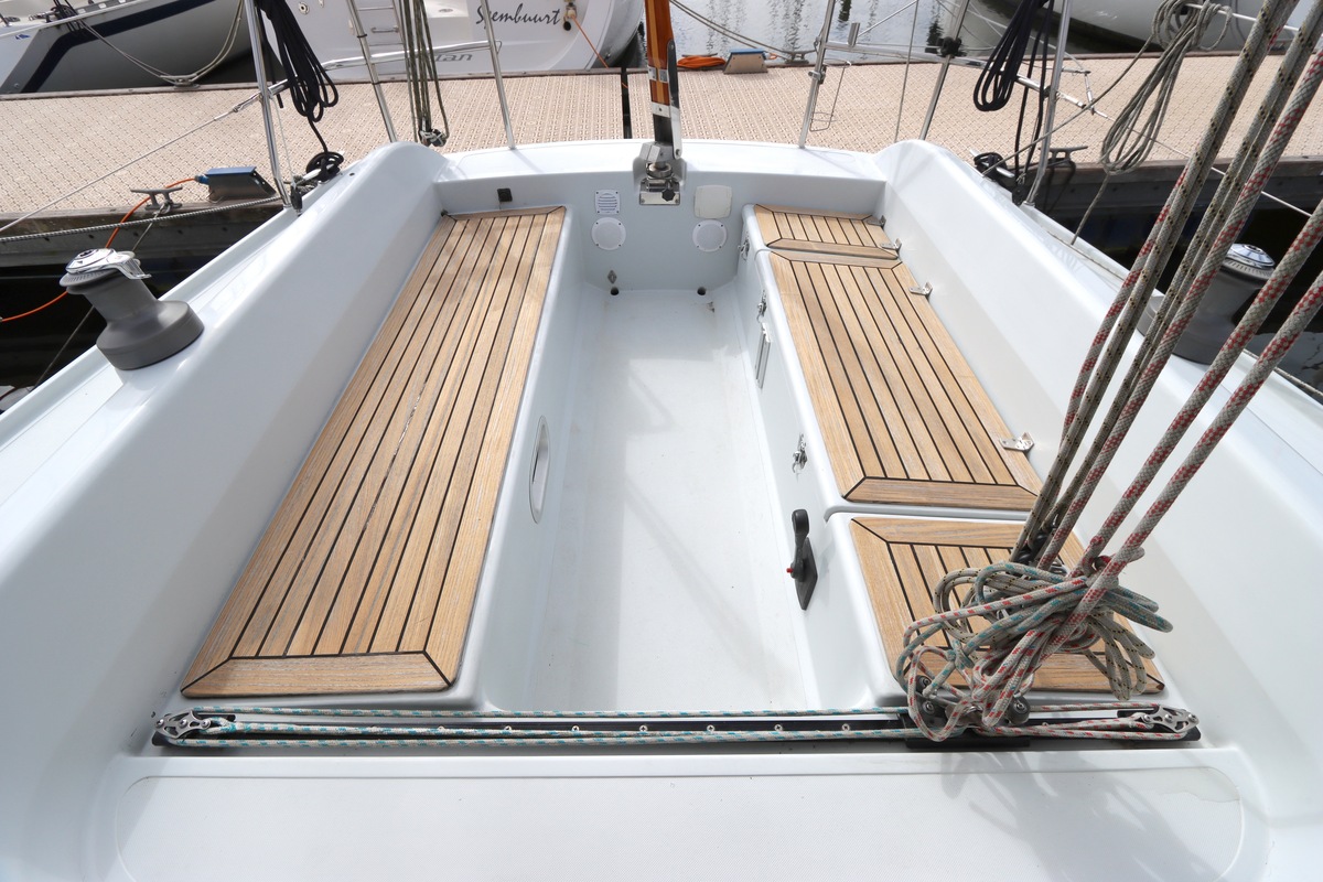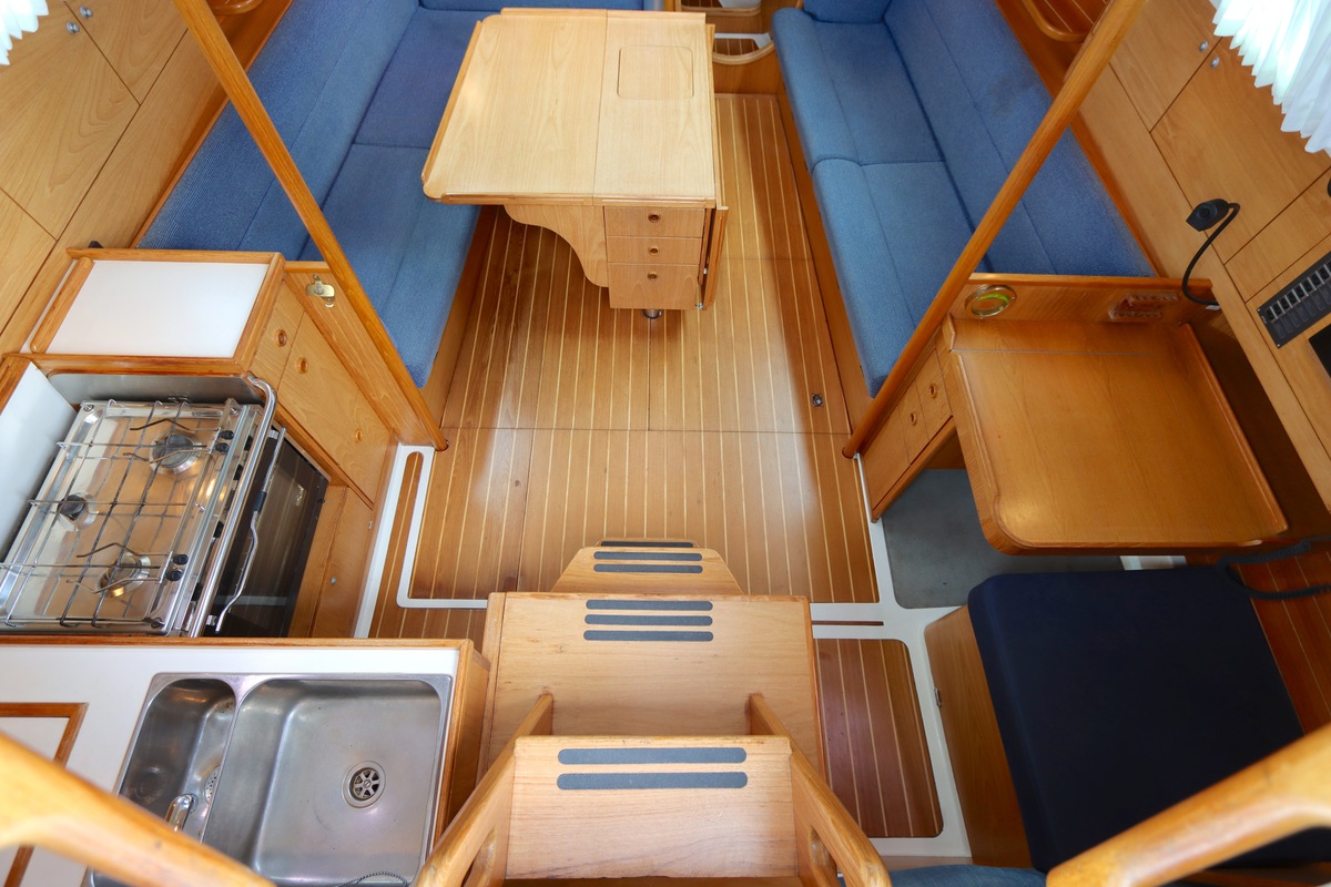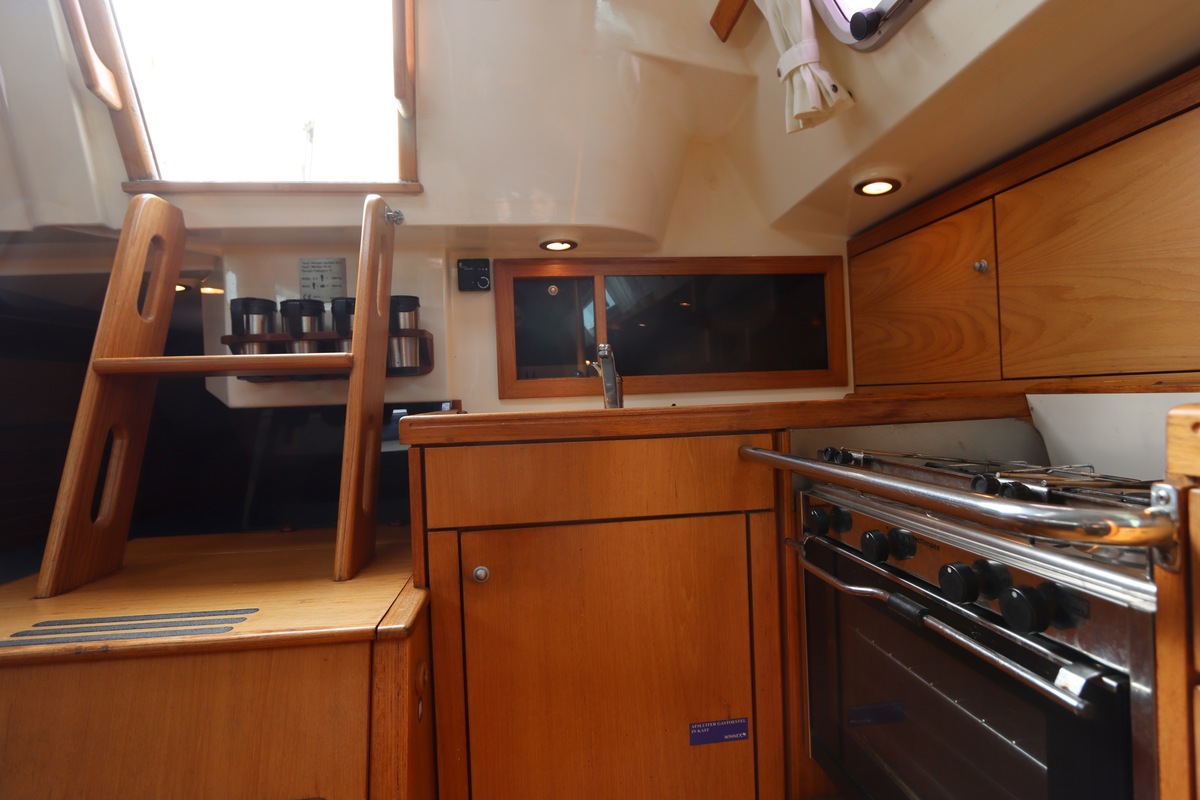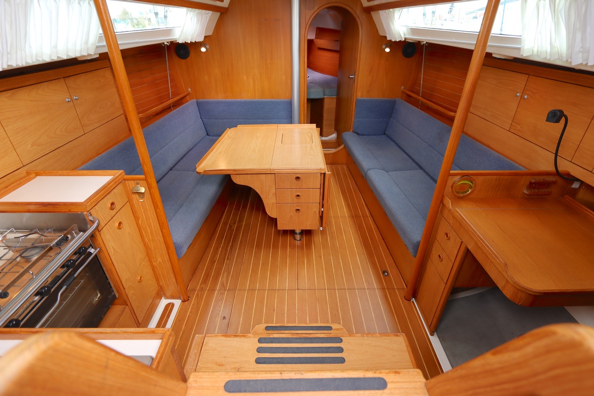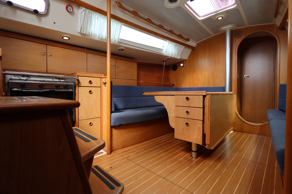 Aan dek is het leven prettig en overzichtelijk. De ruime kuip, brede gangboorden en het zwemplateau zorgen voor comfort en veiligheid. Alles voelt logisch en goed doordacht. Benedendeks tref je een licht en warm interieur van blond teak. De indeling is praktisch met twee hutten, lange bedden en een comfortabele salon. De kombuis is compleet uitgevoerd en alle technische ruimtes zijn goed bereikbaar, wat het onderhoud eenvoudig maakt. Met de betrouwbare Yanmar motor, goede zeilgarderobe en complete uitrusting is dit een schip waar je zo mee weg kunt.