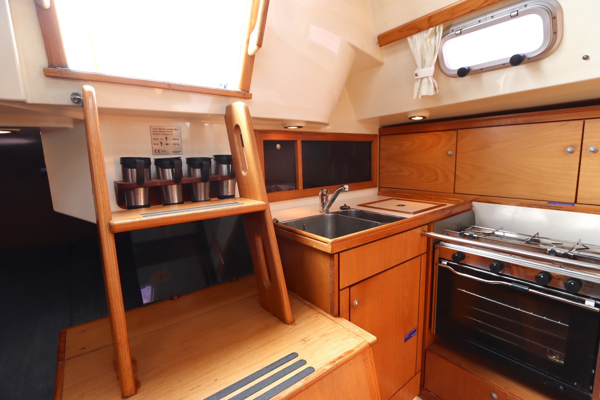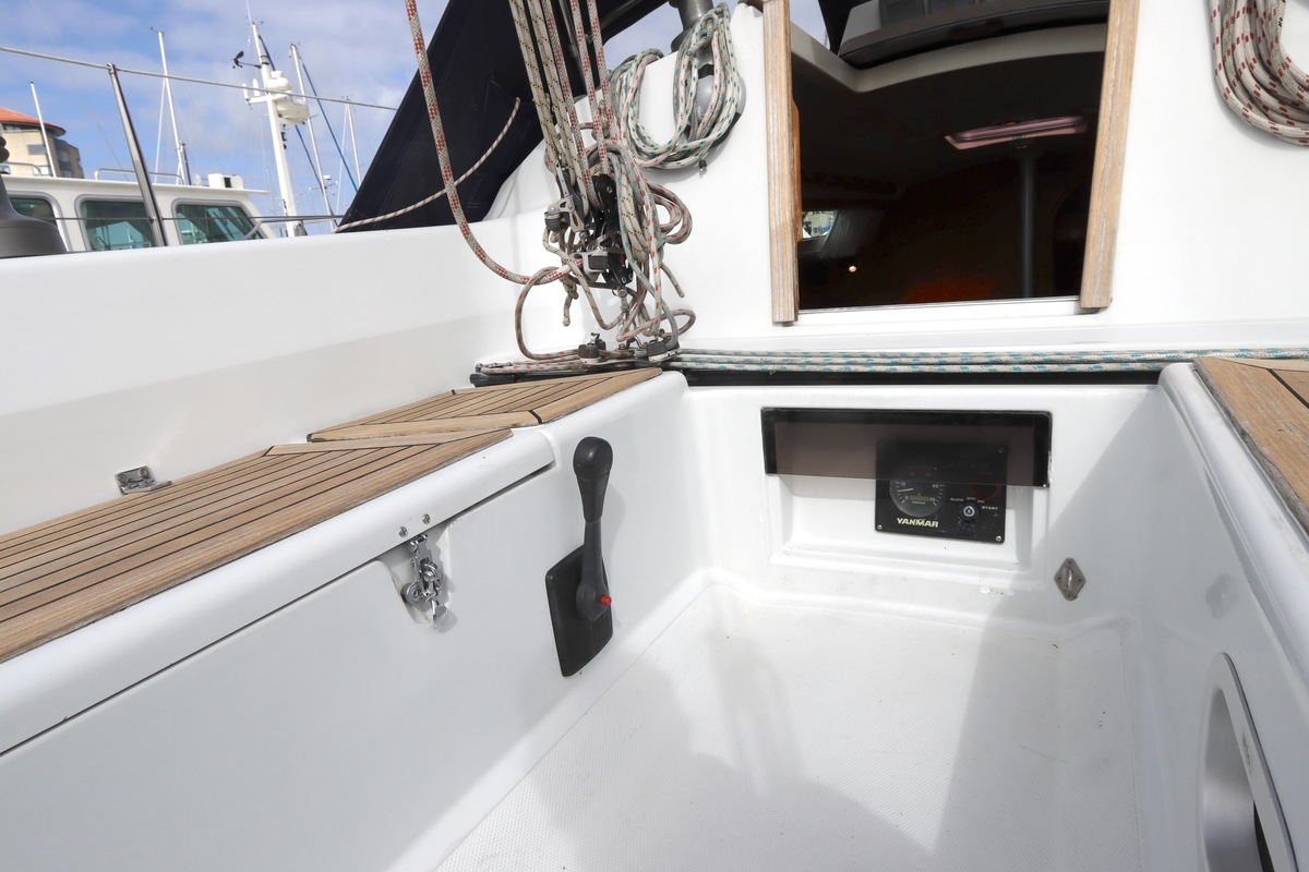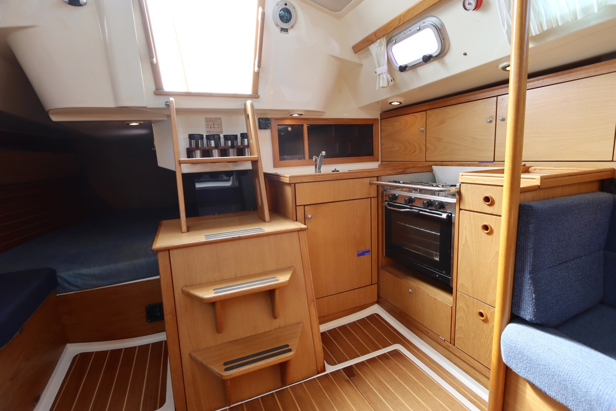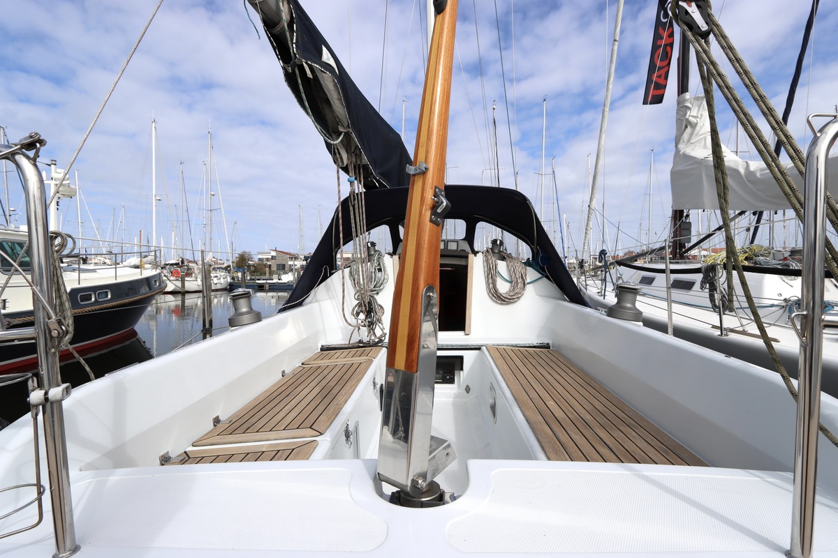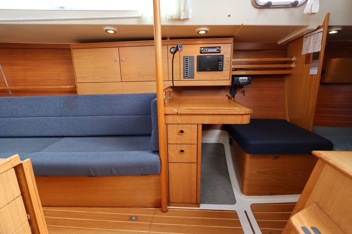 Aan dek is het leven prettig en overzichtelijk. De ruime kuip, brede gangboorden en het zwemplateau zorgen voor comfort en veiligheid. Alles voelt logisch en goed doordacht. Benedendeks tref je een licht en warm interieur van blond teak. De indeling is praktisch met twee hutten, lange bedden en een comfortabele salon. De kombuis is compleet uitgevoerd en alle technische ruimtes zijn goed bereikbaar, wat het onderhoud eenvoudig maakt. Met de betrouwbare Yanmar motor, goede zeilgarderobe en complete uitrusting is dit een schip waar je zo mee weg kunt.