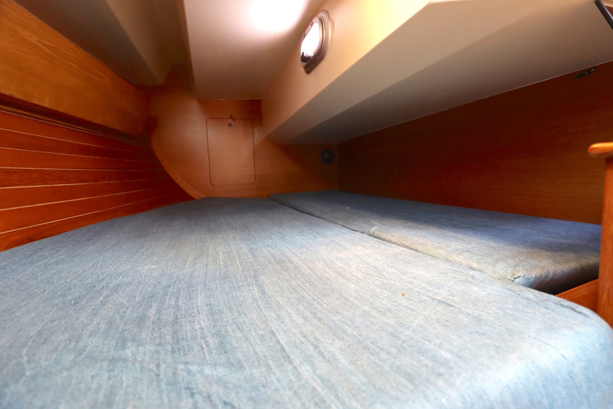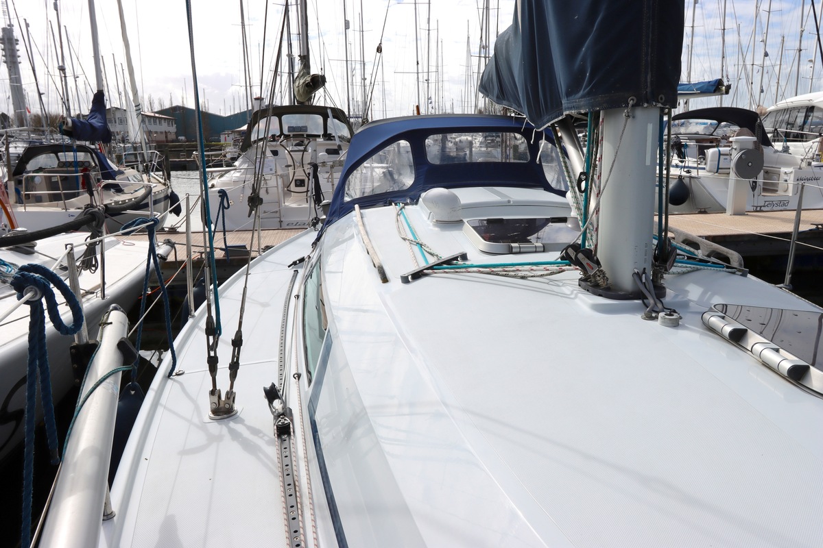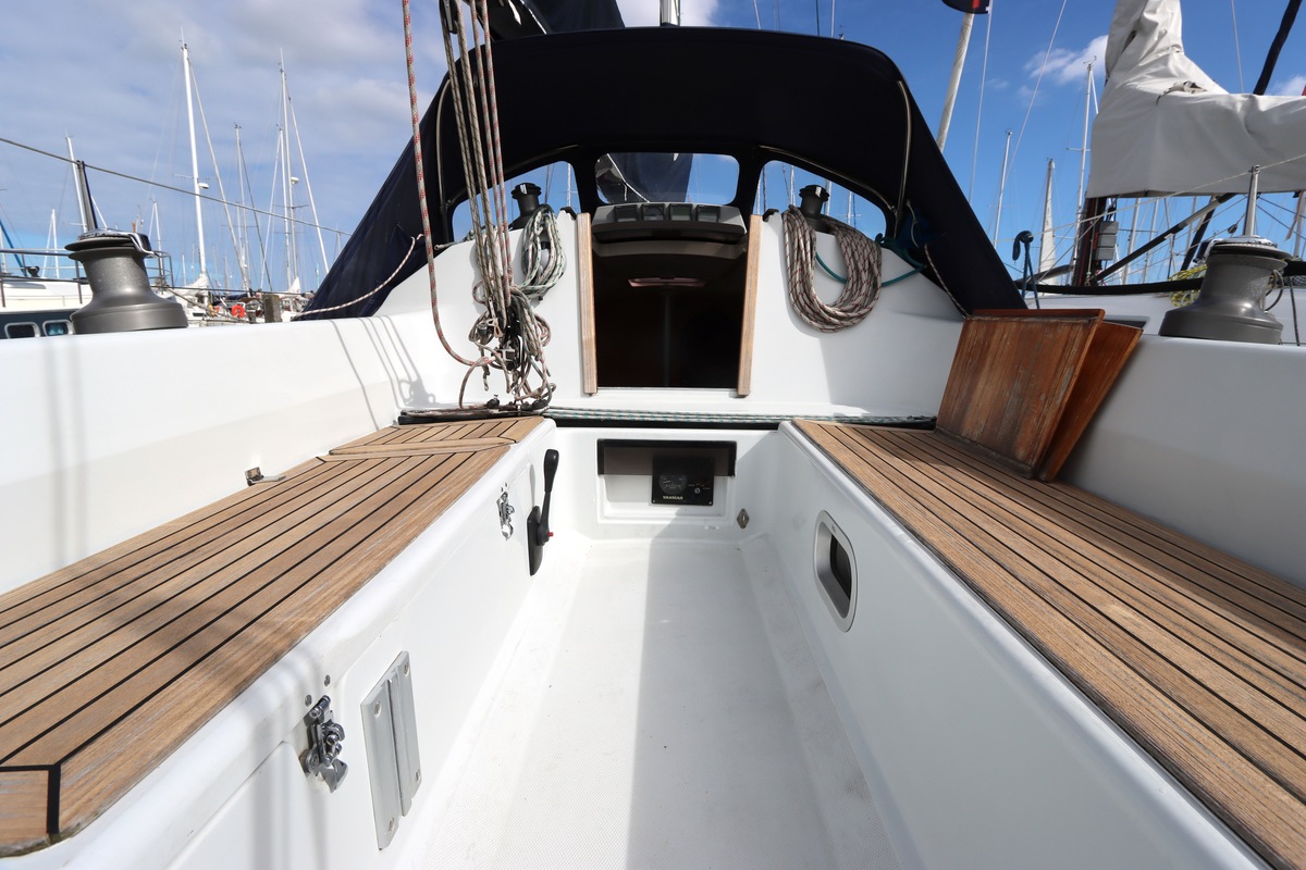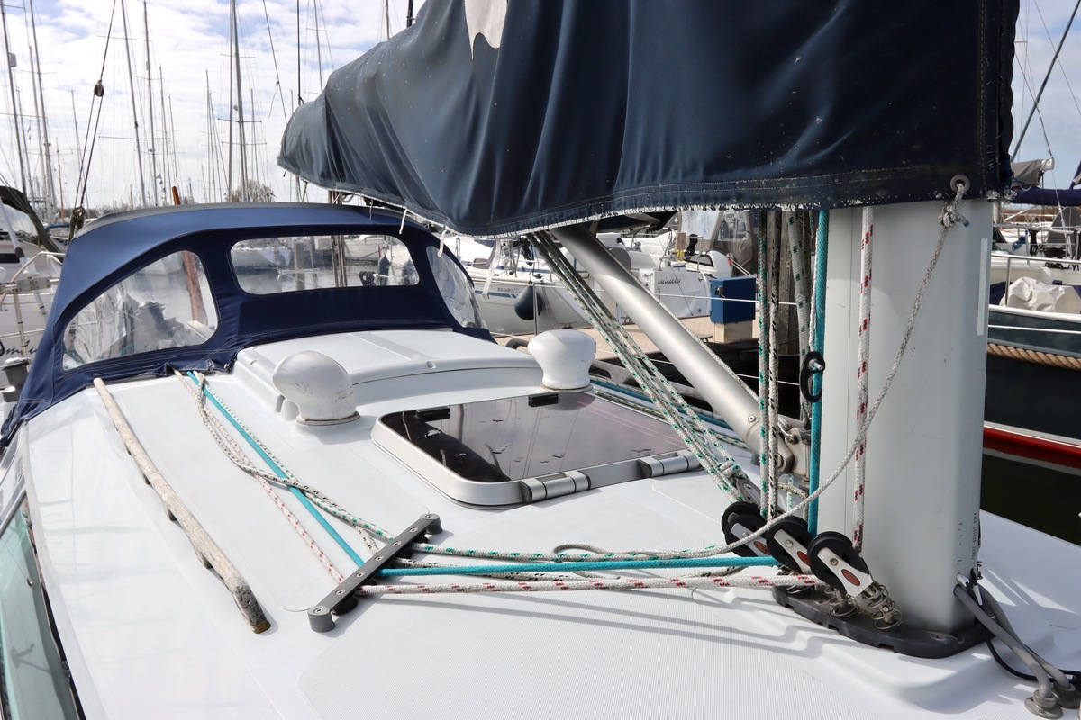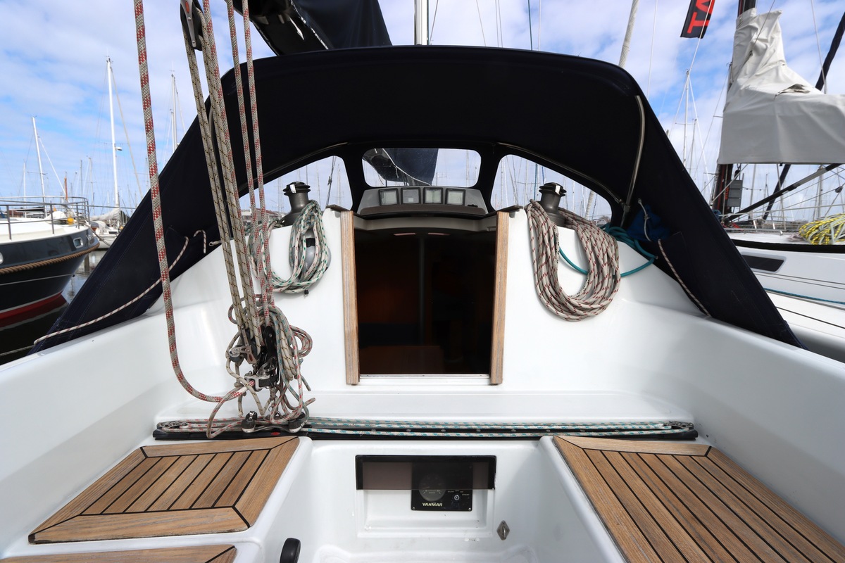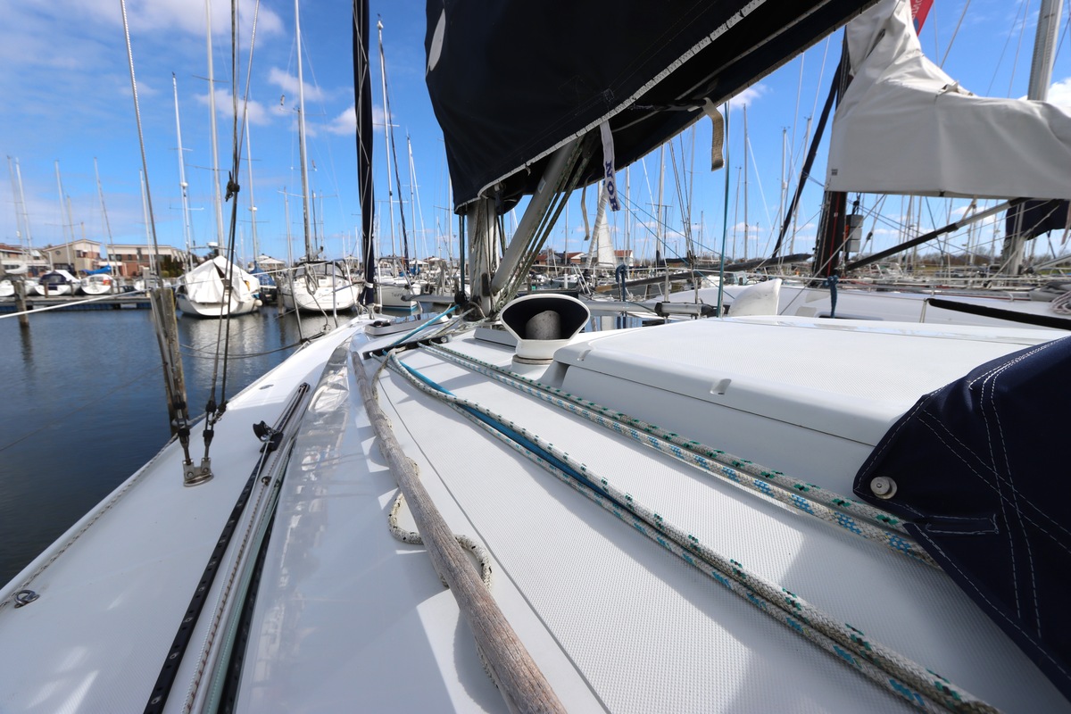 Aan dek is het leven prettig en overzichtelijk. De ruime kuip, brede gangboorden en het zwemplateau zorgen voor comfort en veiligheid. Alles voelt logisch en goed doordacht. Benedendeks tref je een licht en warm interieur van blond teak. De indeling is praktisch met twee hutten, lange bedden en een comfortabele salon. De kombuis is compleet uitgevoerd en alle technische ruimtes zijn goed bereikbaar, wat het onderhoud eenvoudig maakt. Met de betrouwbare Yanmar motor, goede zeilgarderobe en complete uitrusting is dit een schip waar je zo mee weg kunt.