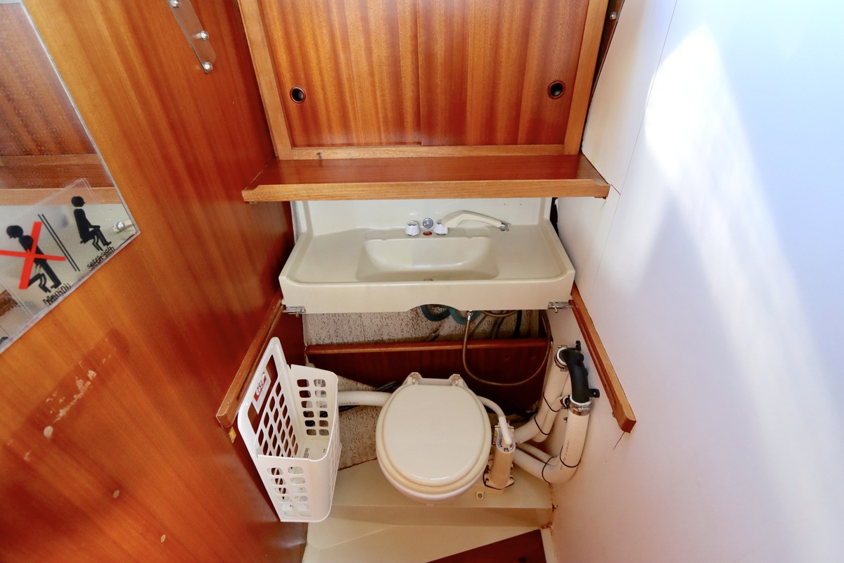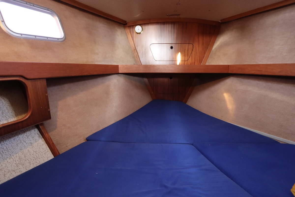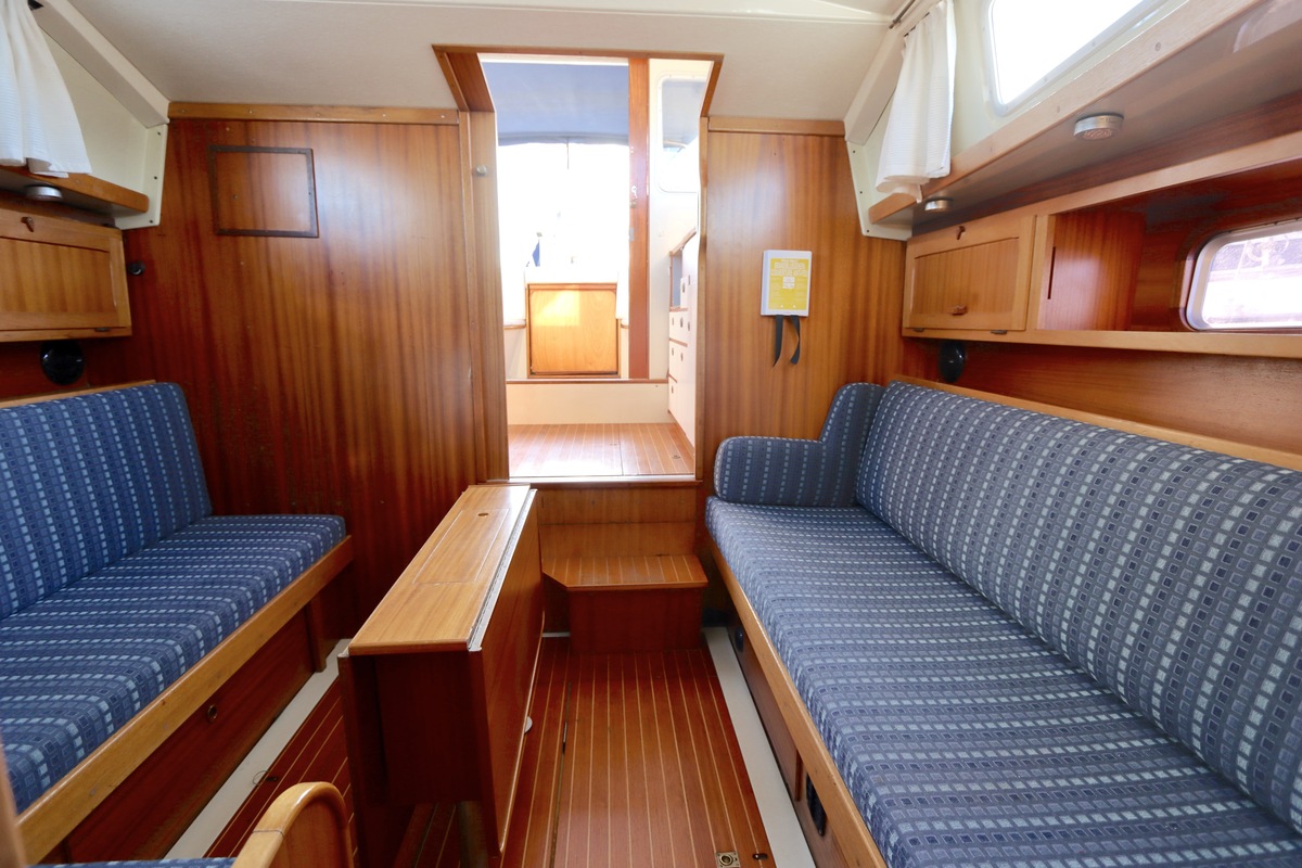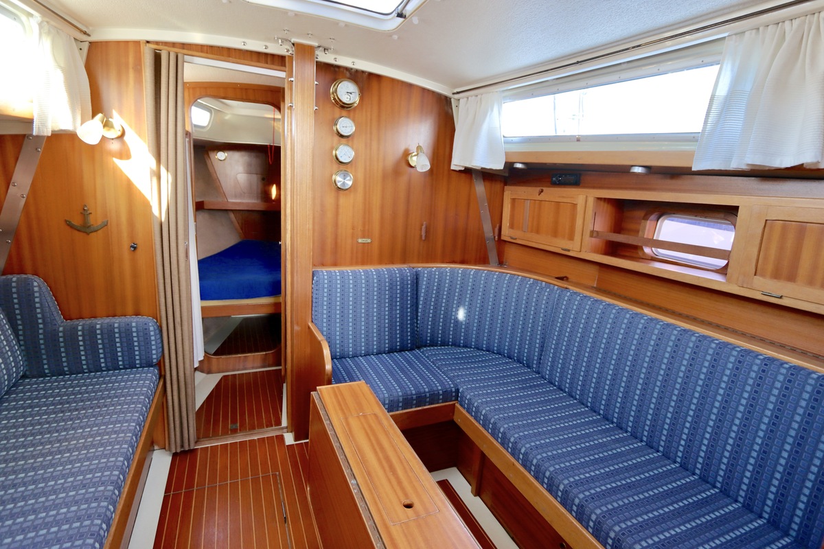 Binnen is het schip praktisch en ruim opgezet. In de punt zit een tweepersoons hut, daarnaast een natte cel met douche en toilet. De salon is voorzien van een bank en dinette die ook als slaapplaatsen te gebruiken zijn. In totaal zijn er vijf vaste slaapplaatsen.