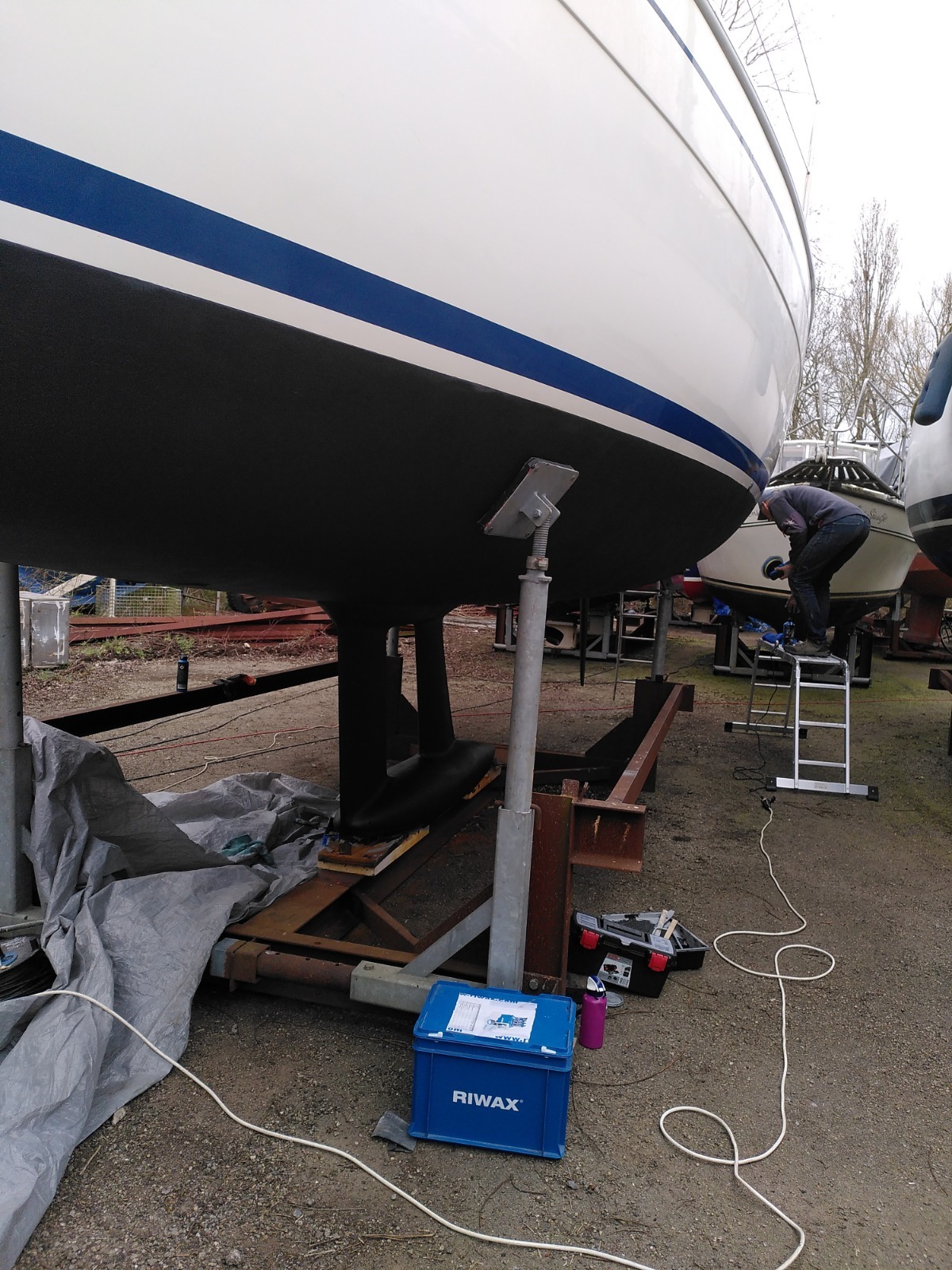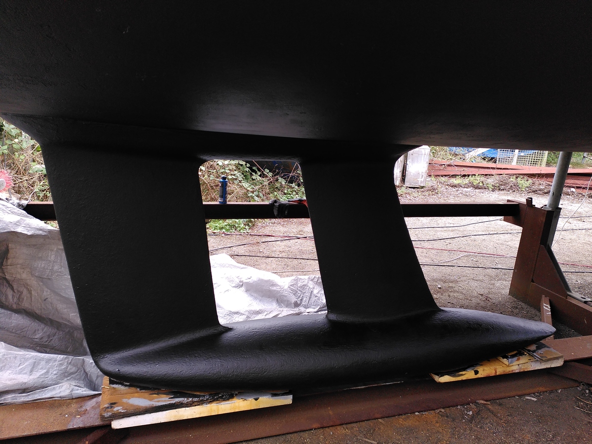 Onderwaterschip in 2025 met 1 laag Epifanes CR primer en 2x antifouling Epifanes Copper-cruise. Kiel blank gehaald met opbouw 2 lagen 2 componenten Epifanes Interim coat en 2x antifouling.