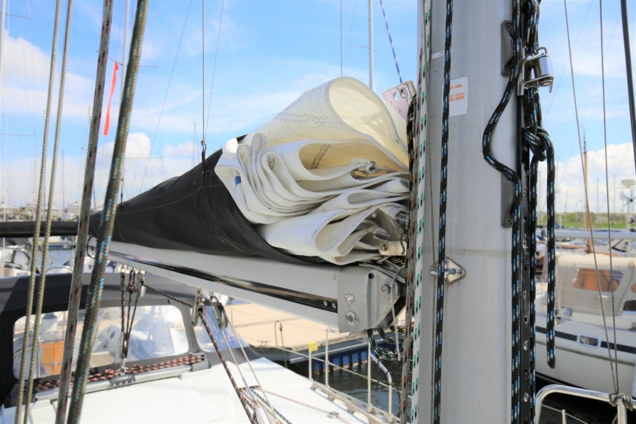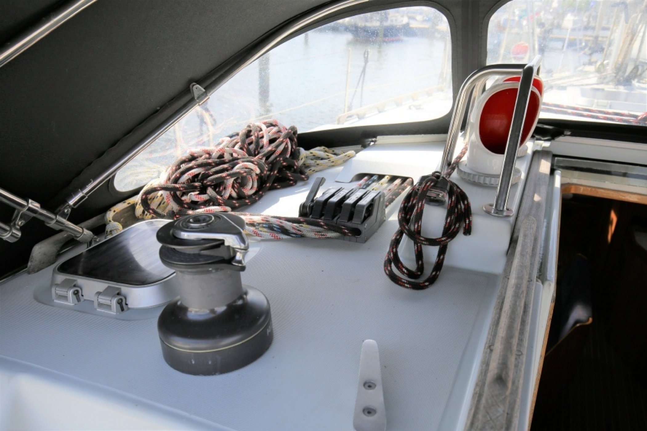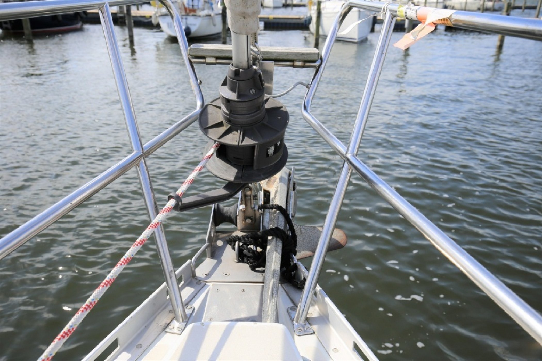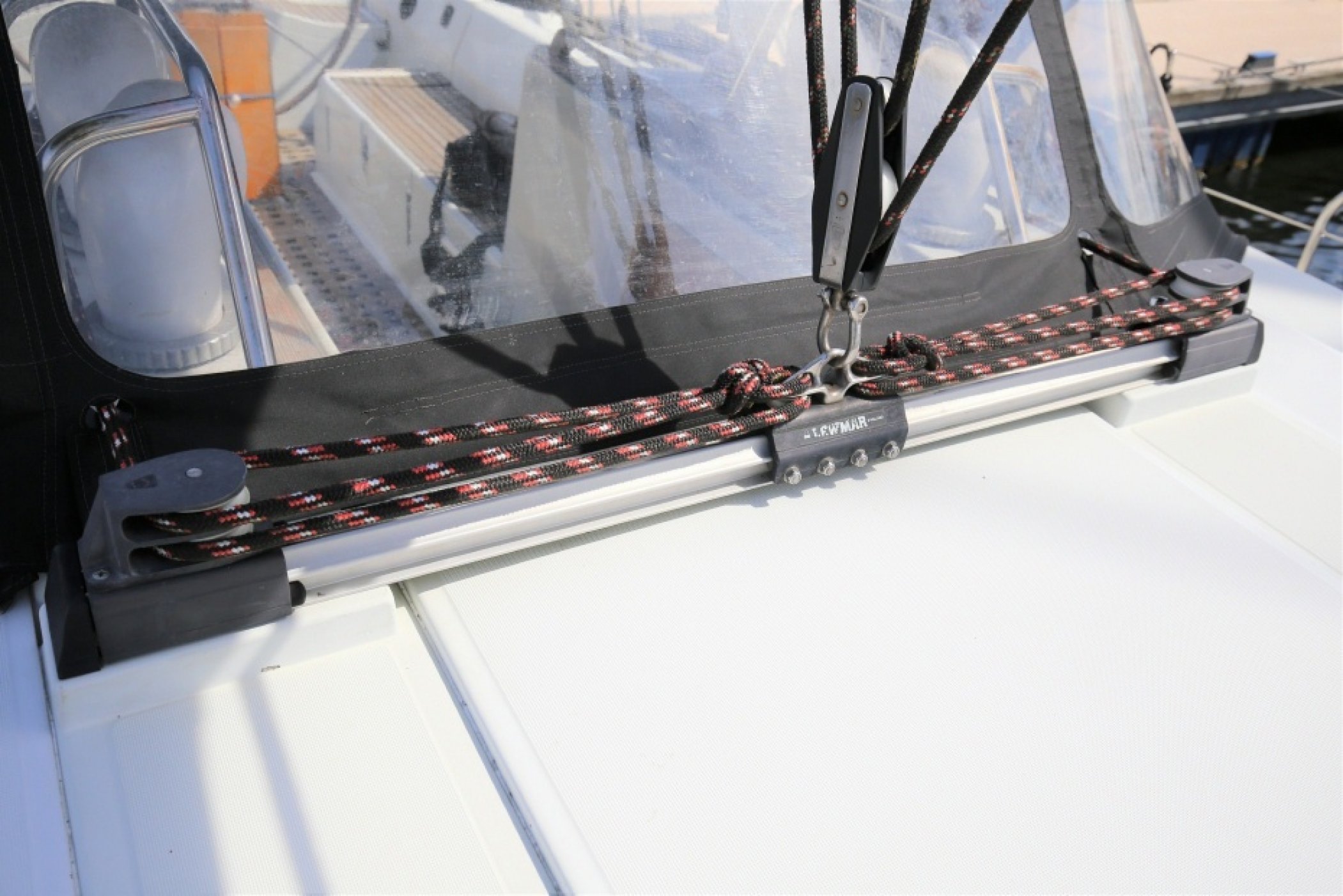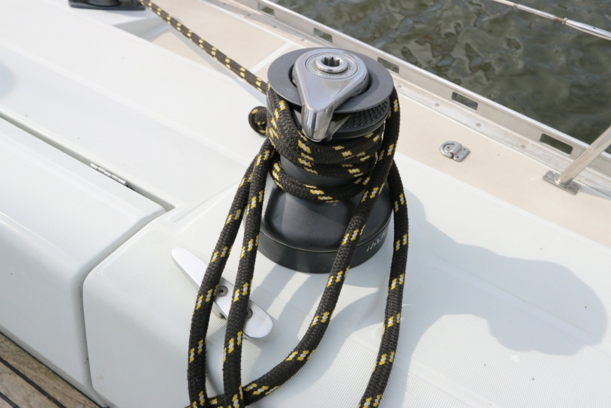 2 x Selftailing schootlieren, 2 Selftailing vallieren en 1 reeflier op de mast (allen Harken).
