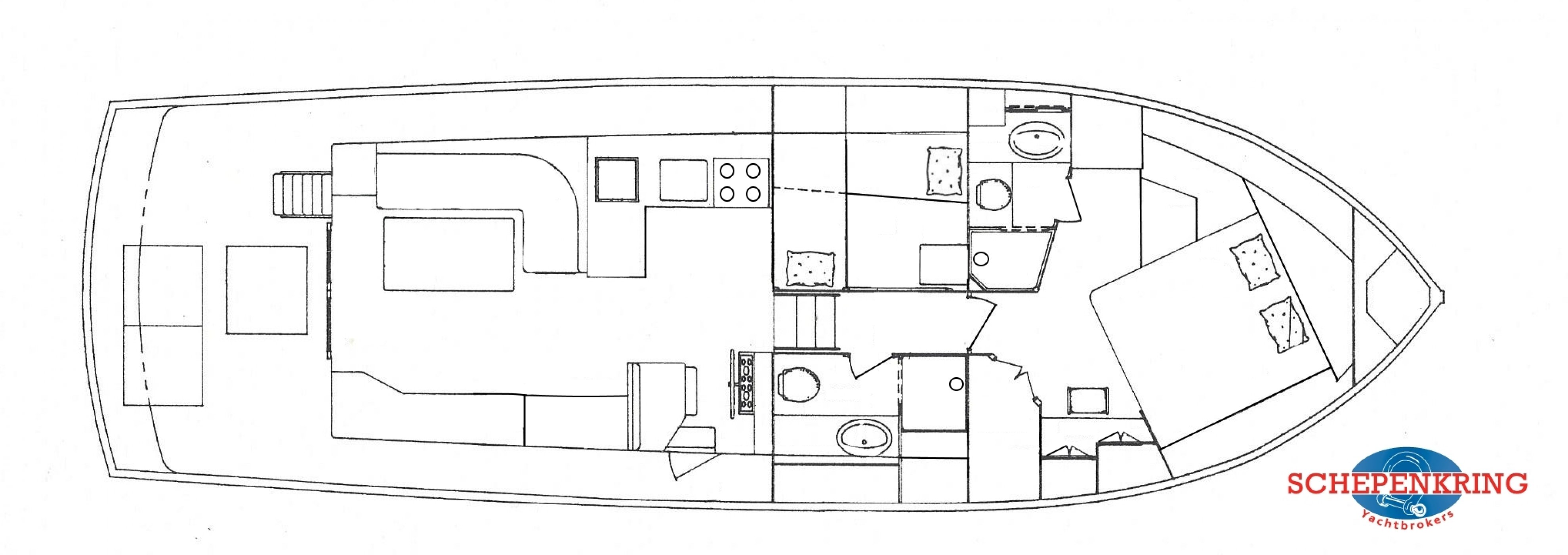 Voorkajuit / Natte cel / Gasten hut / Natte cel / Pantry / Salon