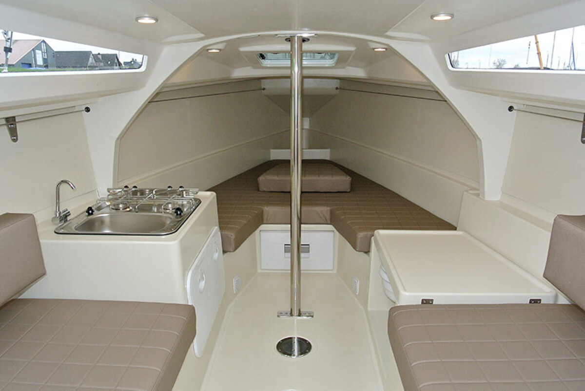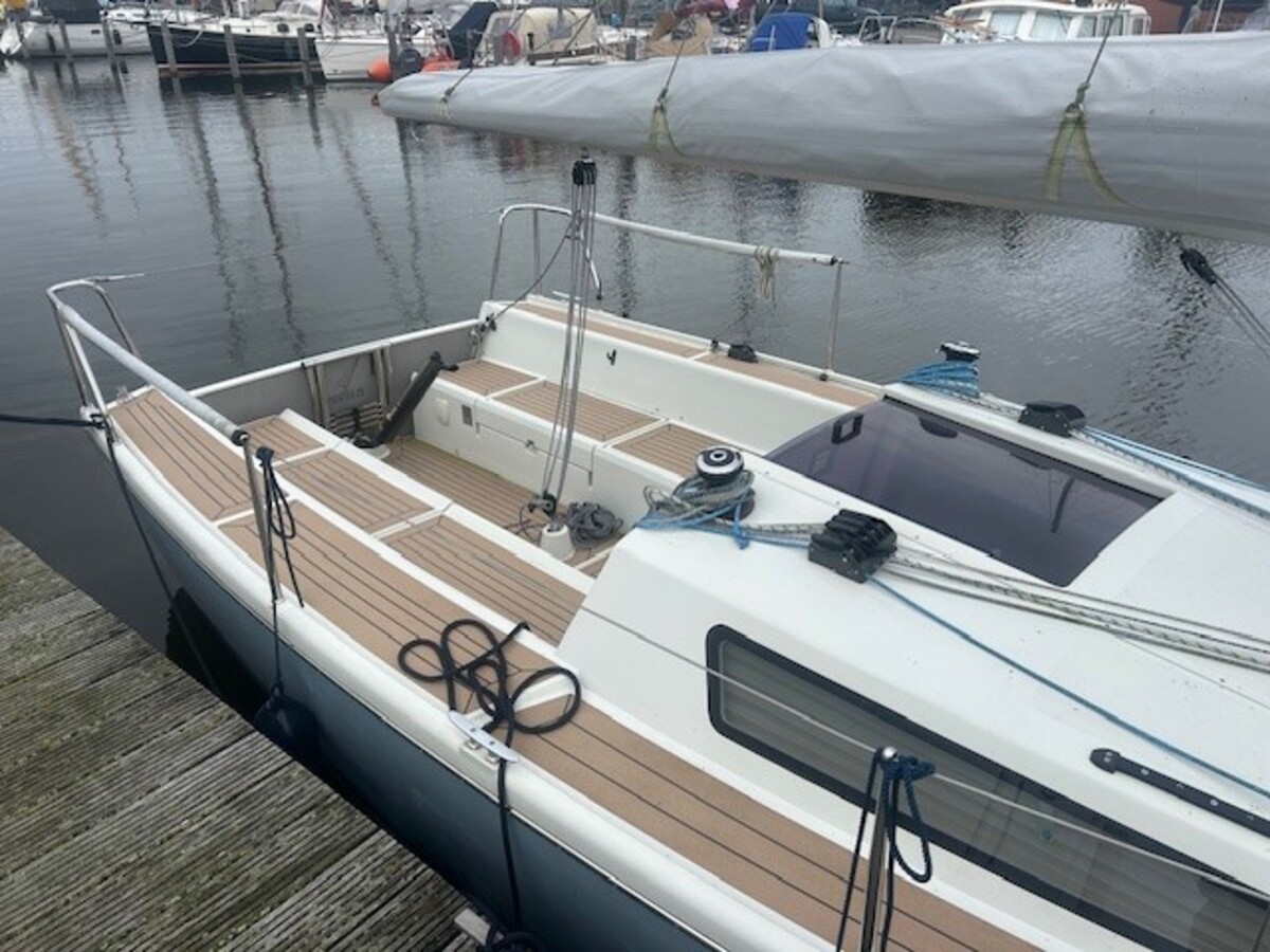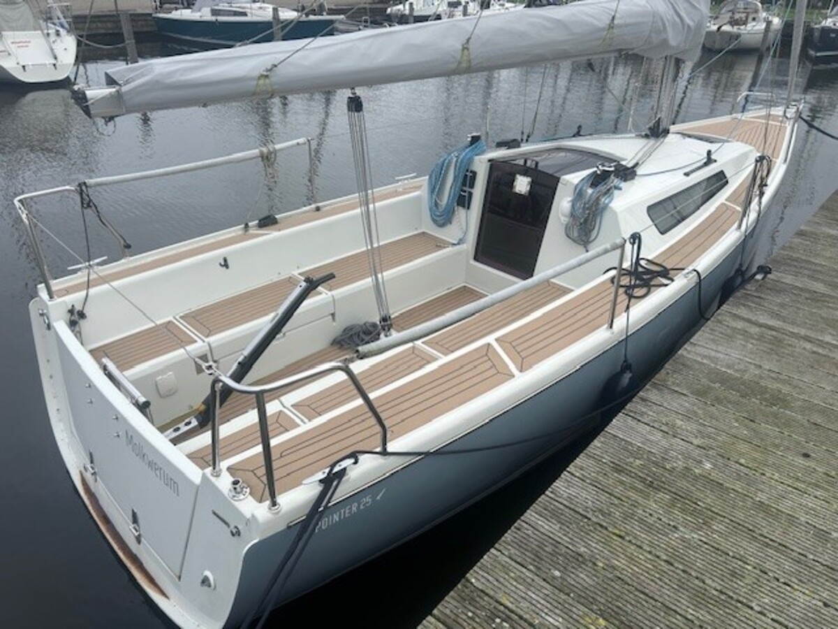 Zeer nette, recente Pointer 25. Deze boot is volledig werf onderhouden en in absolute nieuwstaat. Deze boot is alleen gebruikt op de Friese binnenwateren en daardoor in perfecte conditie. Deze boot is voorzien van een electrische Torqeedo 4.0 kW motor met klapschroef. Verder is de boot uitgerust met maindrop systeem met lazyjacks, Dacron grootzeil en rolfok met UV baan, opklapbaar zwemplateau met zwemtrap, anker, vlaggestok en vlag, walstroom aansluiting, magneet kompas, snelheid-diepte log en windmeter (Raymarine), gootsteen, gasfornuis en schoonwater tank, koelkast lade, toilet met handpomp en vuilwatertank en een tafel voor in kajuit en kuip. Daarnaast is de gehele boot, dek, banken en de kuipvloer voorzien van Esthec. Verder is de boot uitgerust met kuipkussens, raam shutters en een verduistering onder het vluchtluik.
