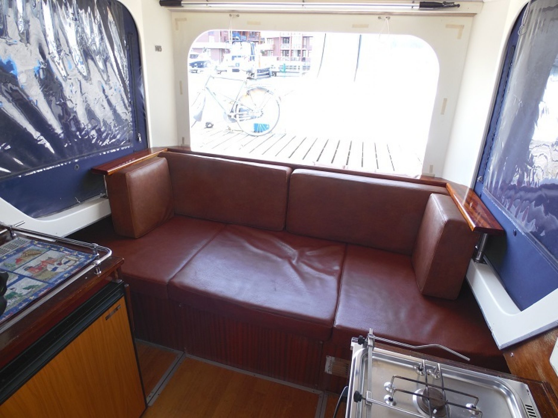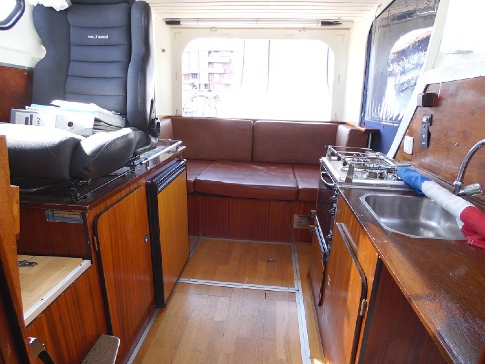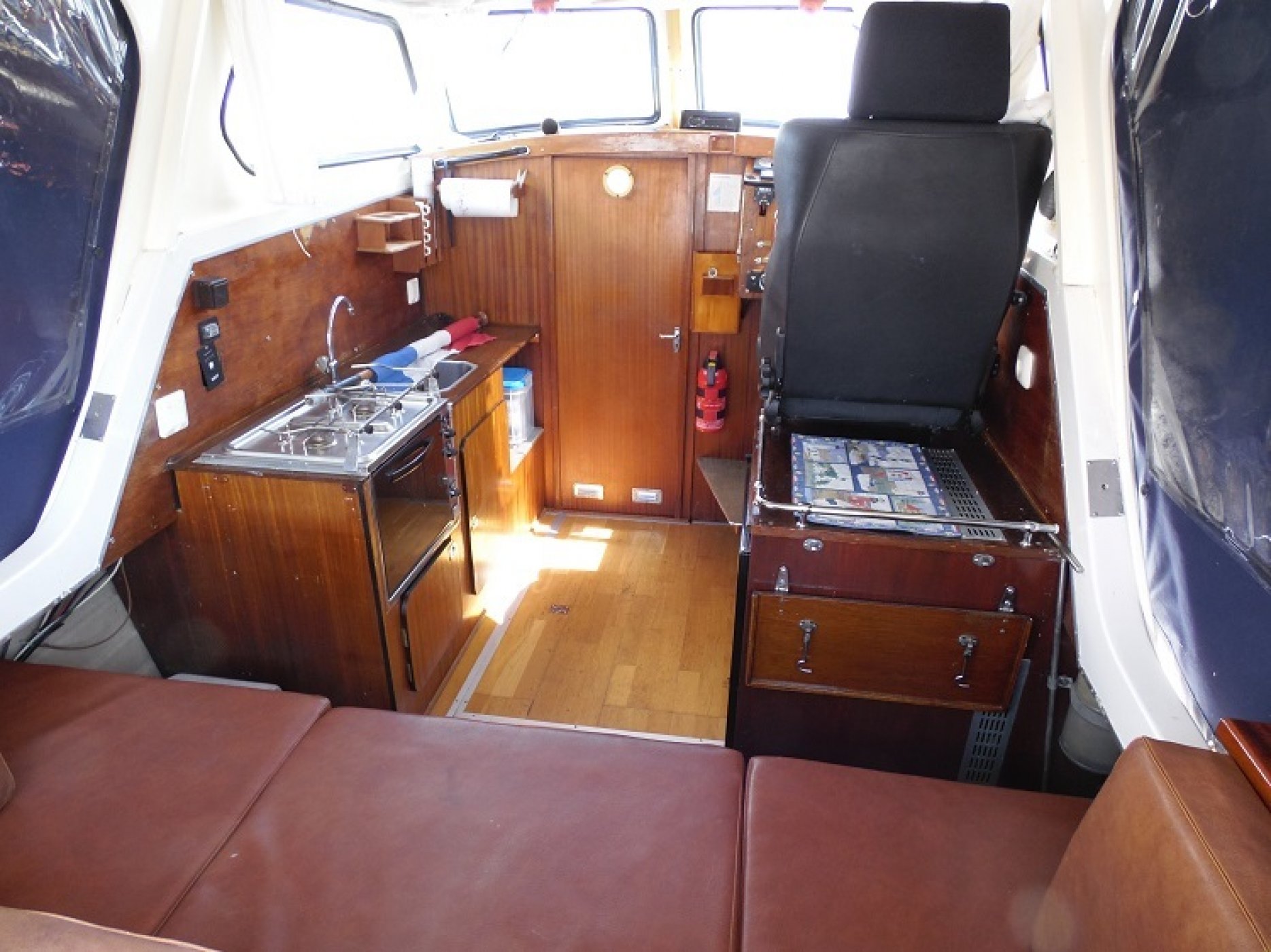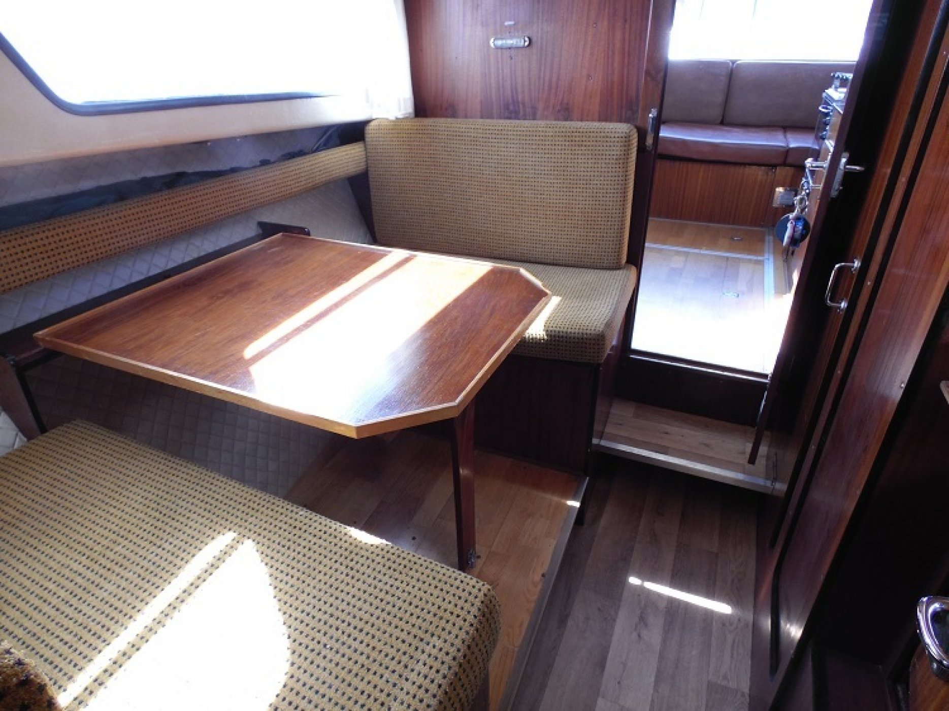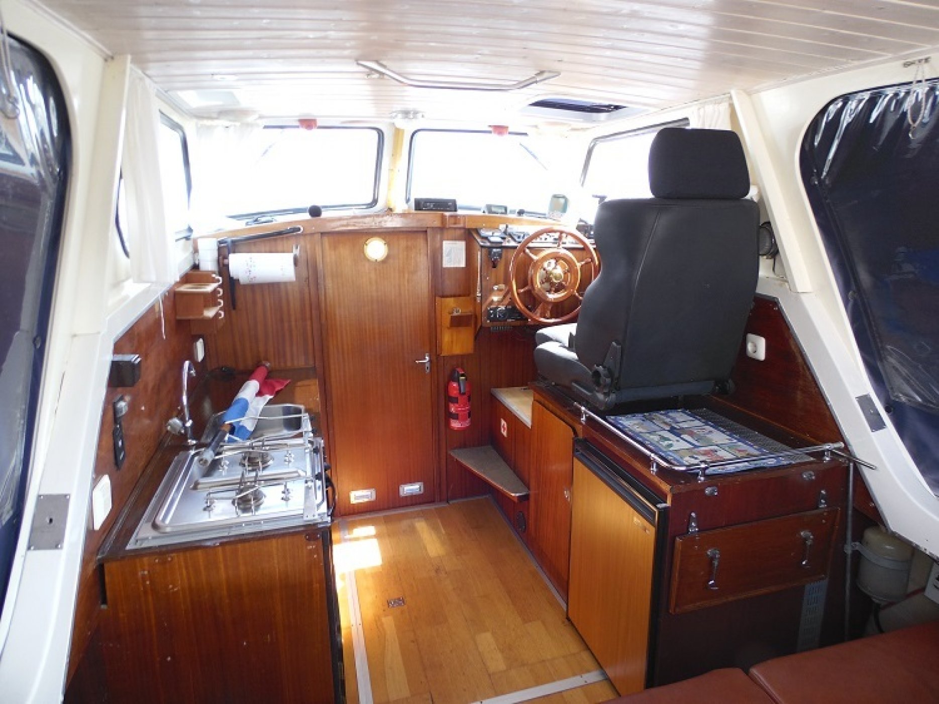 Achterkuip met keuken en sturen, salon met dinette en toilet ruimte, voorpiek afsluitbaar.