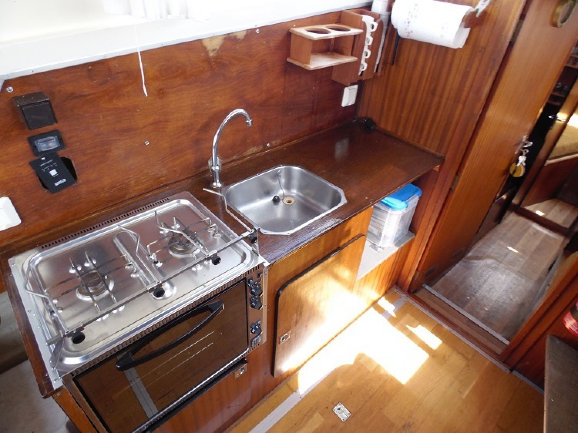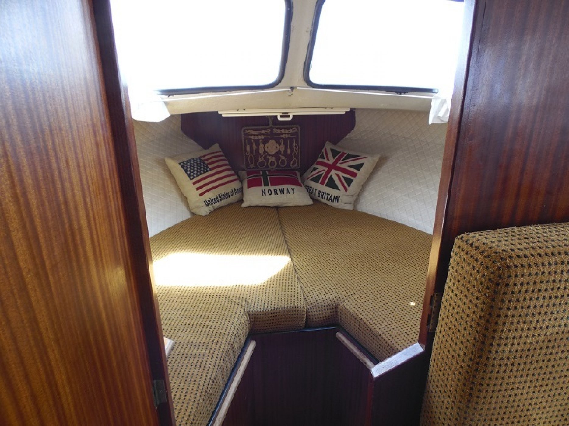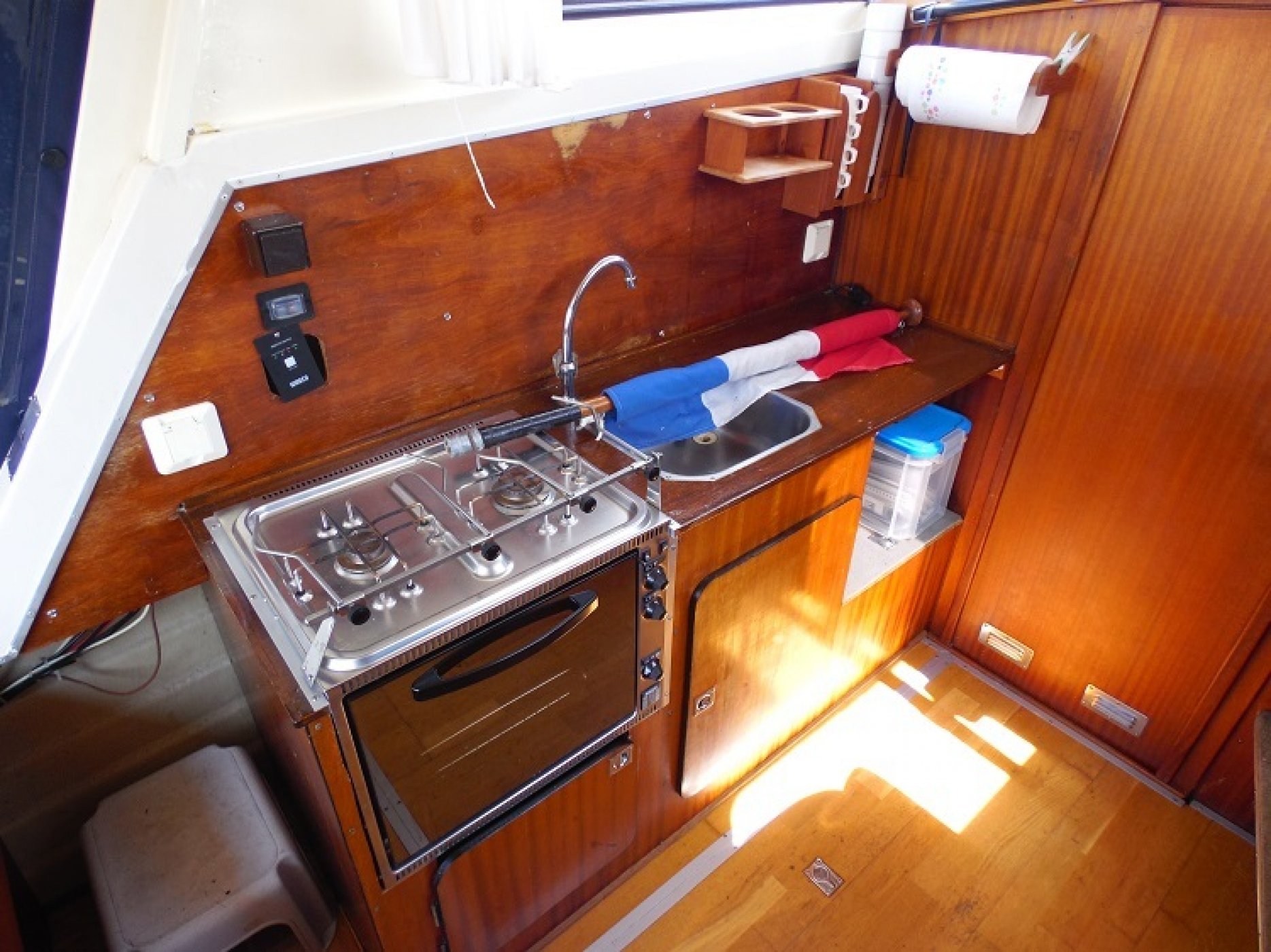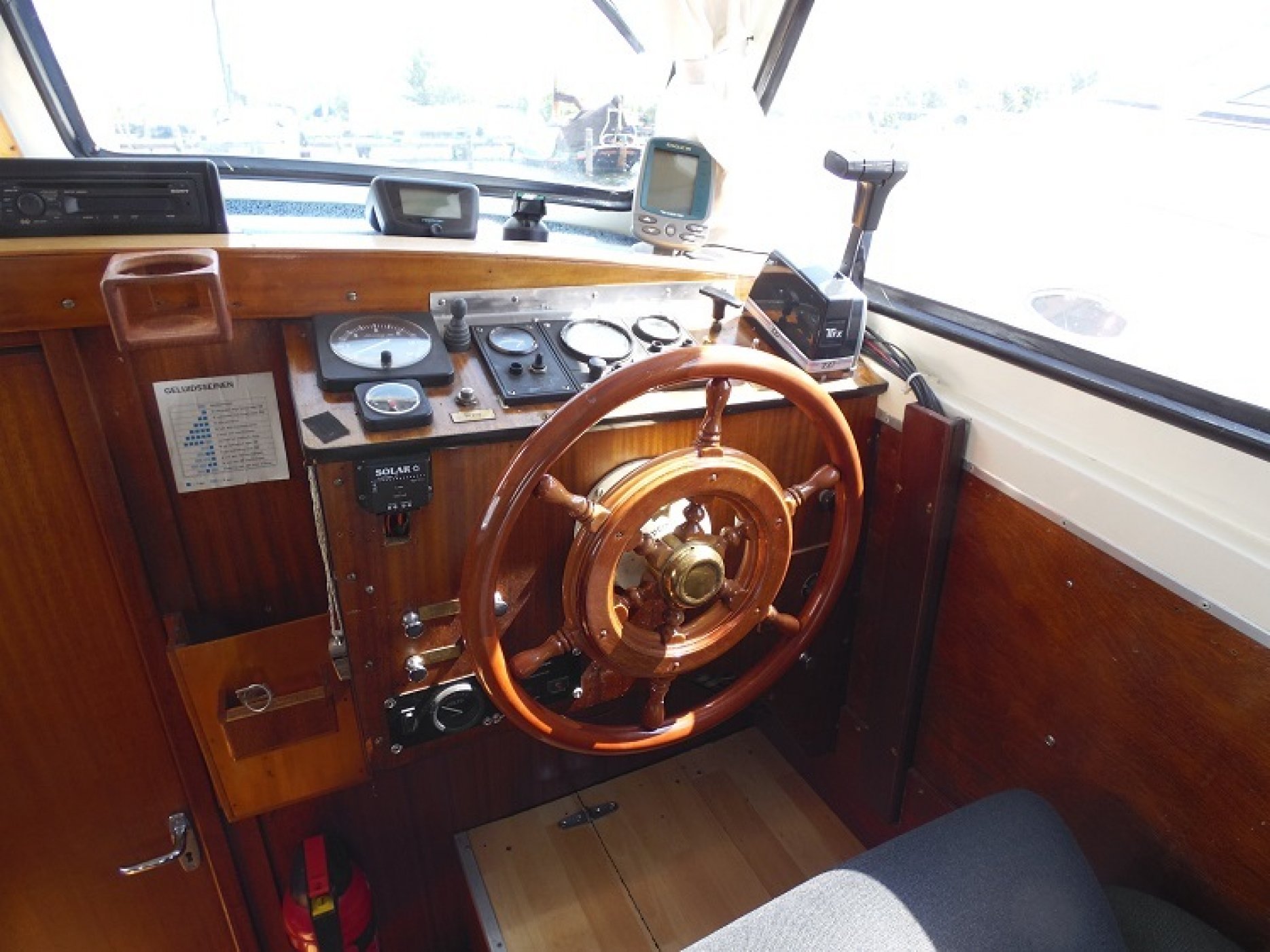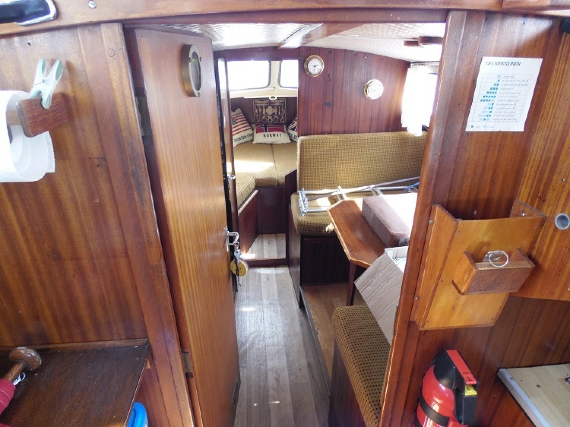 Achterkuip met keuken en sturen, salon met dinette en toilet ruimte, voorpiek afsluitbaar.