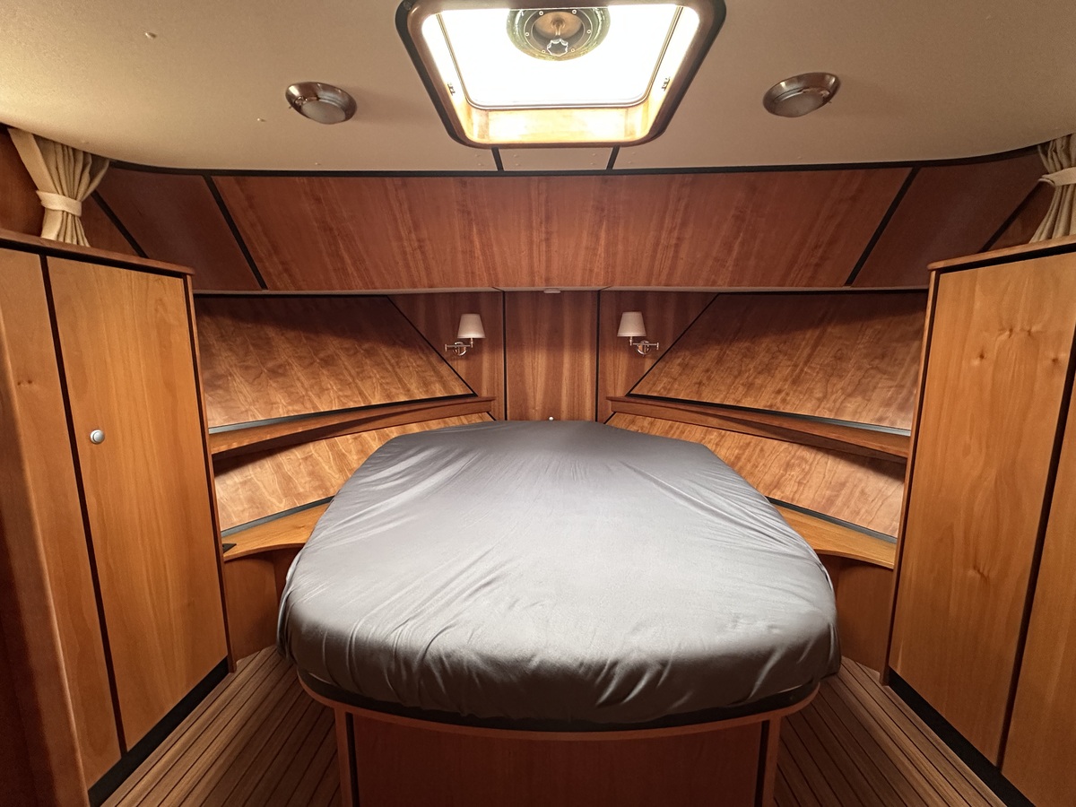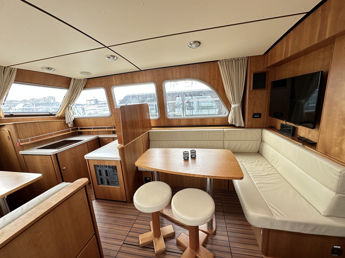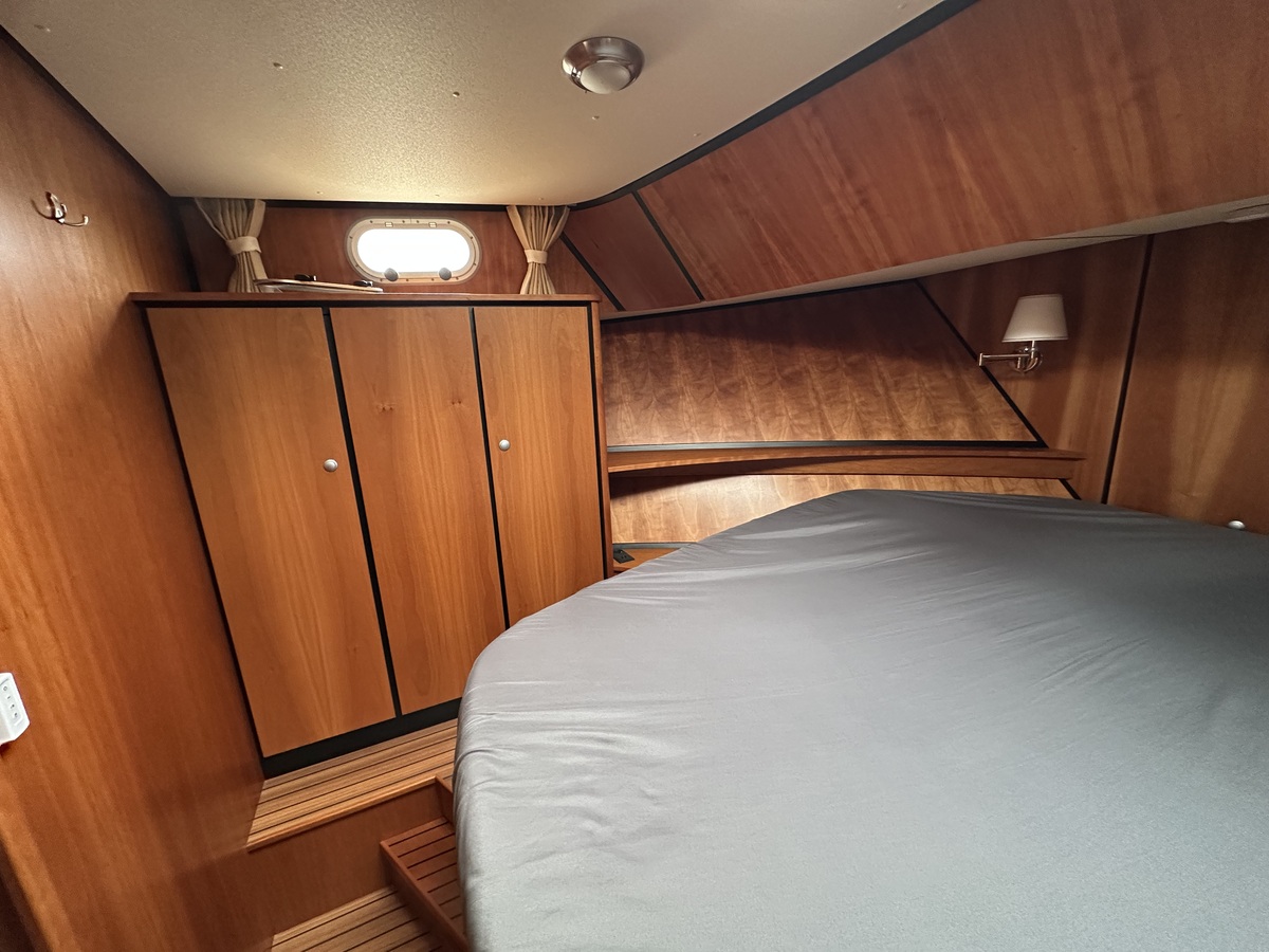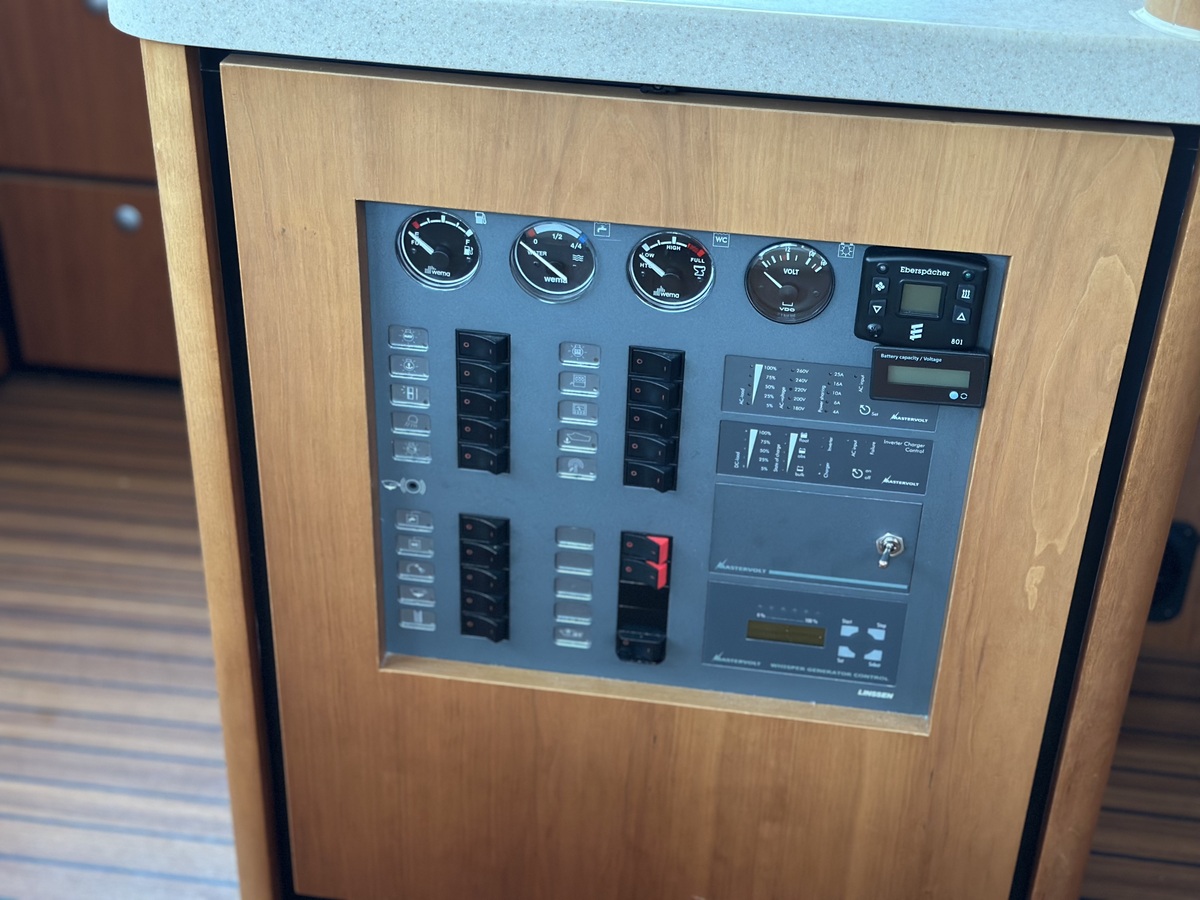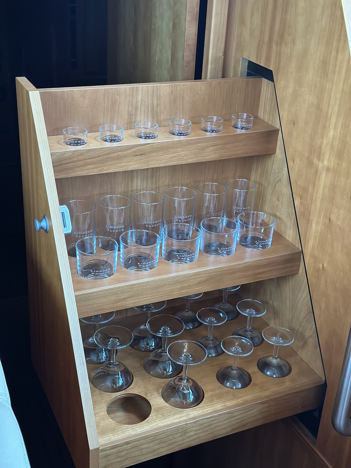 Dometic Crusair . in de salon en eigenaars hut Kwh Naast de vele opbergruimte is in de salon een uitschuifbare barkast met selectie Linssen glazen