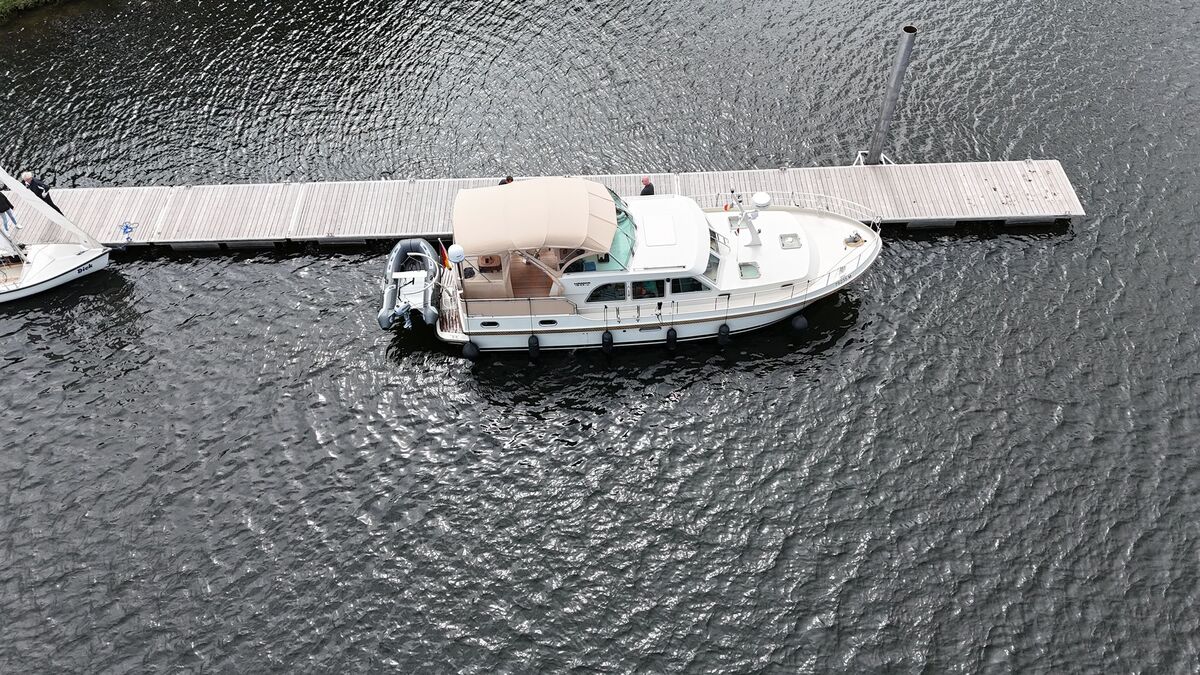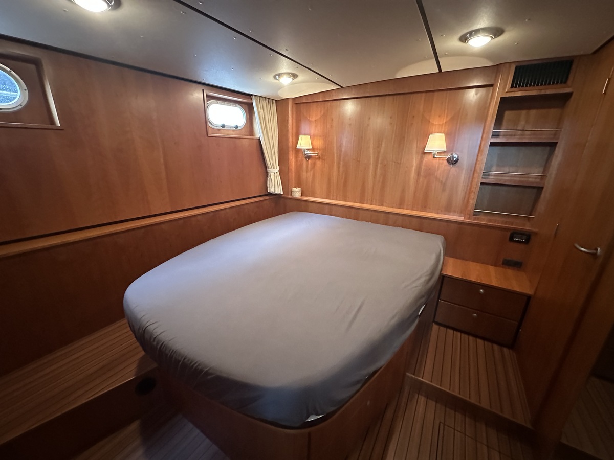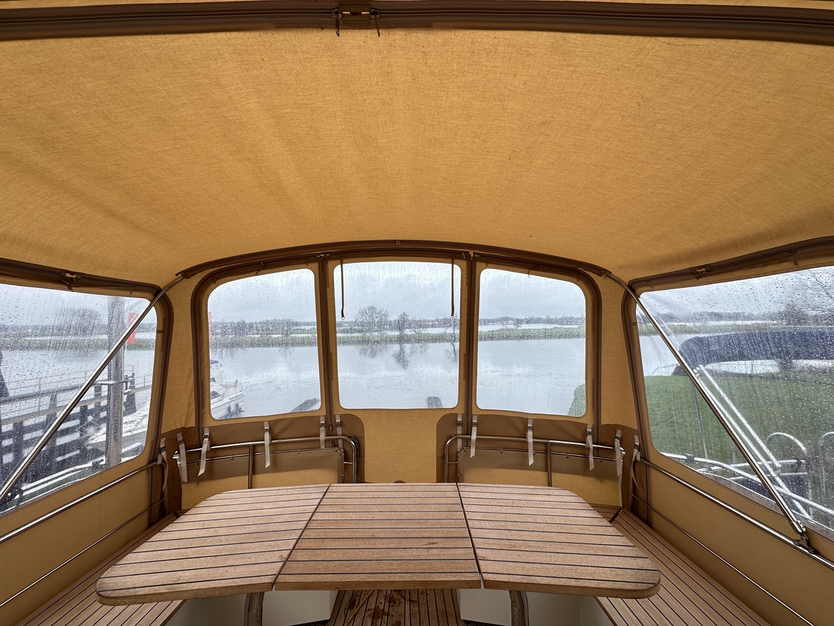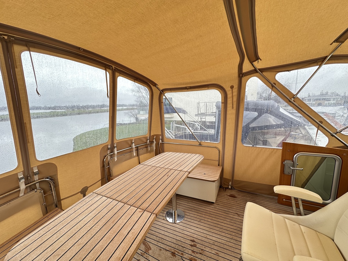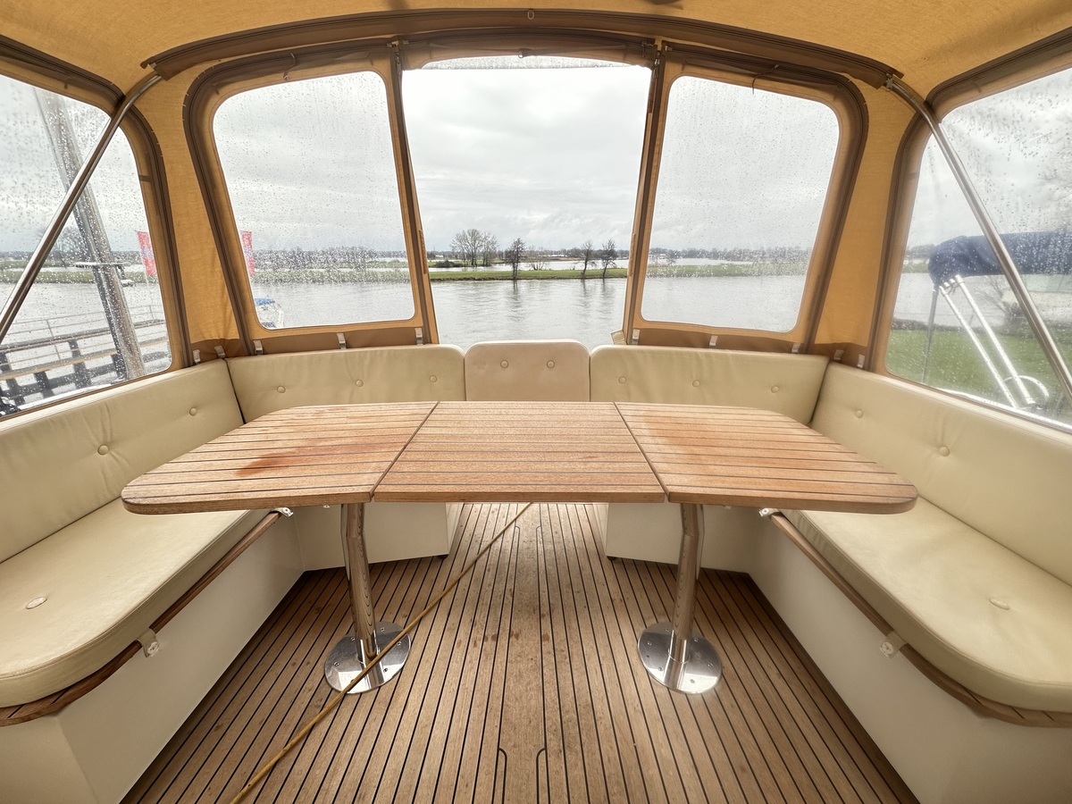 Teakdek op de achterkajuit, gangboorden zijn in antislip uitgevoerd.