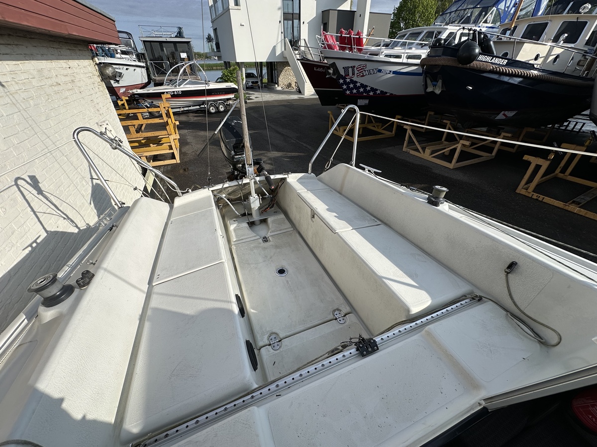 Kajuit met twee zitbanken, koektoestel, toilet en V bed in punt